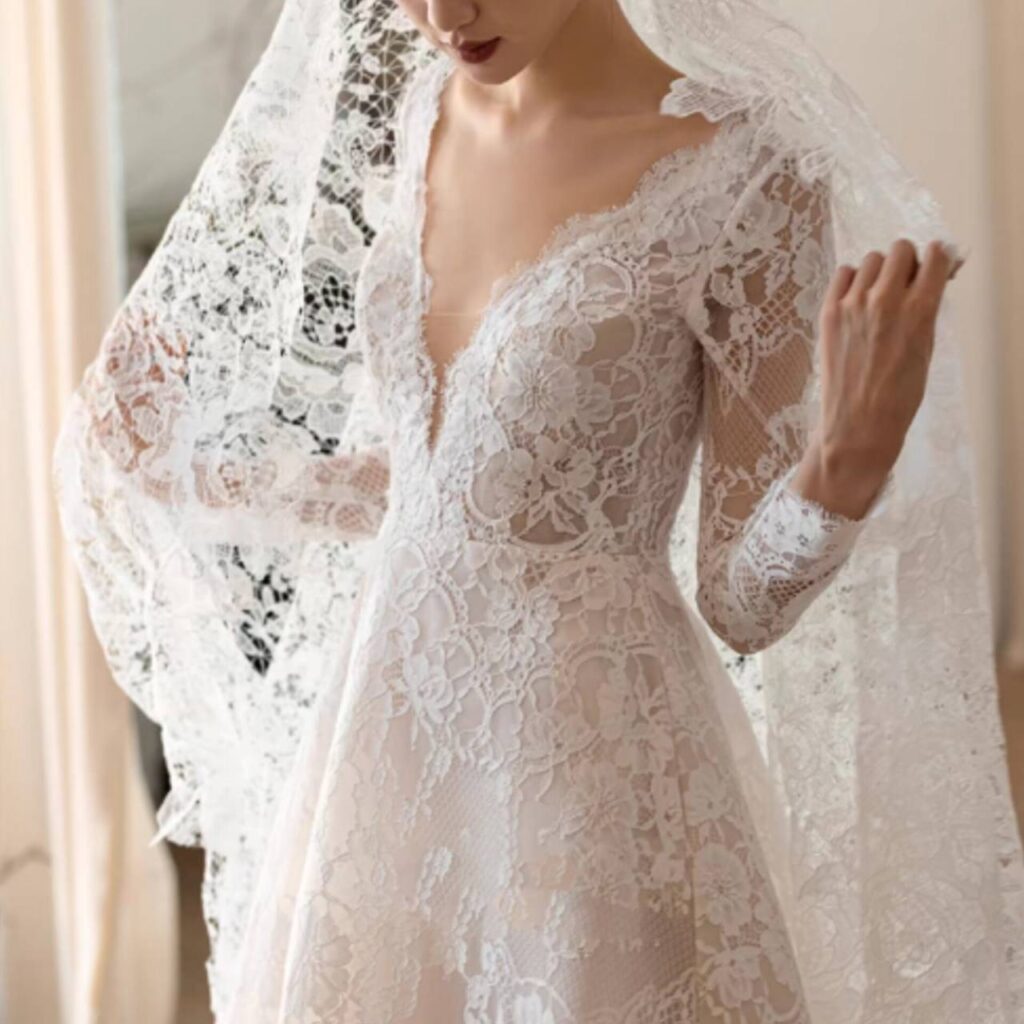 レースは、2026年のブライダルトレンドの中心的存在。伝統的なモチーフを現代的にアレンジしたレースドレスは、控えめながらも印象的な雰囲気を醸し出します。バラや植物を連想させるボタニカル柄や、フランスレースの繊細な編み目は、大人の女性らしさと上品さを演出。透け感のあるスリーブやバックスタイルにレースを配し、肌の透け感と装飾のコントラストが楽しめます。