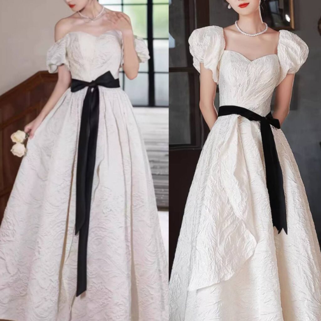 装飾を抑えたオフショル×ハイウエストAライン。色はホワイト/ブラック展開で、花嫁や結婚式の世界観に合わせて選べます。