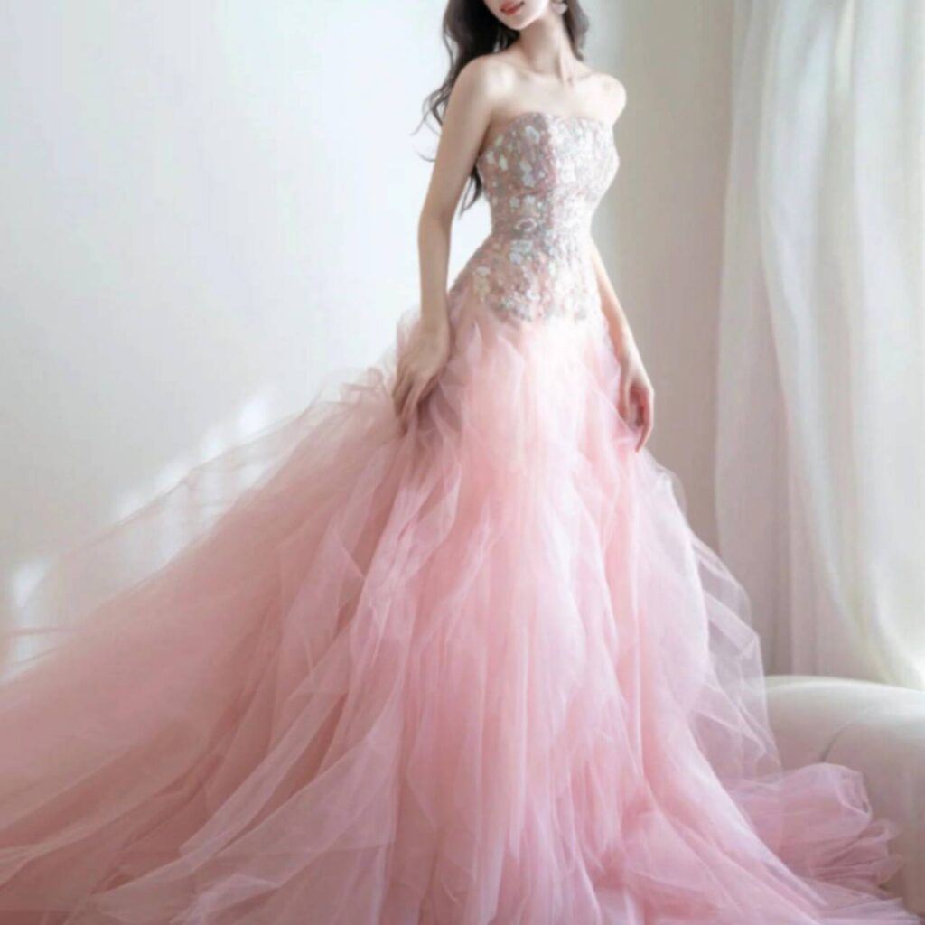 パステル系の淡いグレーが優しい印象を与え、結婚式の二次会や特別なディナーにもぴったり。着るだけで気分が上がる自信の一着で、まるで映画のワンシーンのような優雅な雰囲気をまとえます。