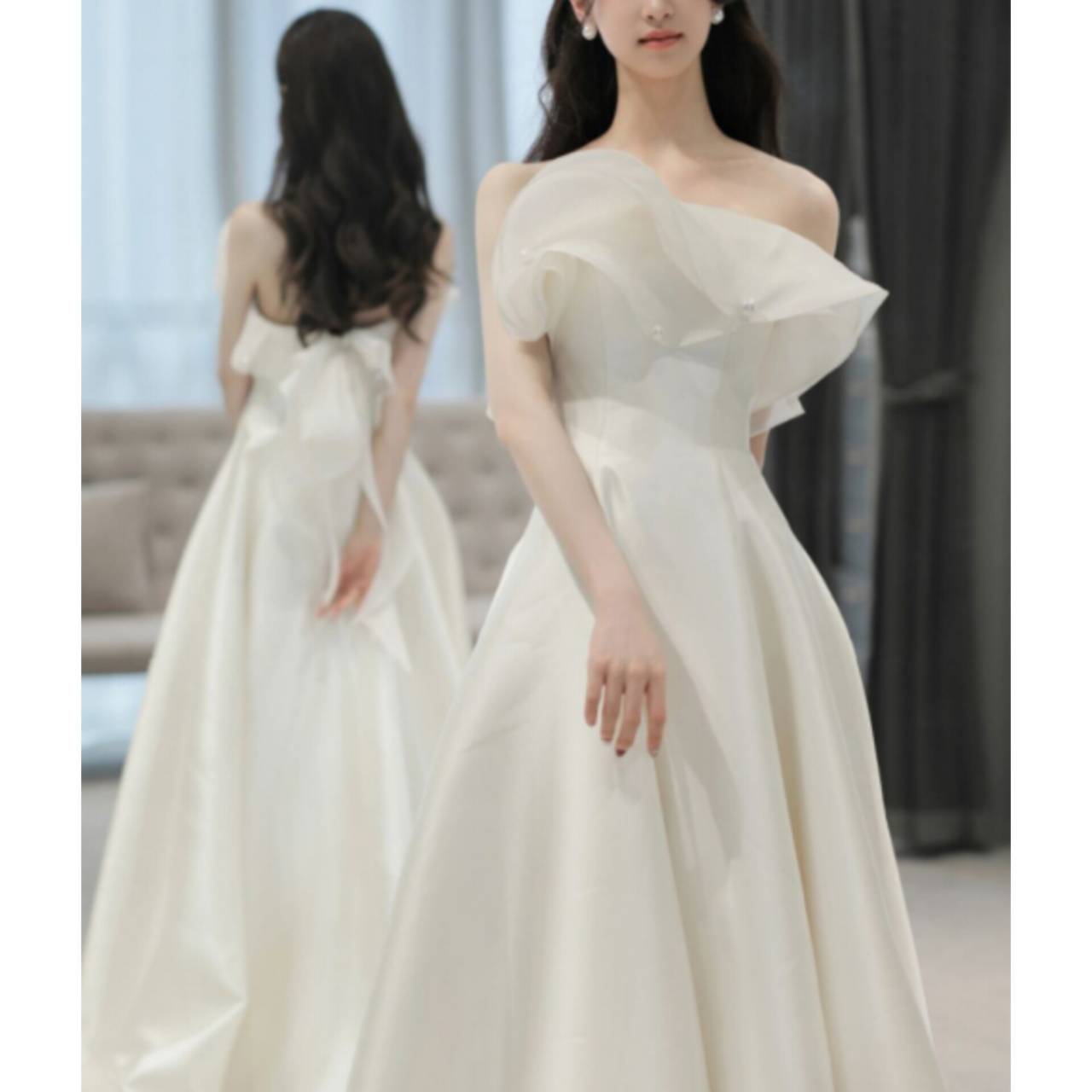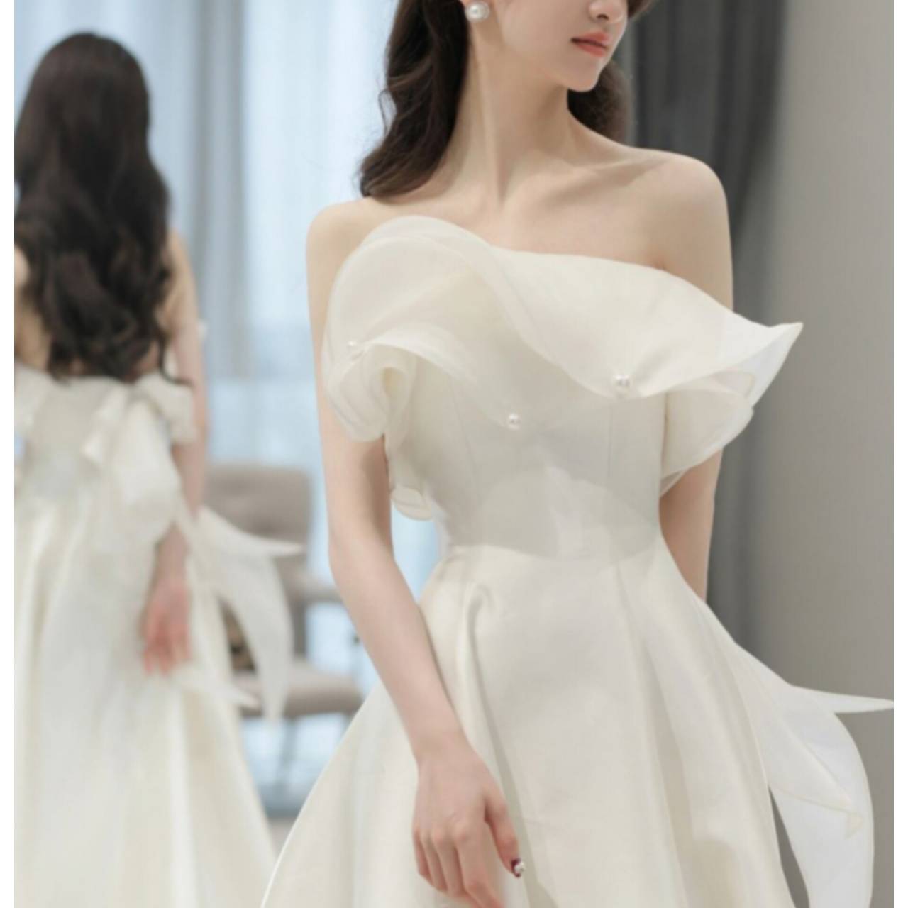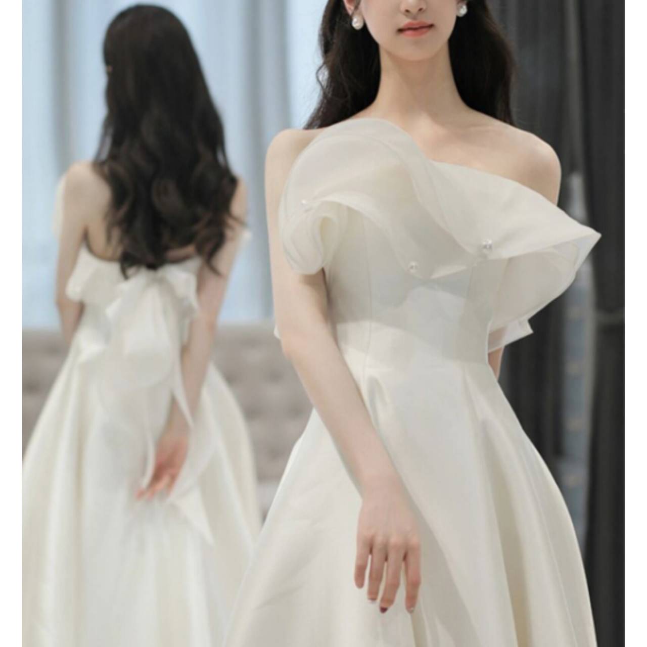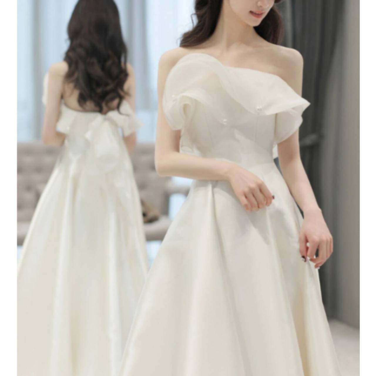 スカートは広がりすぎないAラインで、動くたびに美しく揺れ、写真映えも抜群です。背中には存在感のあるバックリボン&フリル装飾を施し、後ろ姿まで計算されたデザイン。