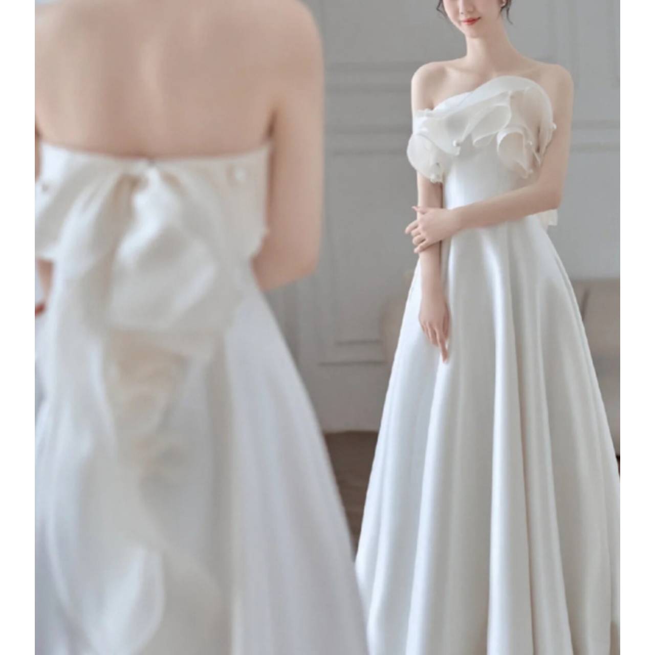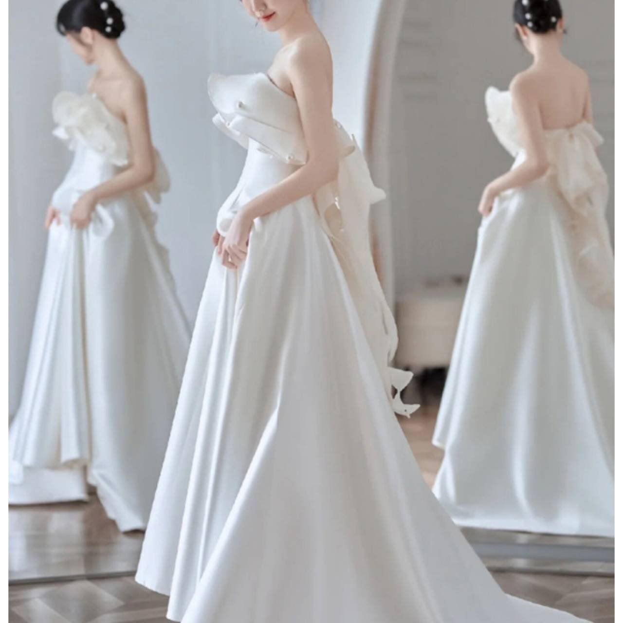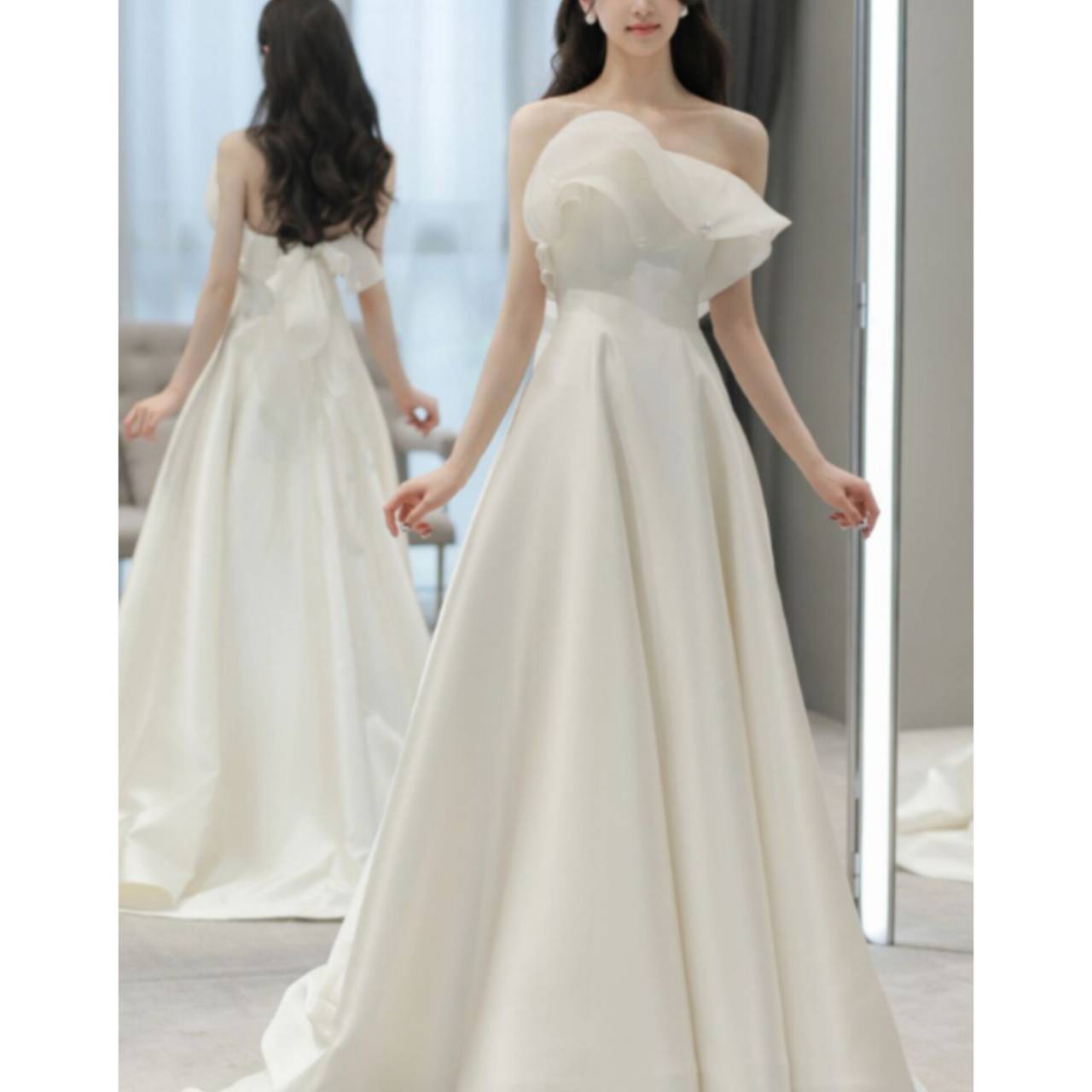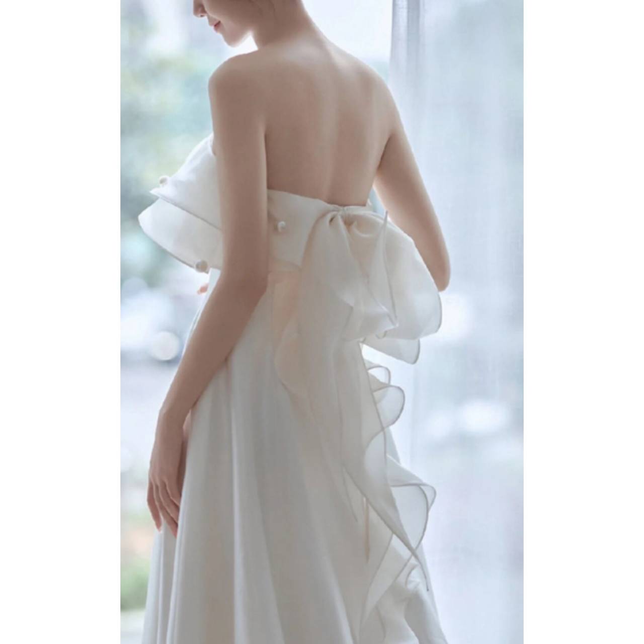 立体フリルが主役のウェディングドレス上質なソフトオーガンジー×なめらかなサテン調素材を贅沢に使用した、洗練された一着。