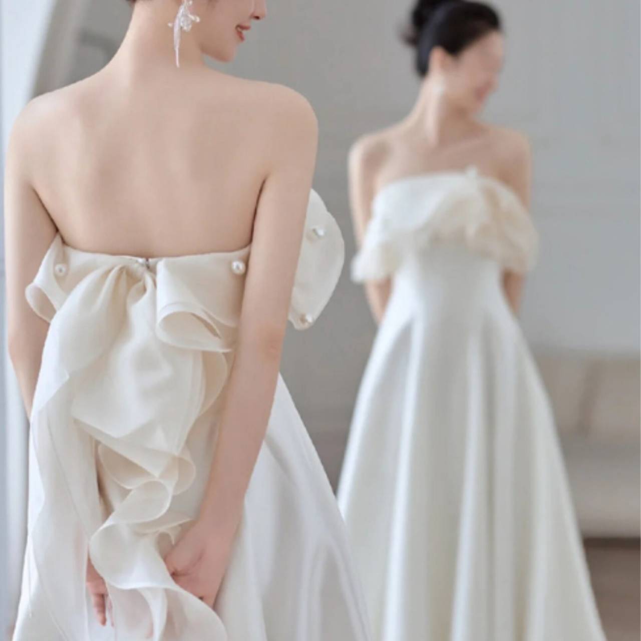 甘すぎず、媚びすぎない絶妙なデザインは、大人花嫁にも選ばれる理由。挙式はもちろん、二次会・前撮り・フォトウェディングでも、“あのドレス素敵だった”と必ず言われる存在感を放ちます。
