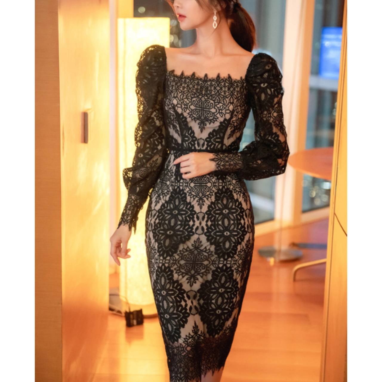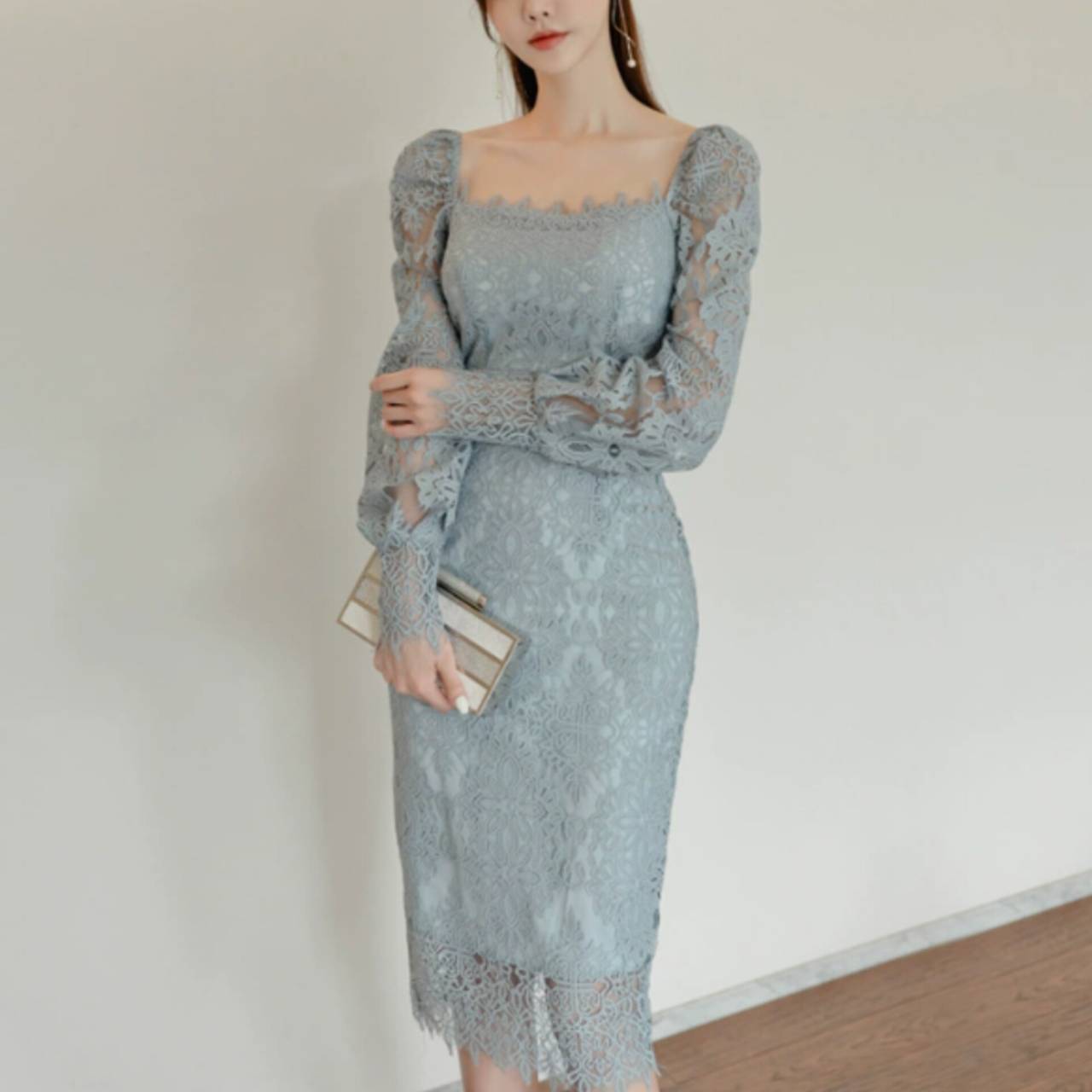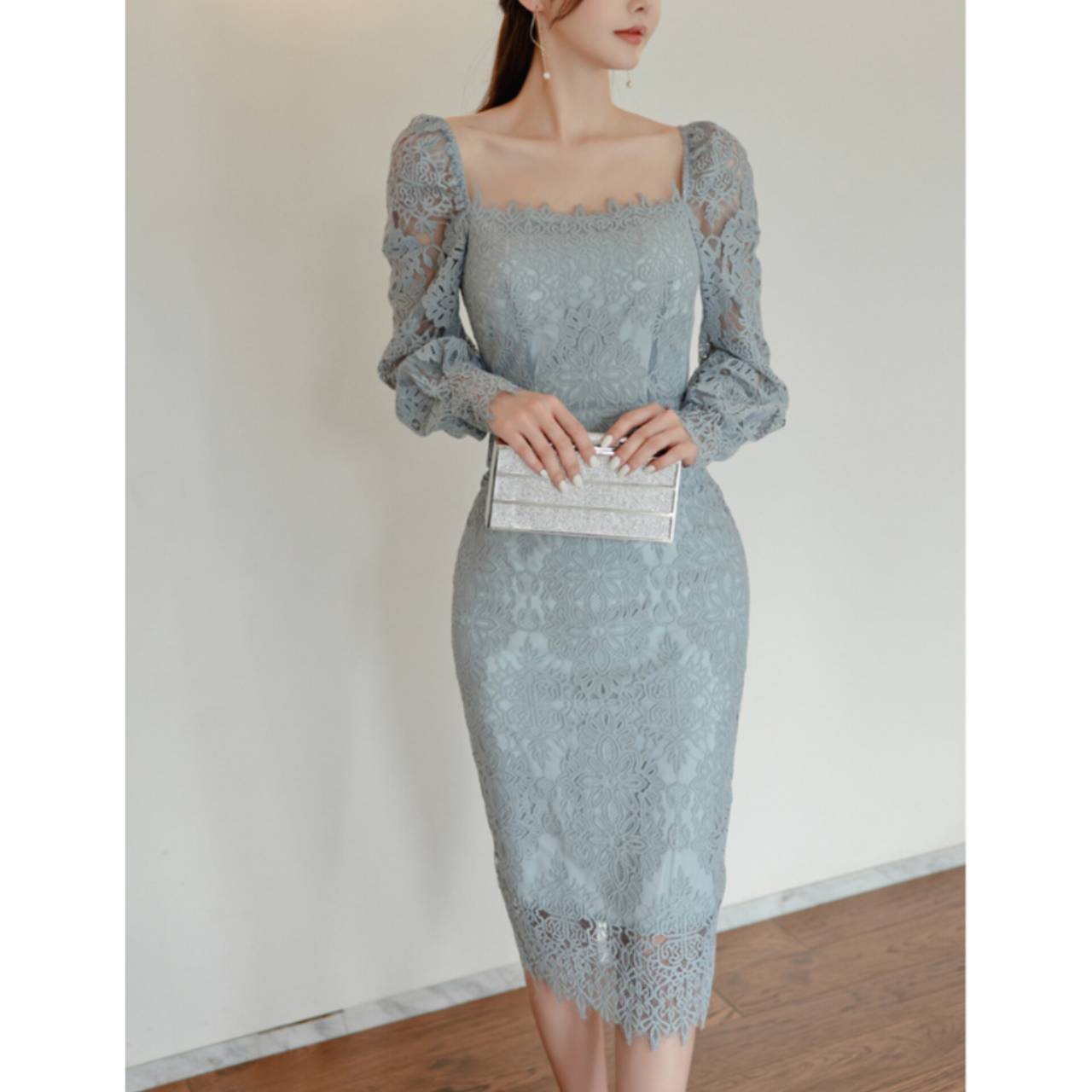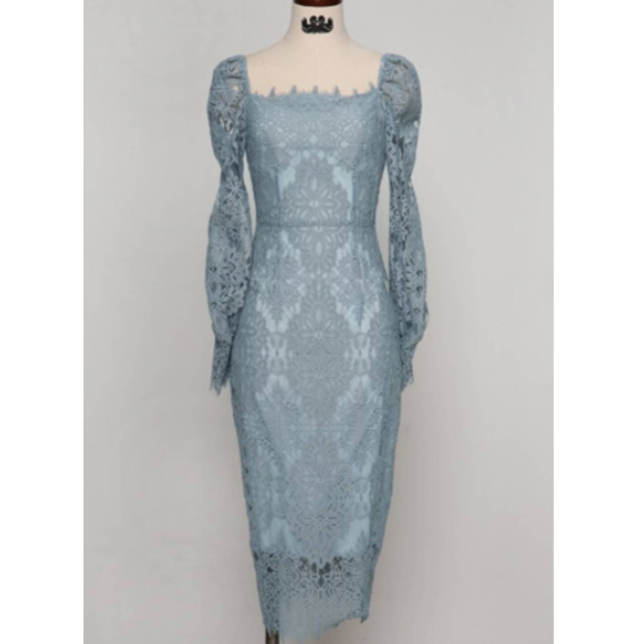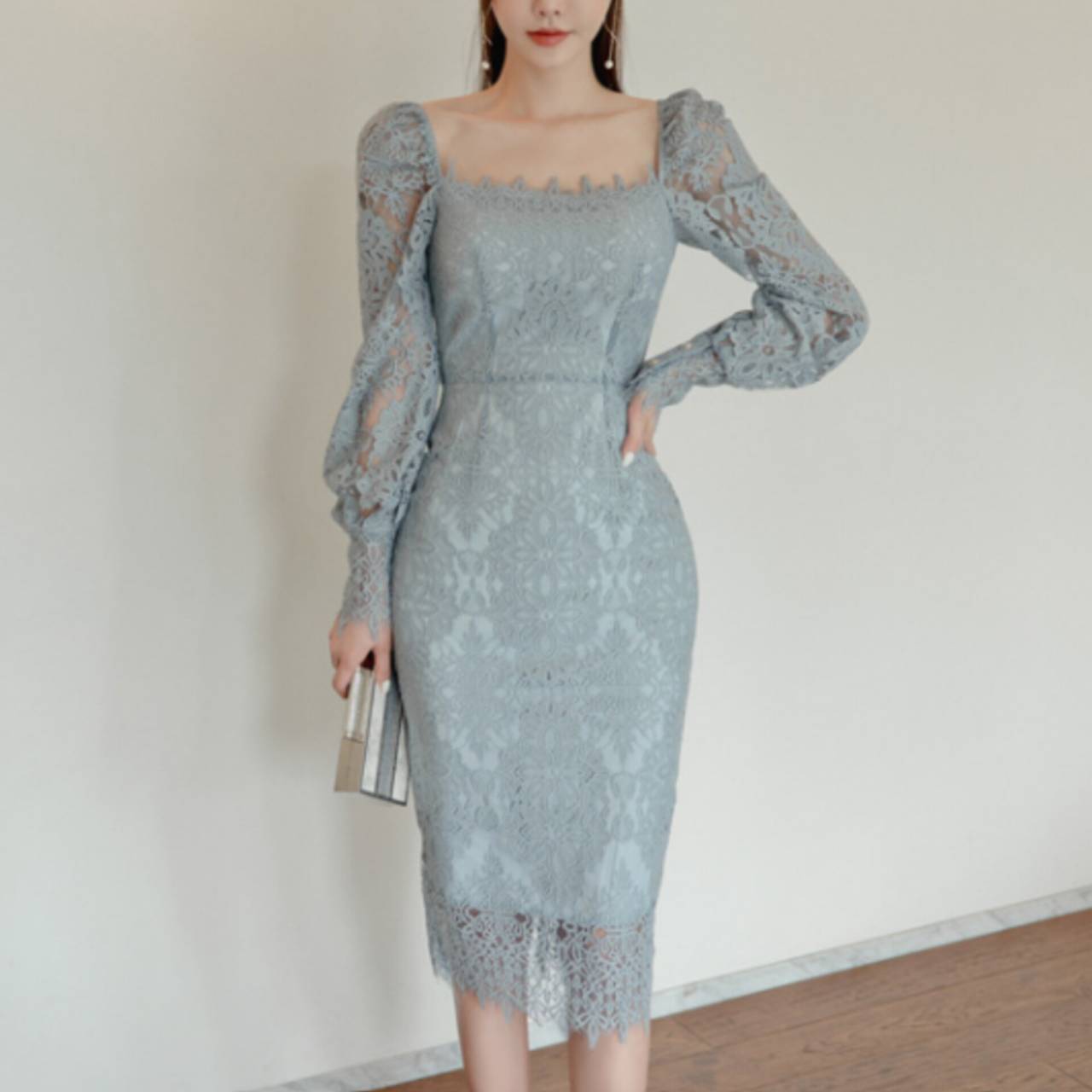 全2色 ドレス 韓国ドレス オールレース 総レース 長袖 パフスリーブ ぽわん袖 スクエアネック パワーショルダー パワショル ハイウエスト ミモレ丈 タイト バックスリット シアー お花 花柄 美シルエット 華奢見え 清楚 エレガント S/XL 韓国【K9263】