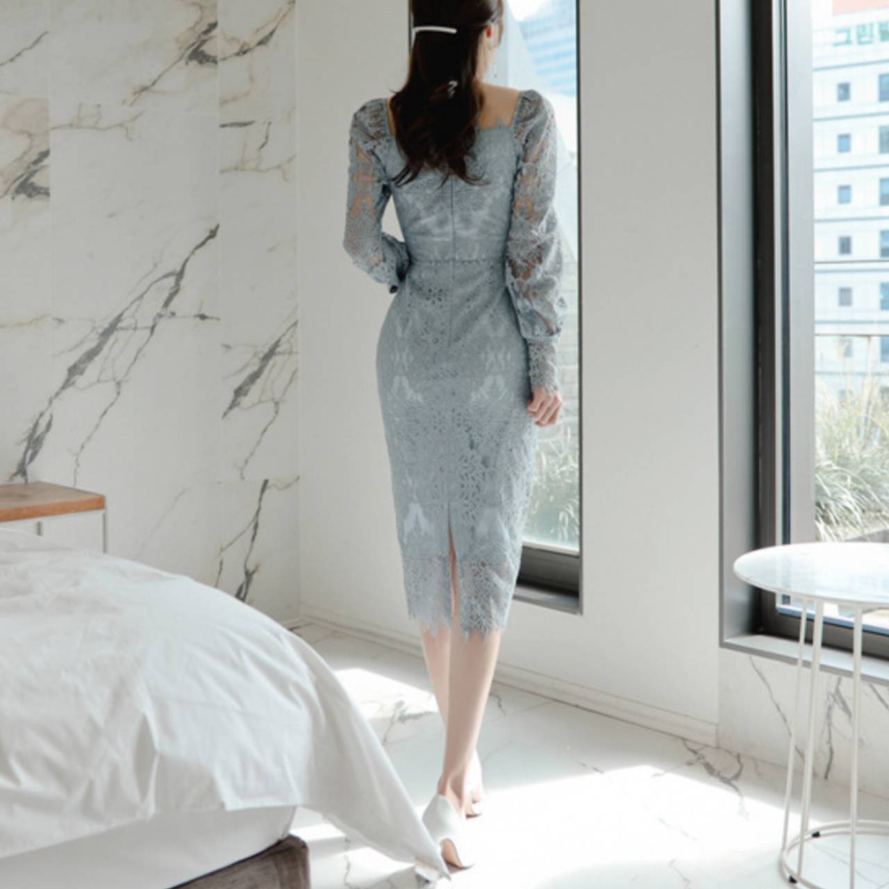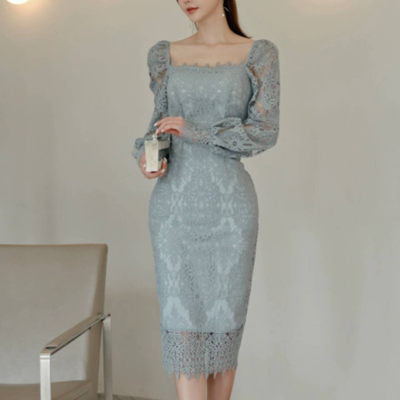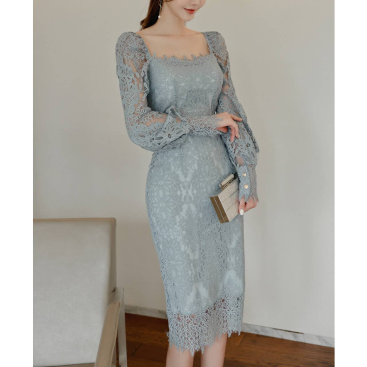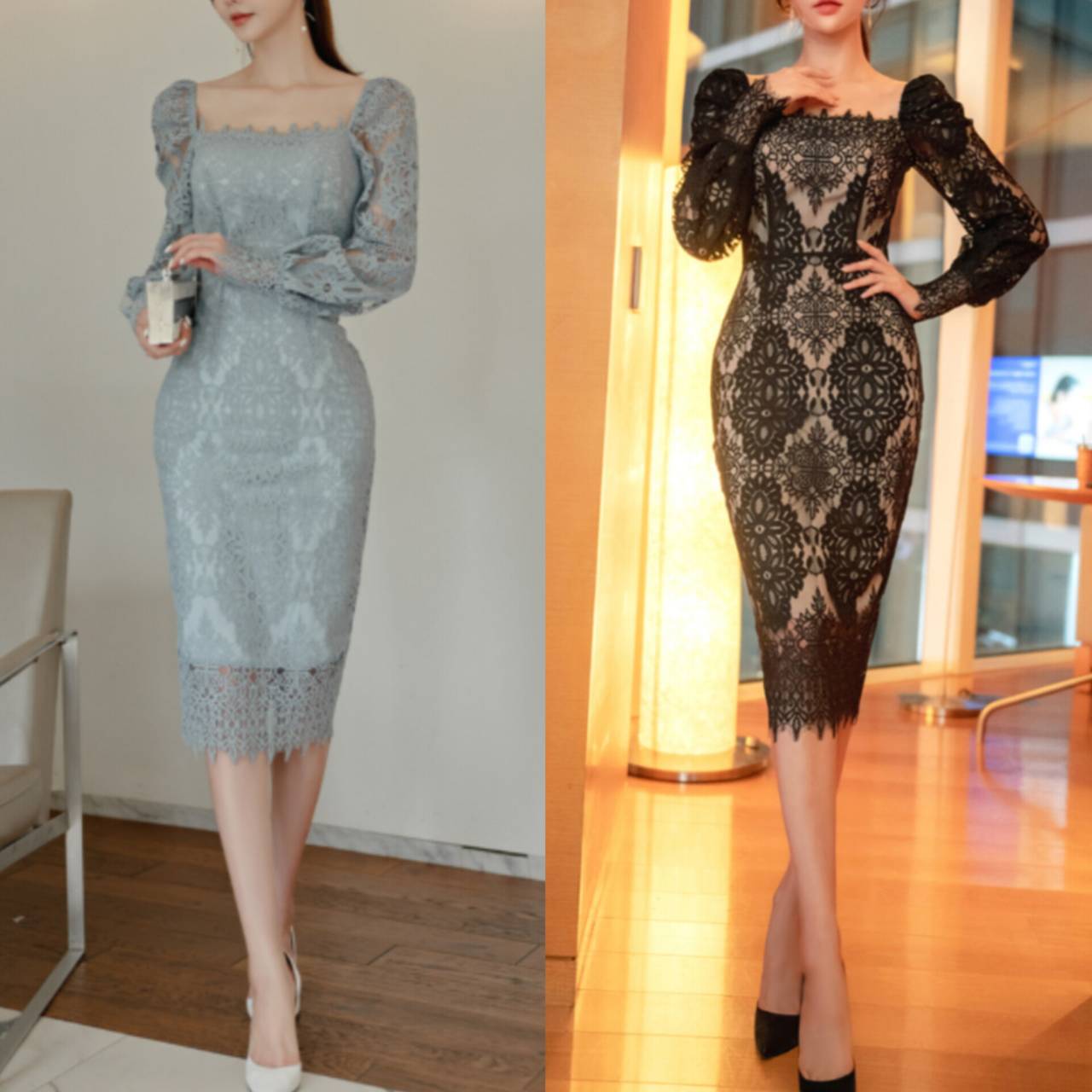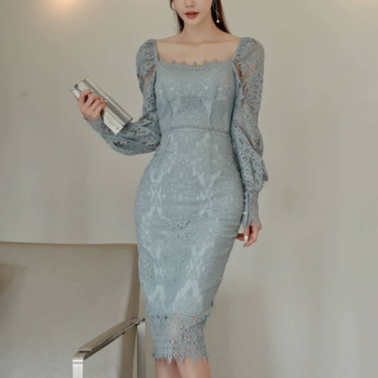 全2色 ドレス 韓国ドレス オールレース 総レース 長袖 パフスリーブ ぽわん袖 スクエアネック パワーショルダー パワショル ハイウエスト ミモレ丈 タイト バックスリット シアー お花 花柄 美シルエット 華奢見え 清楚 エレガント S/XL 韓国【K9263】