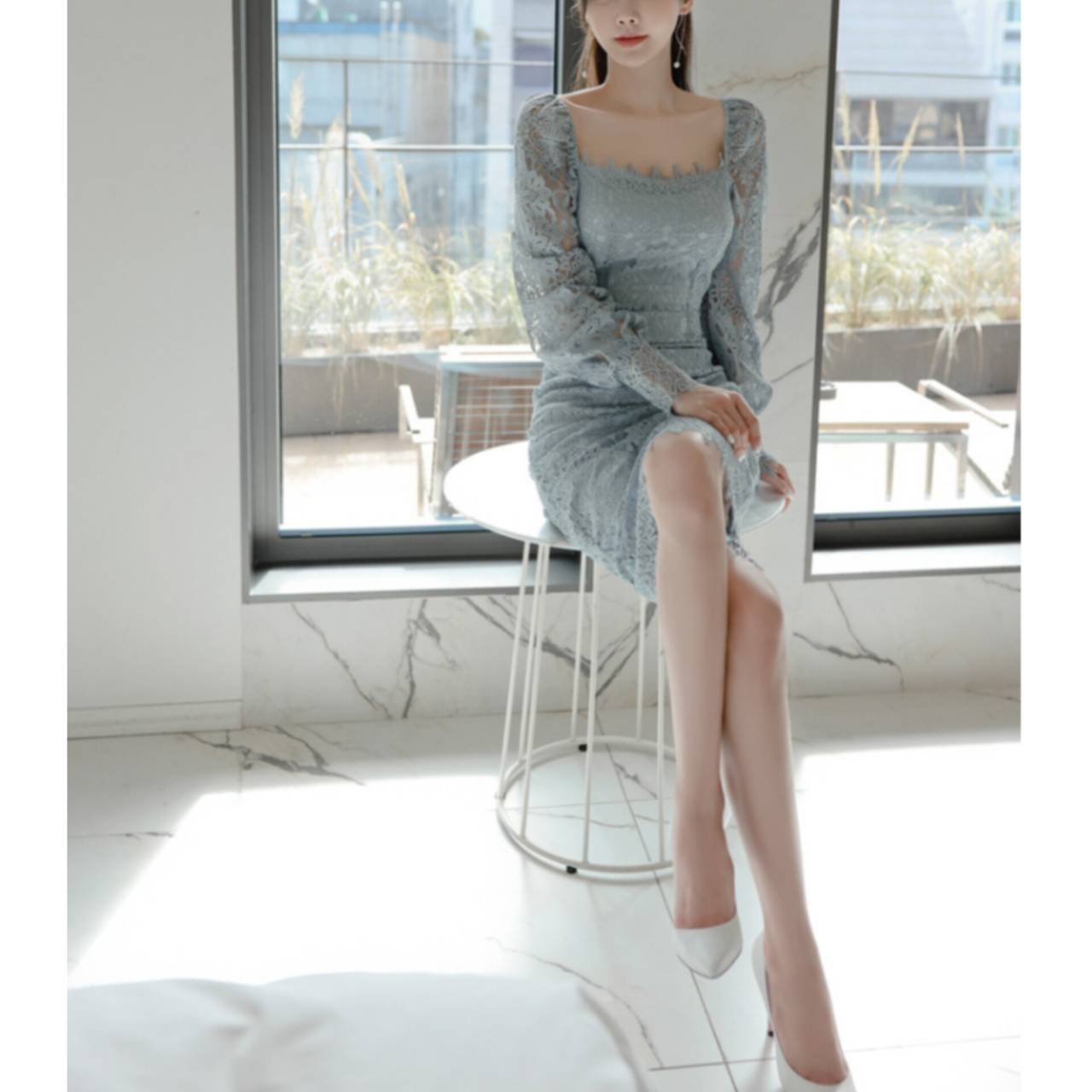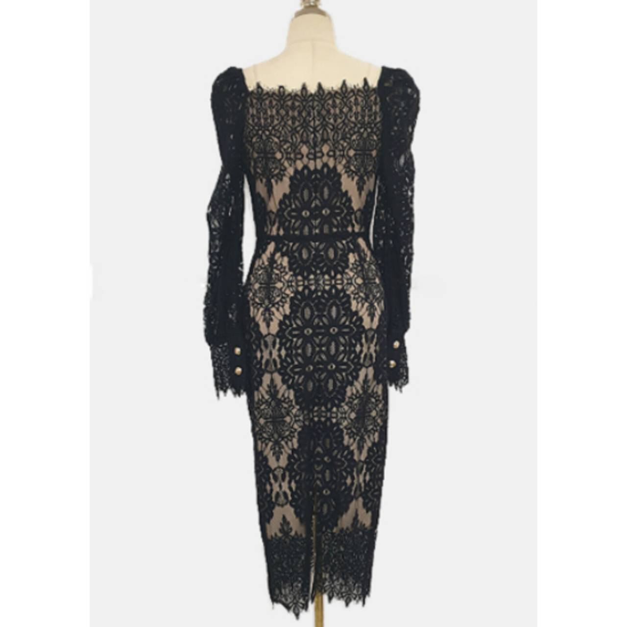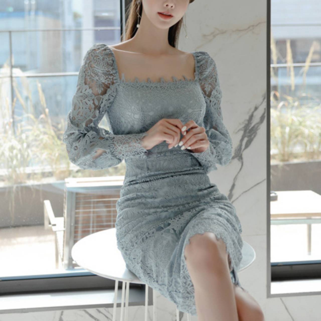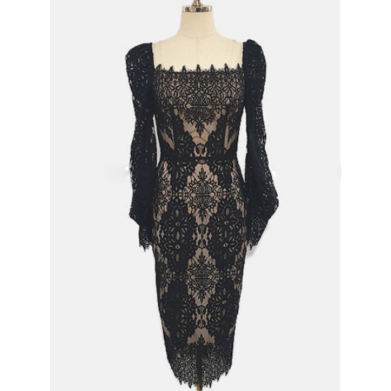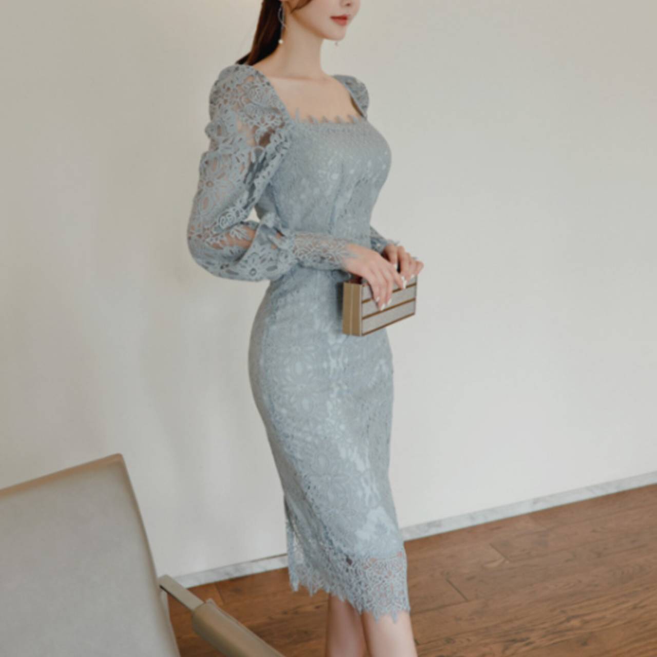 全2色 ドレス 韓国ドレス オールレース 総レース 長袖 パフスリーブ ぽわん袖 スクエアネック パワーショルダー パワショル ハイウエスト ミモレ丈 タイト バックスリット シアー お花 花柄 美シルエット 華奢見え 清楚 エレガント S/XL 韓国【K9263】