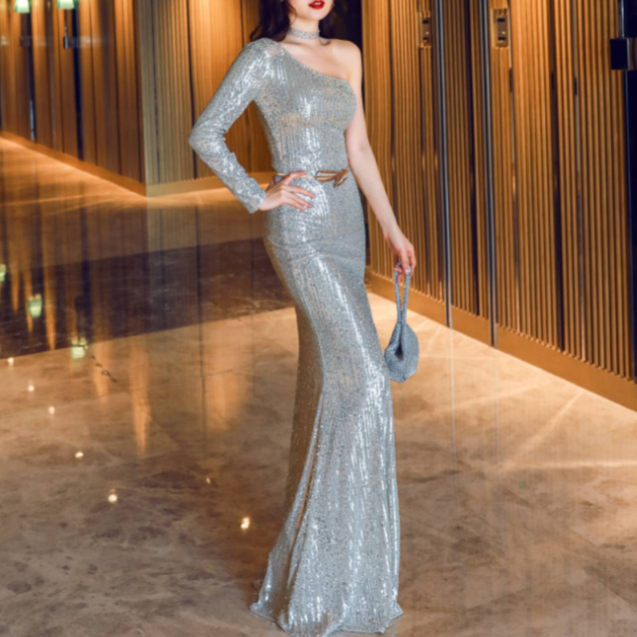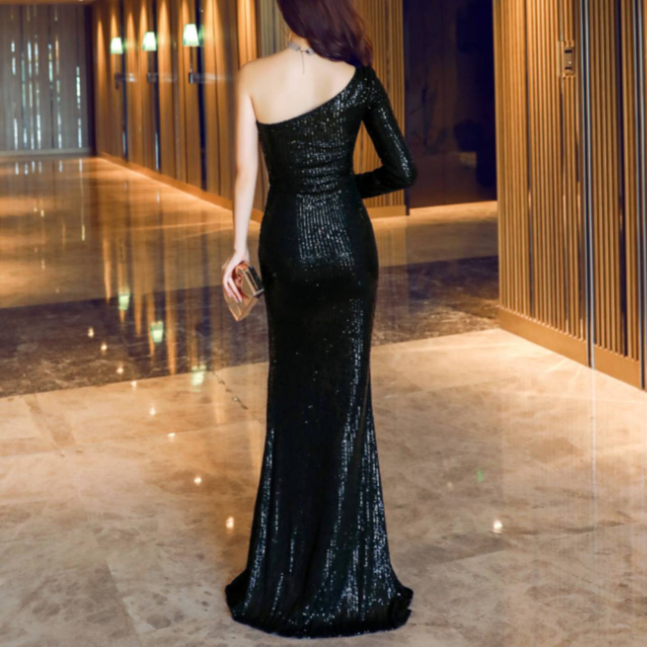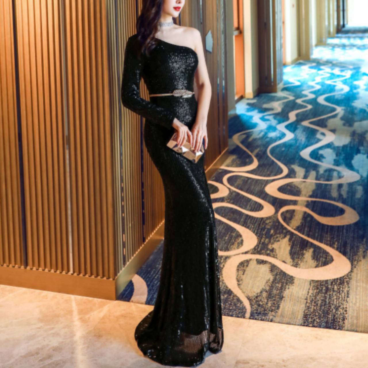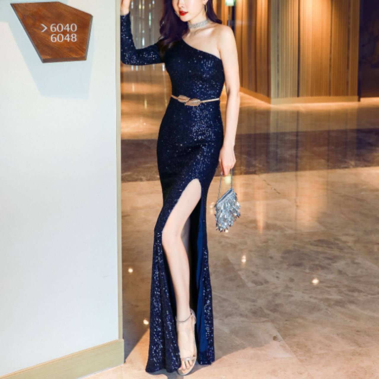 全6色 ドレス イブニングドレス 韓国ドレス ワンショルダー ワンショル キラキラ スパンコール 長袖 ハイウエスト マーメイド ハイスリット フロントスリット ロング グリッター アシンメトリー 美脚効果 美シルエット S/2XL 韓国【K6539】