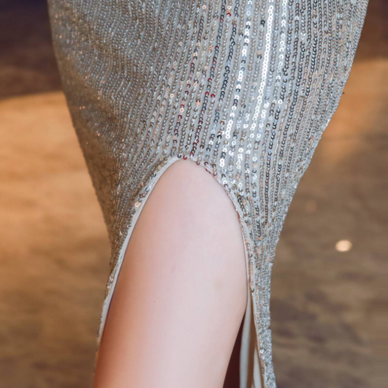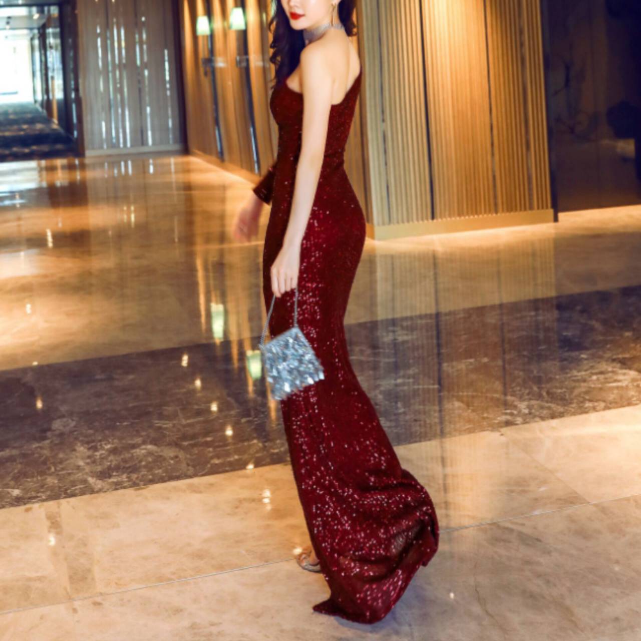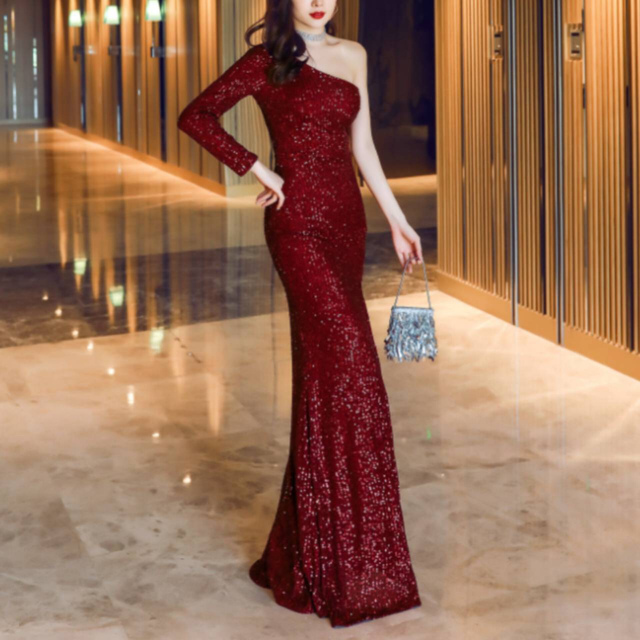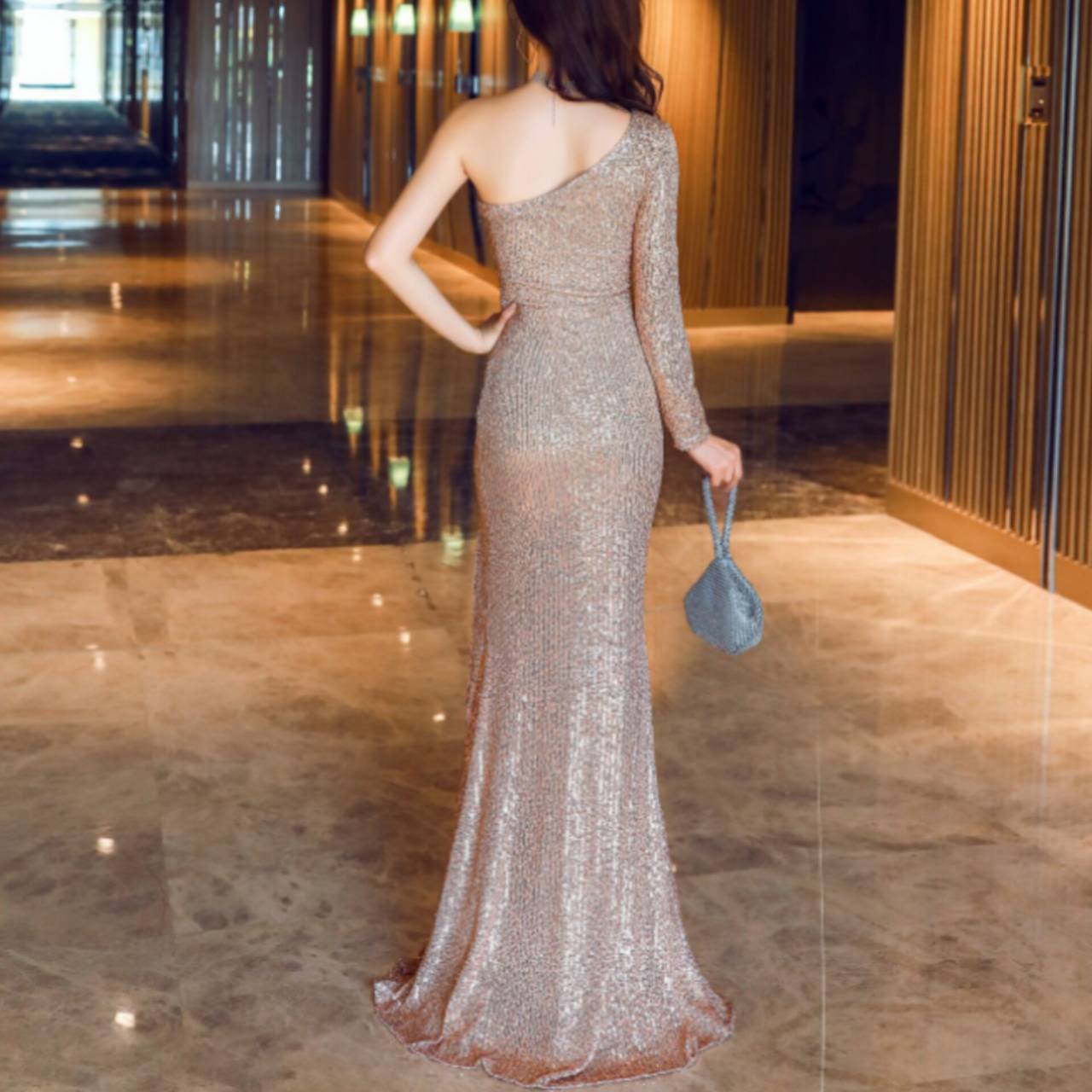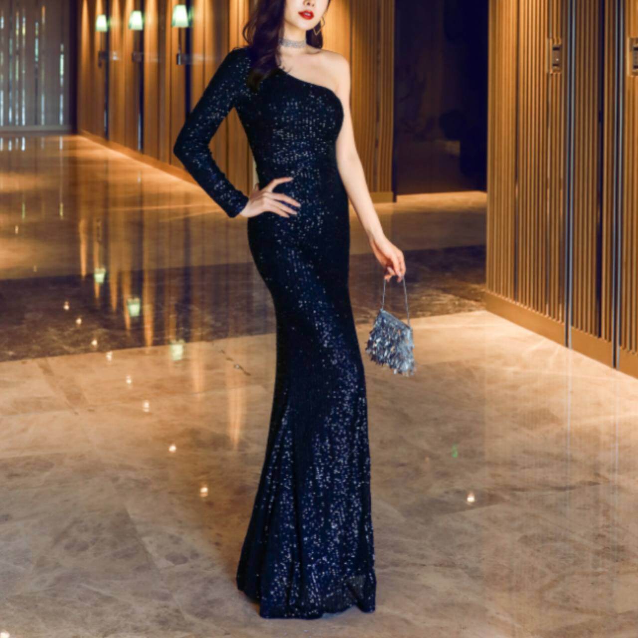 全6色 ドレス イブニングドレス 韓国ドレス ワンショルダー ワンショル キラキラ スパンコール 長袖 ハイウエスト マーメイド ハイスリット フロントスリット ロング グリッター アシンメトリー 美脚効果 美シルエット S/2XL 韓国【K6539】