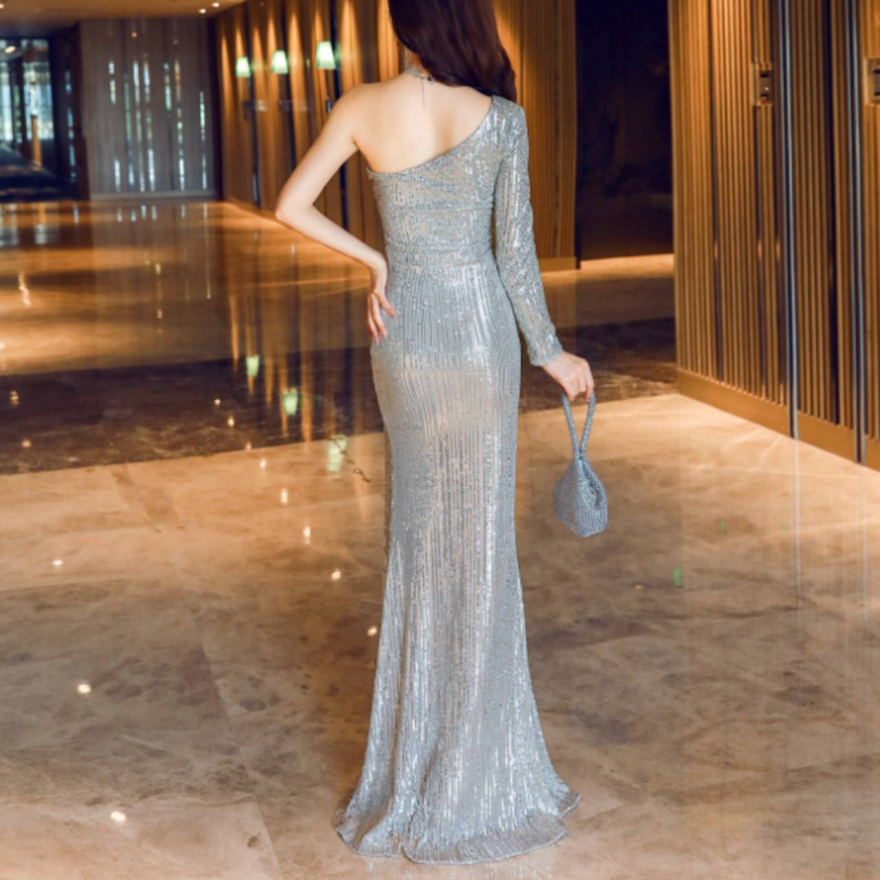 “魅せるために生まれた”圧倒的オーラのワンショルダードレス。上質なスパンコール素材を贅沢に使用し、歩くたびに光が流れるように輝くロングドレス。