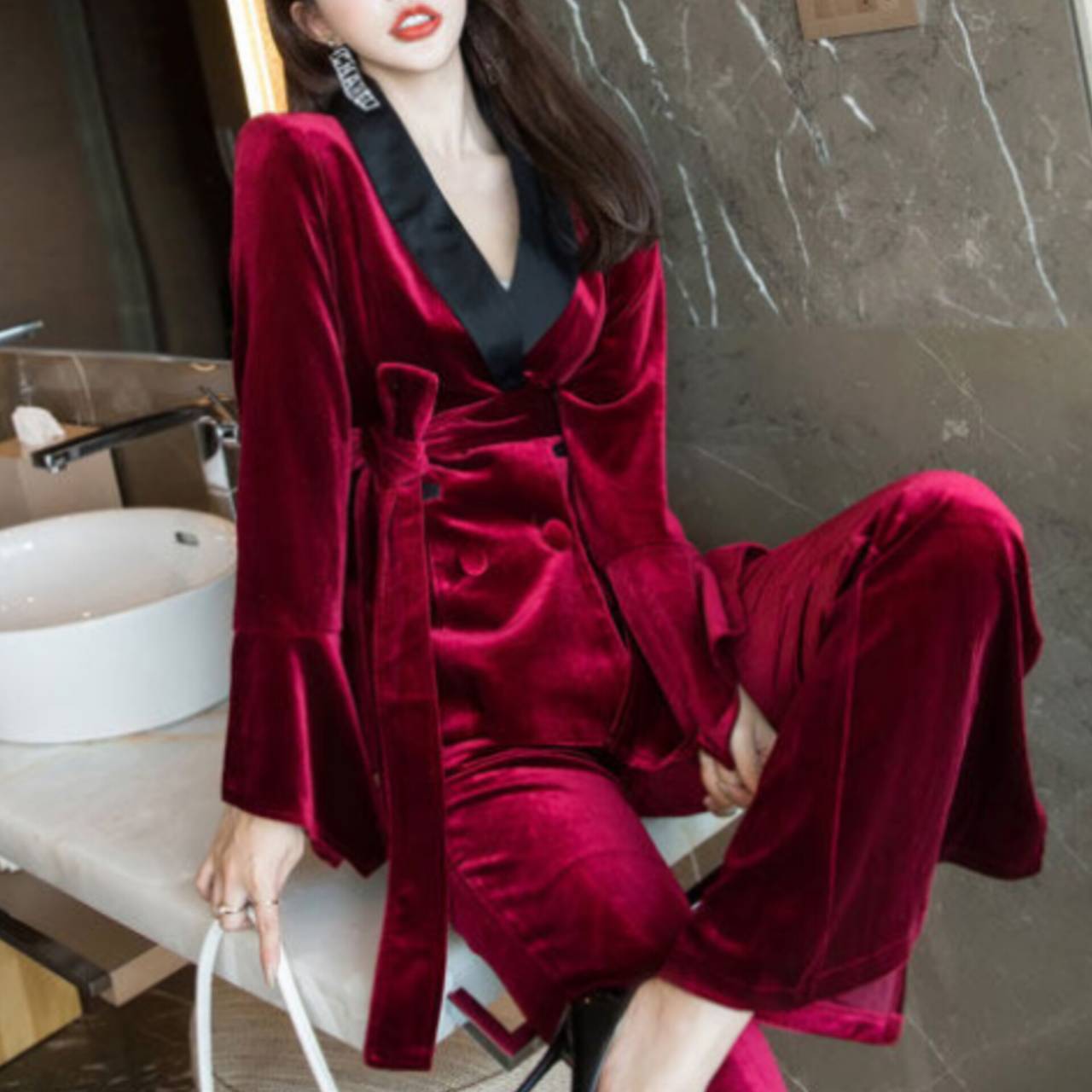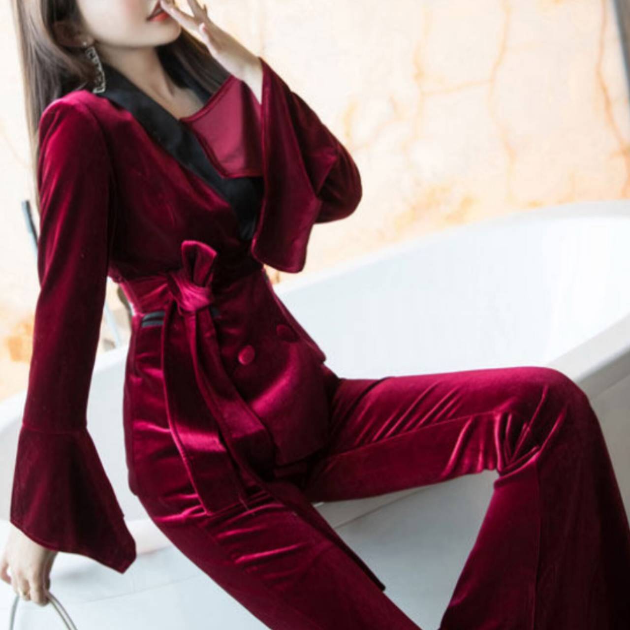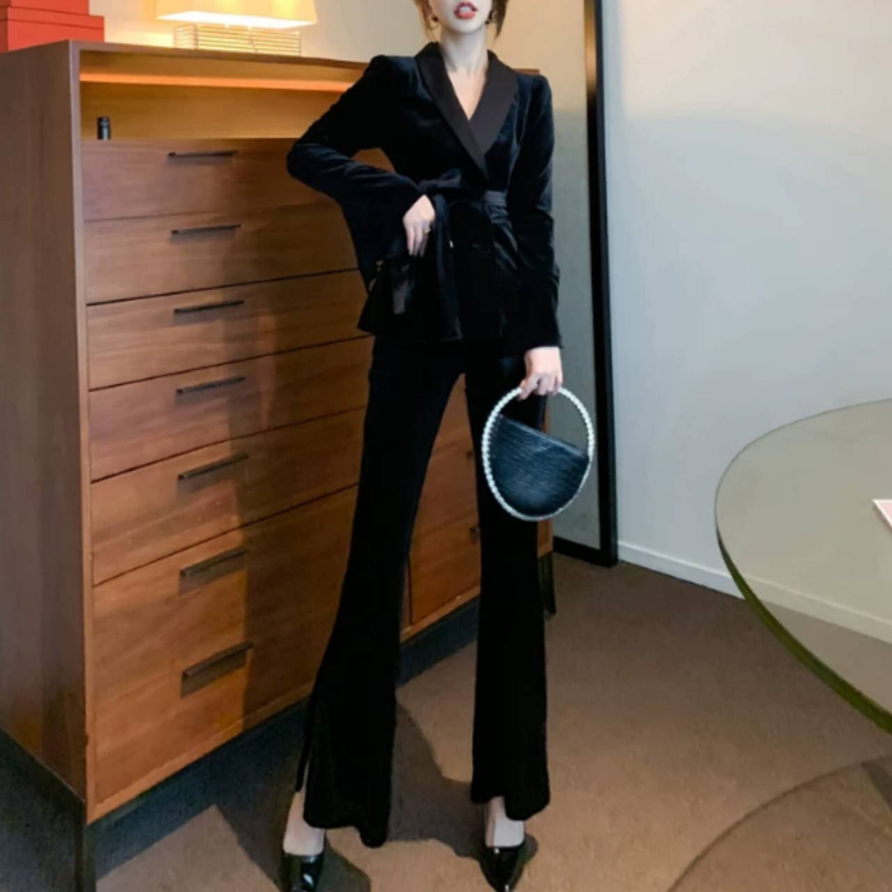 全2色 セットアップ パンツスーツ パンツドレス セットアップドレス ベルベット ジャケット テーラードジャケット 長袖 ロングスリーブ スリットスリーブ ベルスリーブ ウエストマーク ウエストリボン リボン ハイウエスト フレアパンツ ロング ワイドレッグ フレア スリットパンツ スリット 2ピース スタイルアップ 脚長効果 美脚効果 S/XL 韓国【B4932】