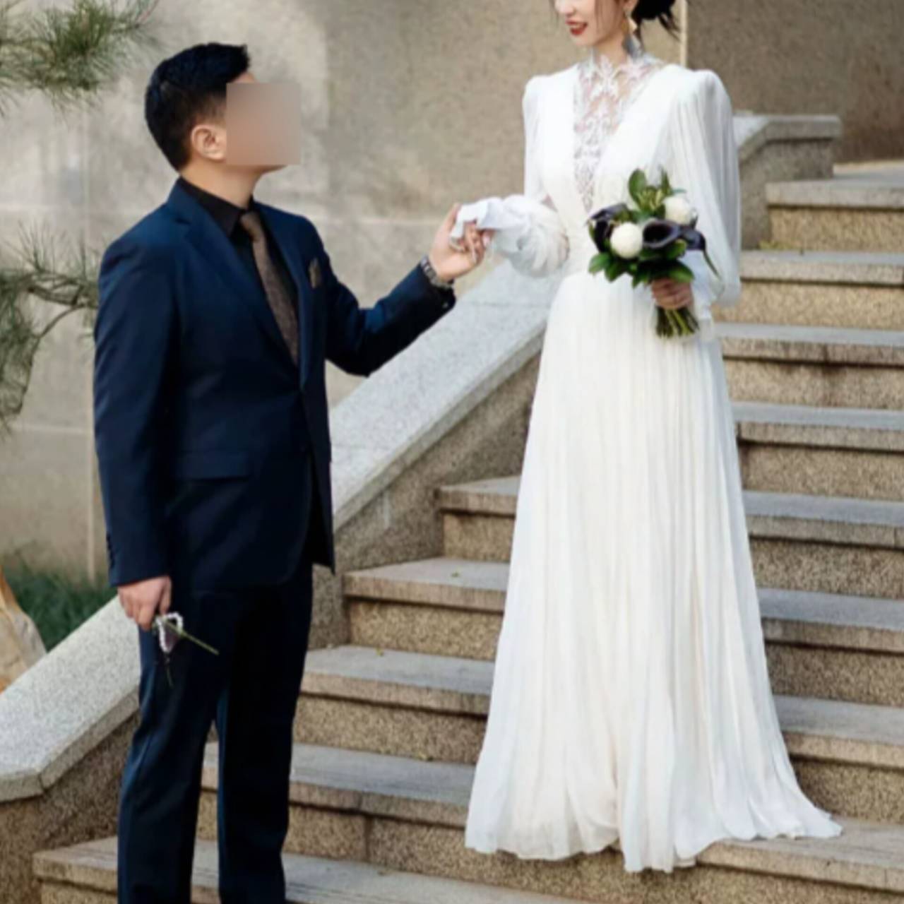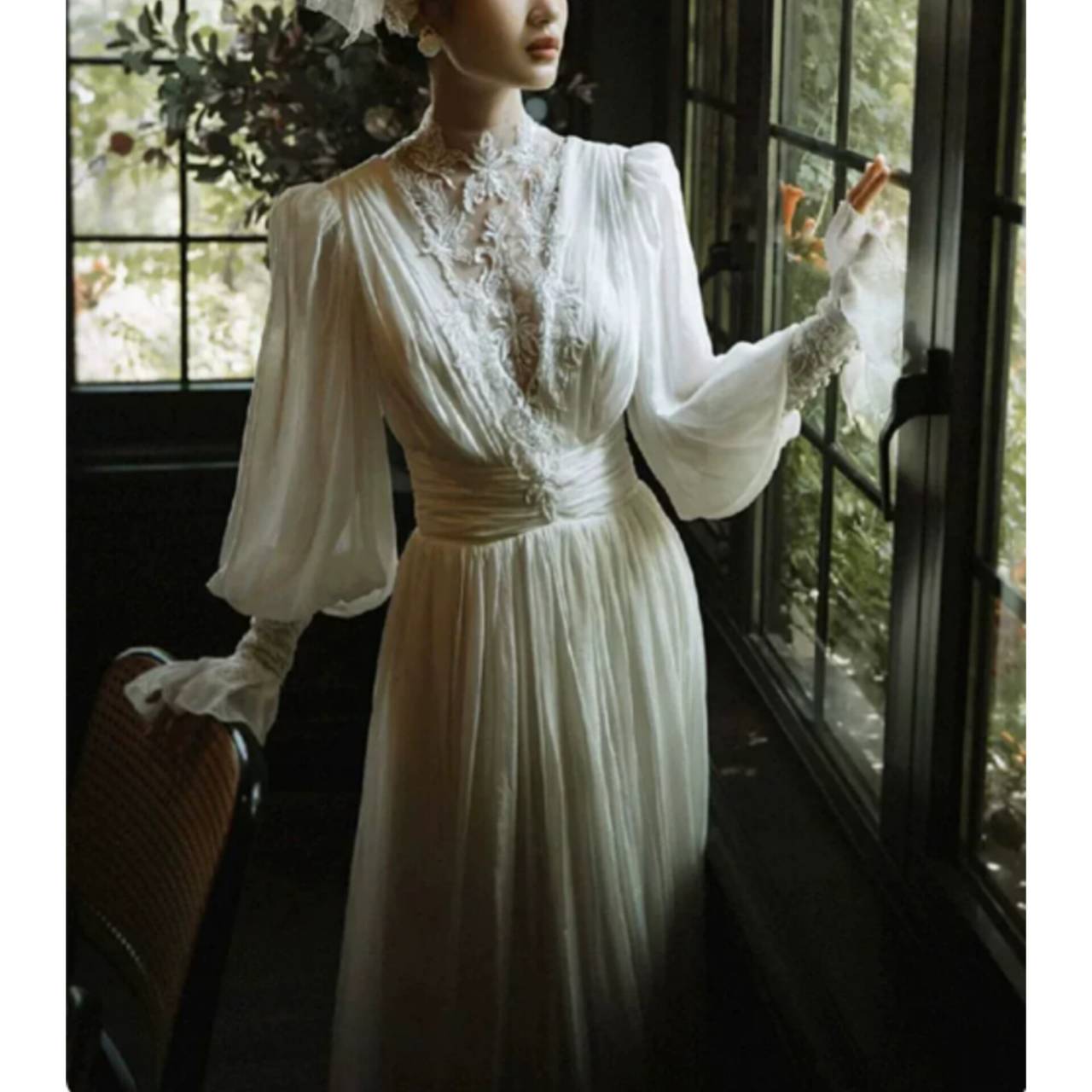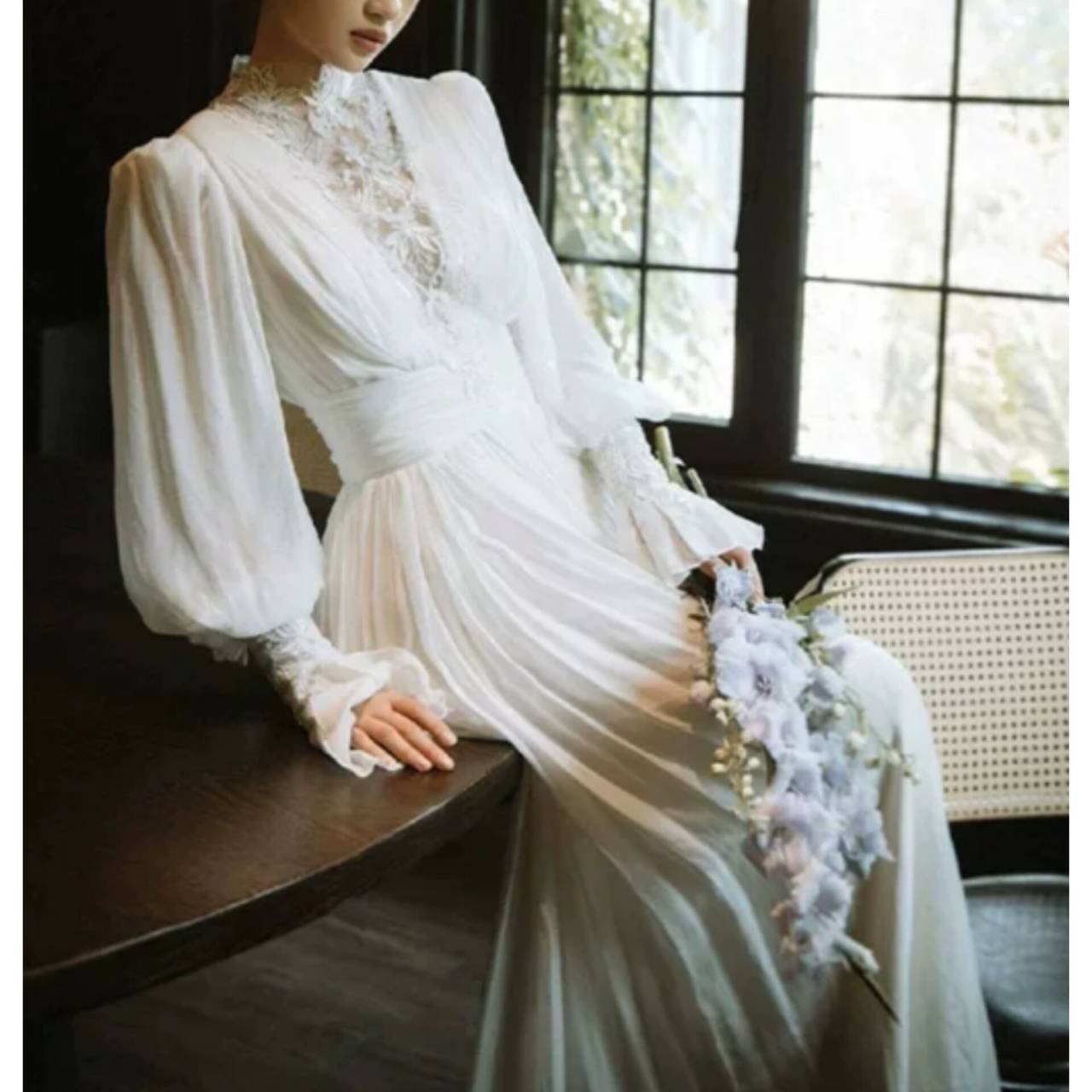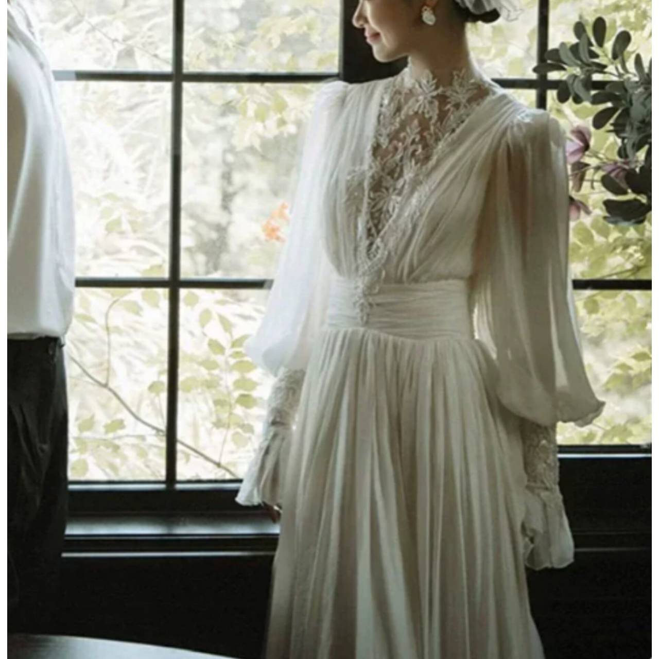 長袖 ウェディングドレス 韓国ドレス ハイネック レース シアー 刺繍 エレファントスリーブ パフスリーブ ボリューム袖 ぽわん袖 シフォン バックコンシャス バックシャン くるみボタン ハイウエスト ウエストマーク ドレープ プリーツ Aライン ロング クラシック エレガント 体型カバー S/2XL 韓国【K8920】