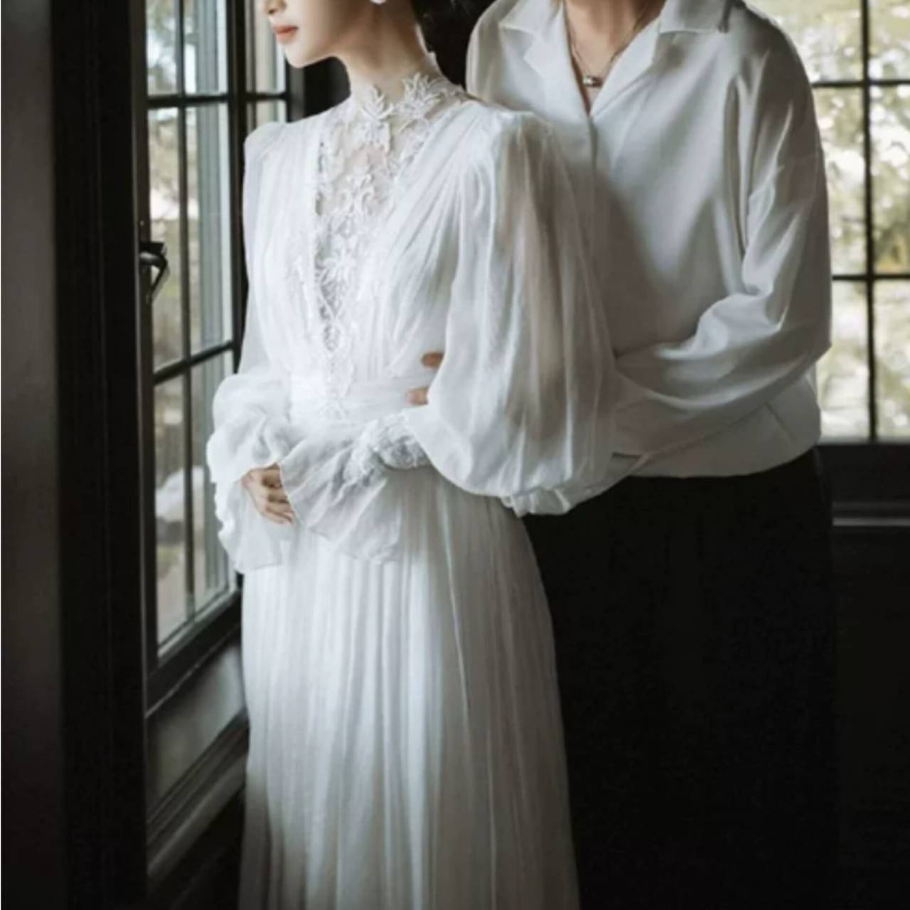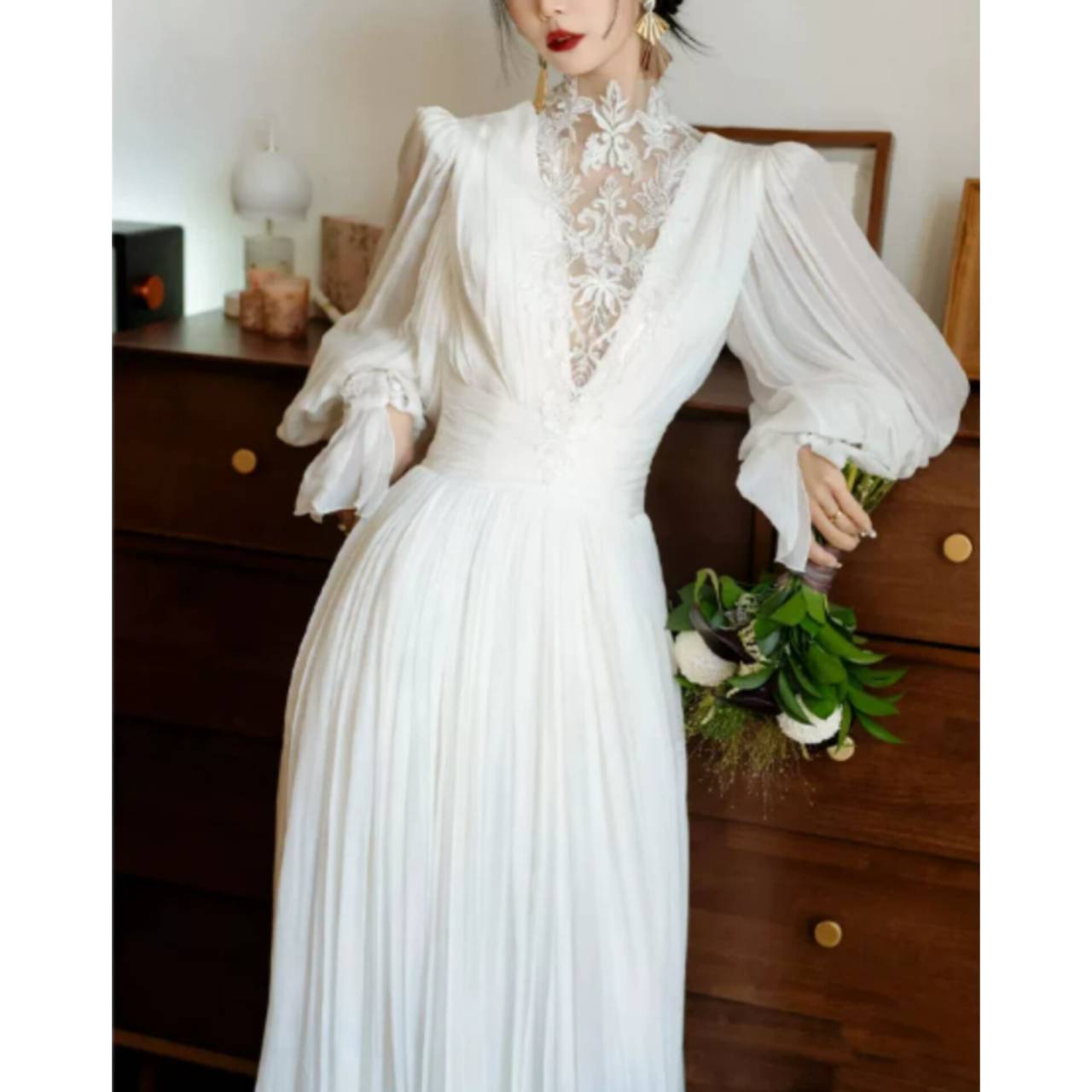 レースとシフォンが描く、気高く儚いロングスリーブドレス。纏った瞬間、空気が変わる。