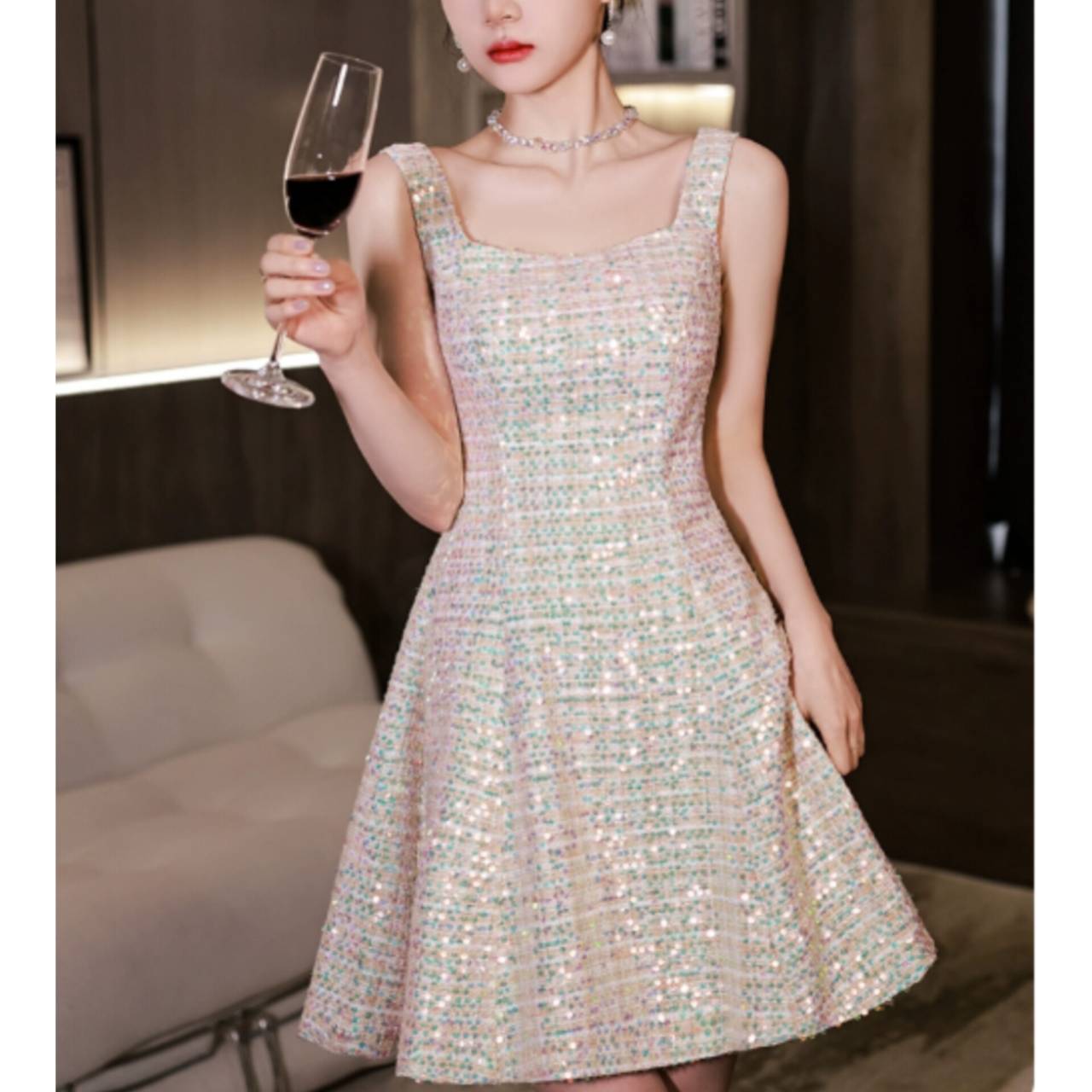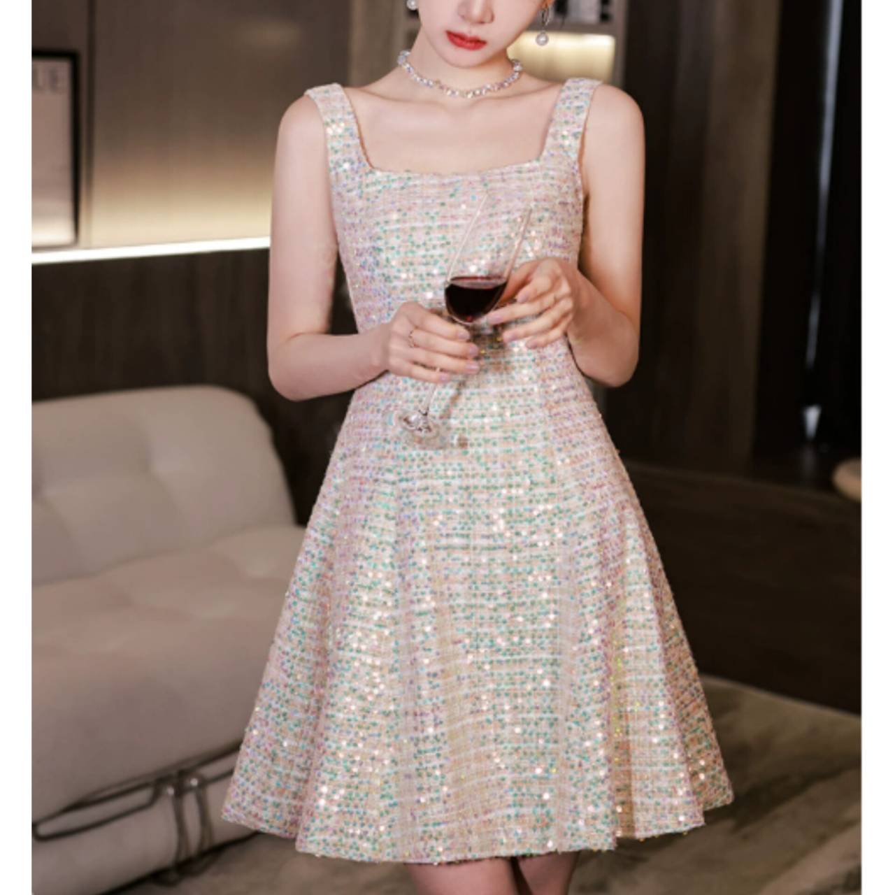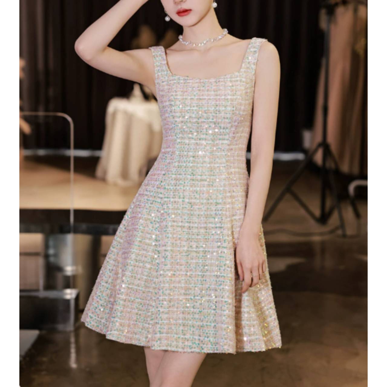 ノースリーブ ドレス 韓国ドレス ツイード スパンコール キラキラ スクエアネック ハイウエスト ウエストシェイプ タック入り ミニ丈 ショート丈 フレア グリッター エレガント クラシック XS/3XL 韓国【B7146】