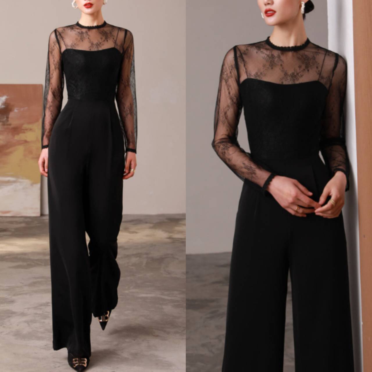 レースが語る、余裕と美しさを纏うオールインワンドレス。上半身に繊細なフラワーレースを贅沢に使用し、シアー感と上品さを両立させた大人のためのブラックオールインワンドレス。