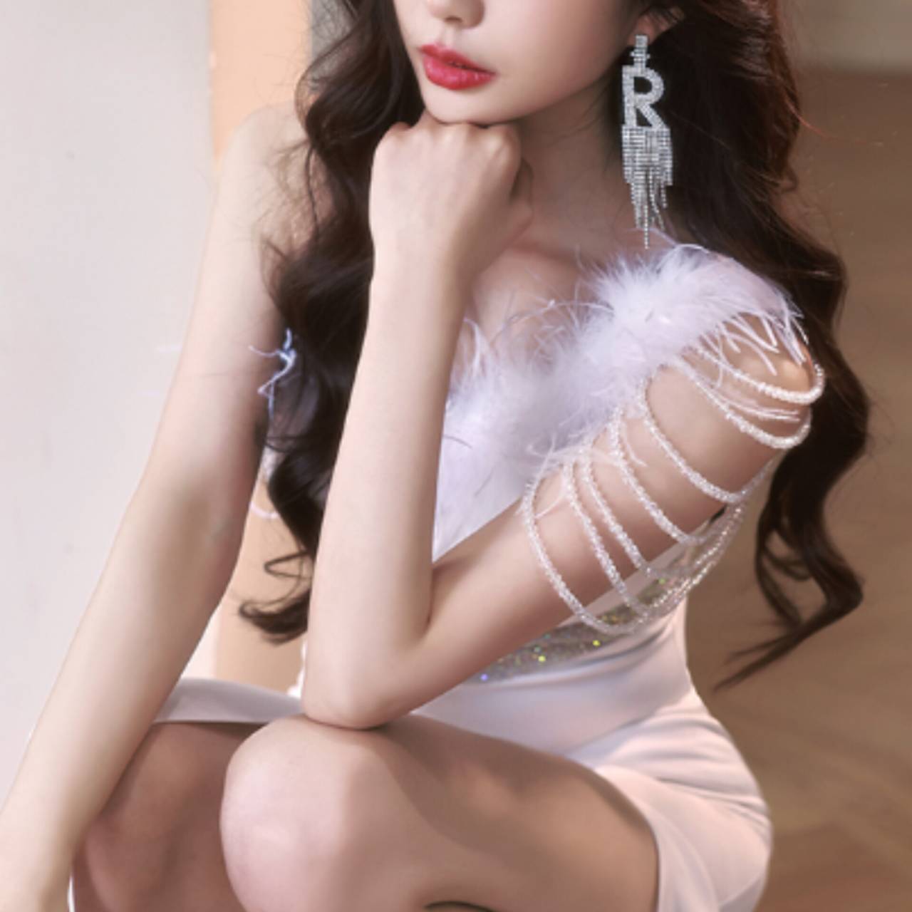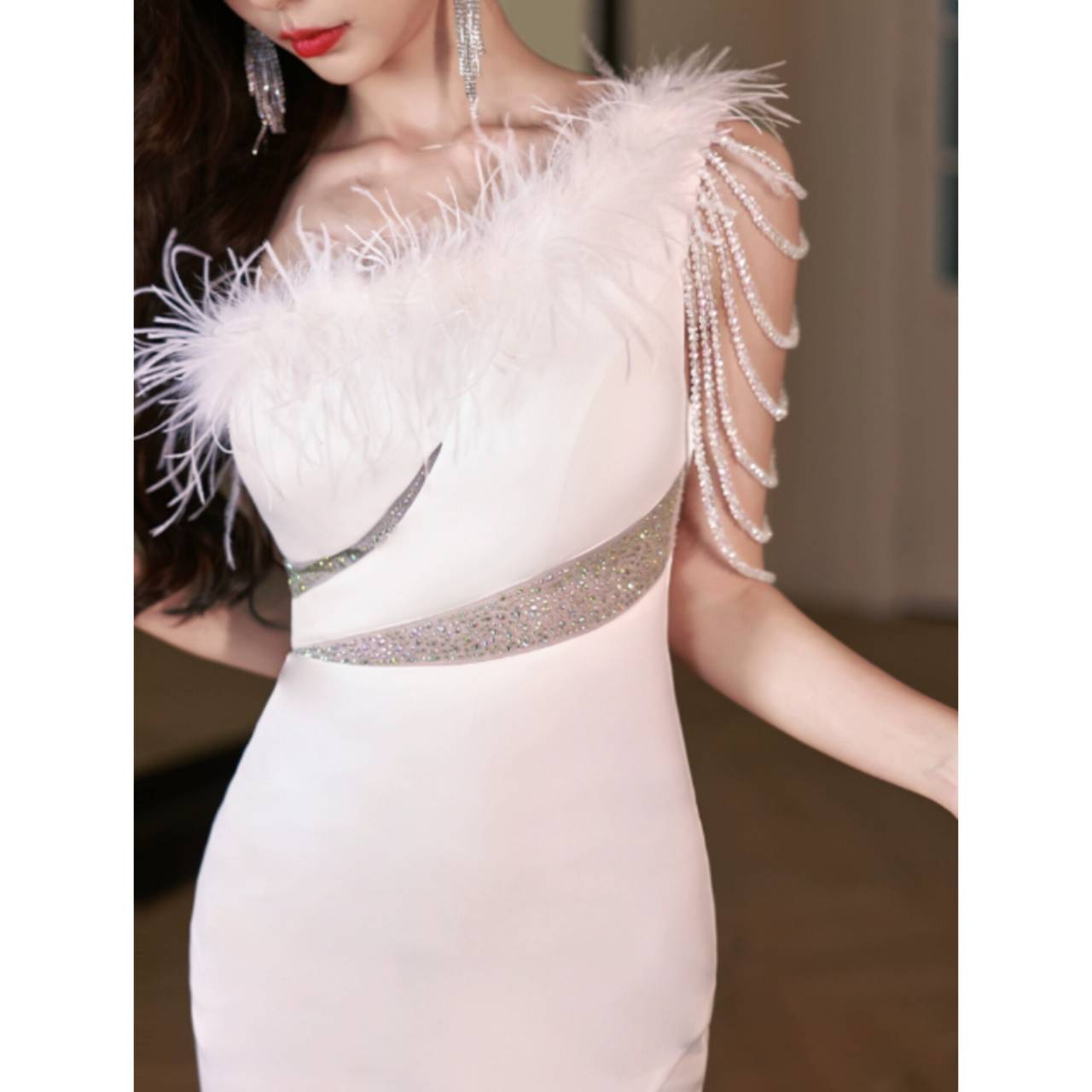 一瞬で視線を奪う——“羽根×スワロ輝き”の完璧シルエットドレス。