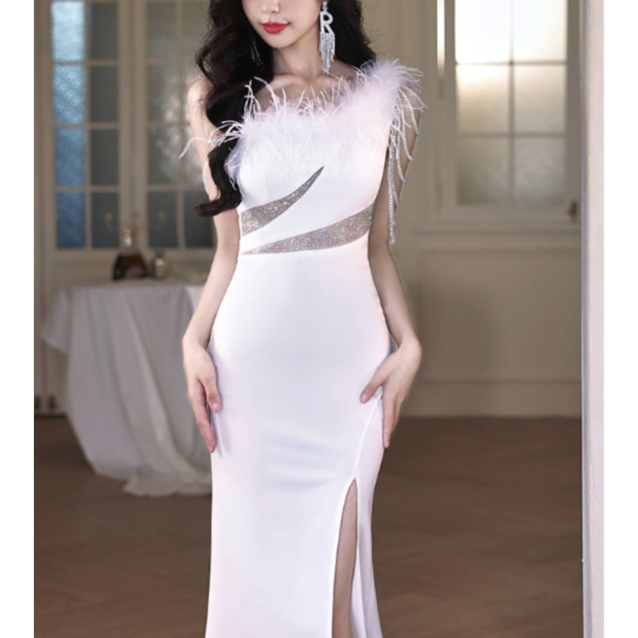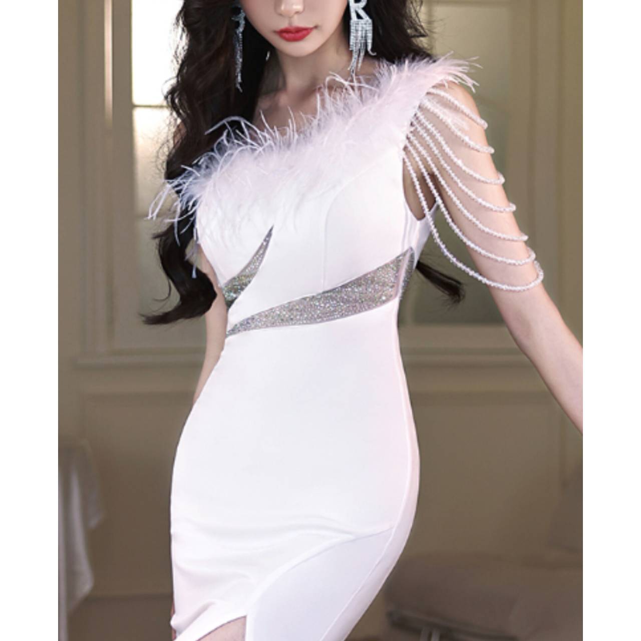 全2色 ドレス イブニングドレス 韓国ドレス ワンショルダー ワンショル ファー ふわふわ ビジュー ドレープ スパンコール ハイウエスト マーメイド ロング ハイスリット フロントスリット アシンメトリー リュクス ラグジュアリー 美シルエット XS/2XL 韓国【K9878】