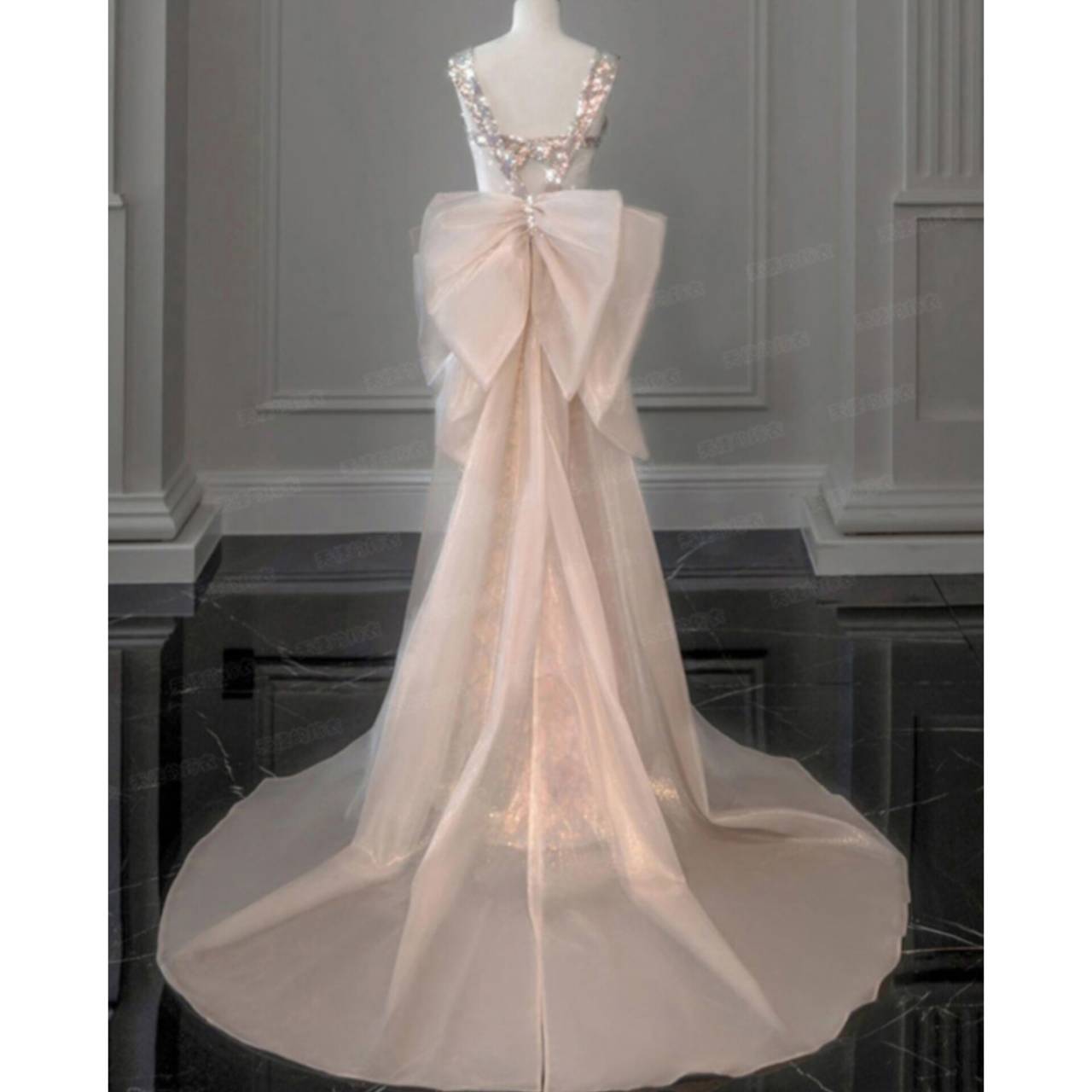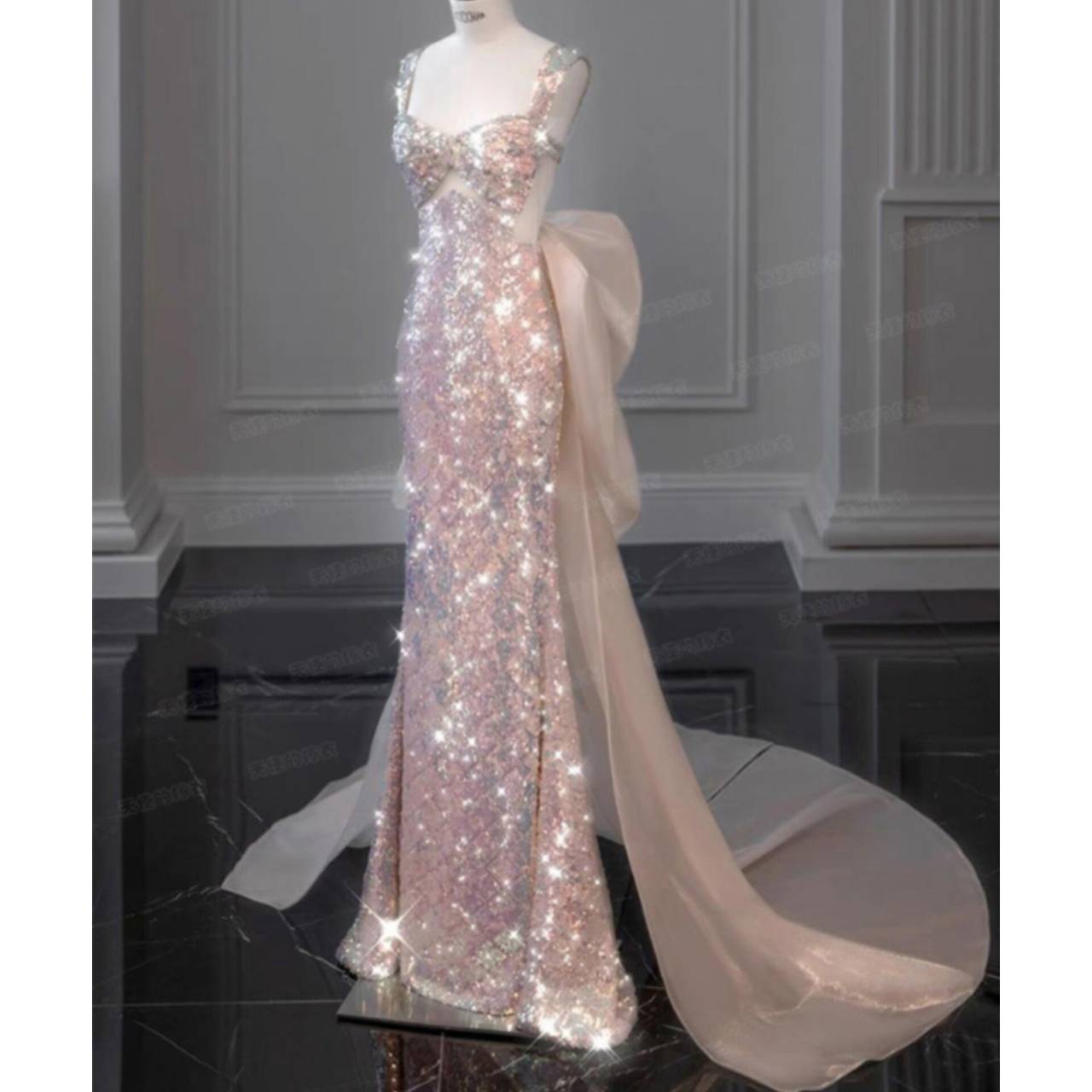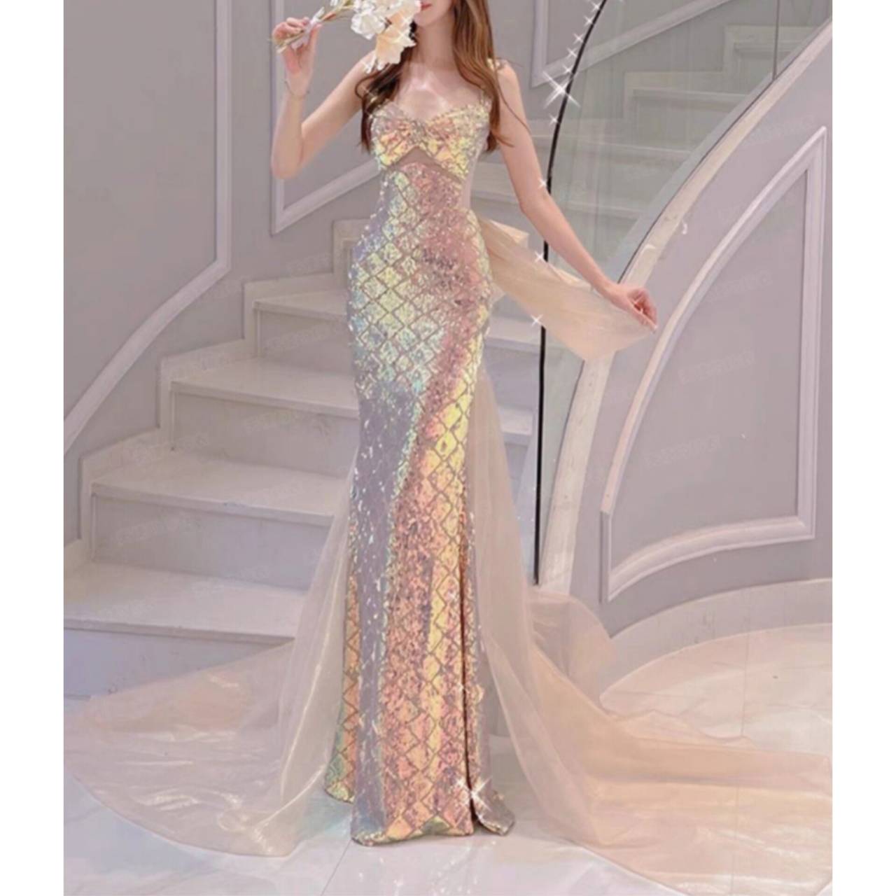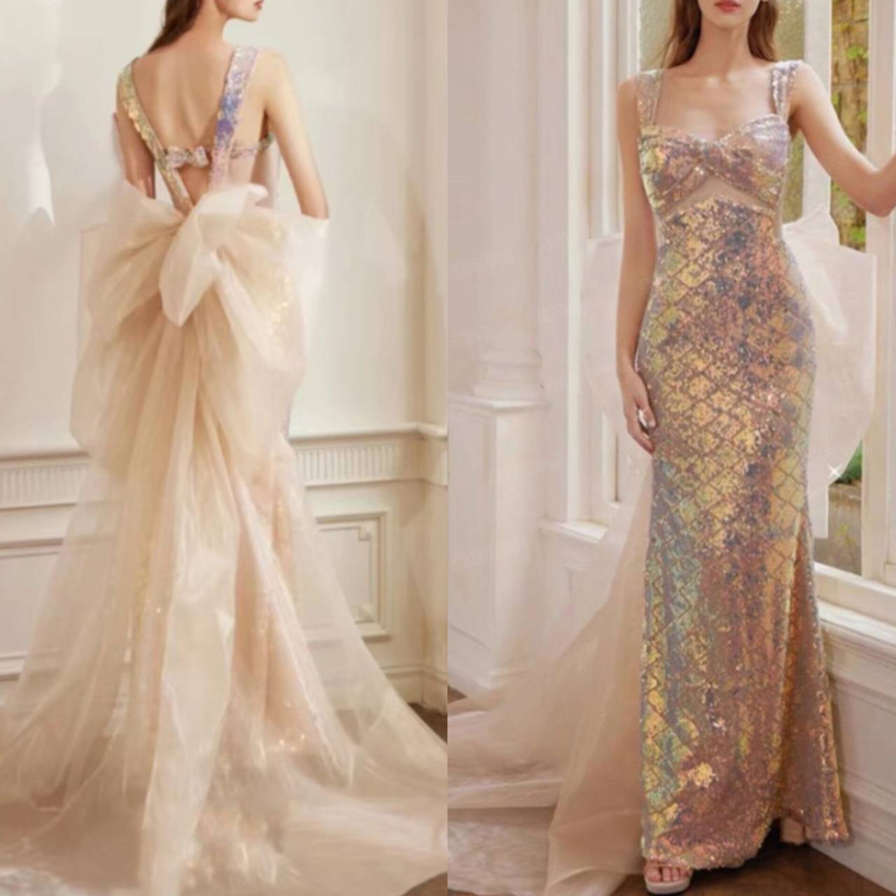 キラキラ ドレス イブニングドレス 韓国ドレス スパンコール 胸元ねじりデザイン シアー バックオープン バックシャン バックリボン ビッグリボン オーガンジー バックコンシャス ハイウエスト マーメイド ロング グリッター エレガント XS/3XL 韓国【K9305】