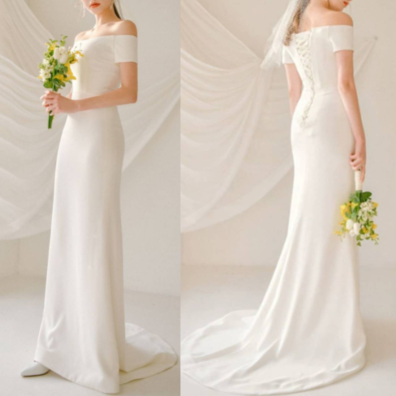 オフショルダー ウェディングドレス 韓国ドレス オフショル 半袖 バックレースアップ ハイウエスト ソフトマーメイド マーメイド Iライン ロングトレーン ロング トレーン エレガント XS/3XL 韓国【B3032】