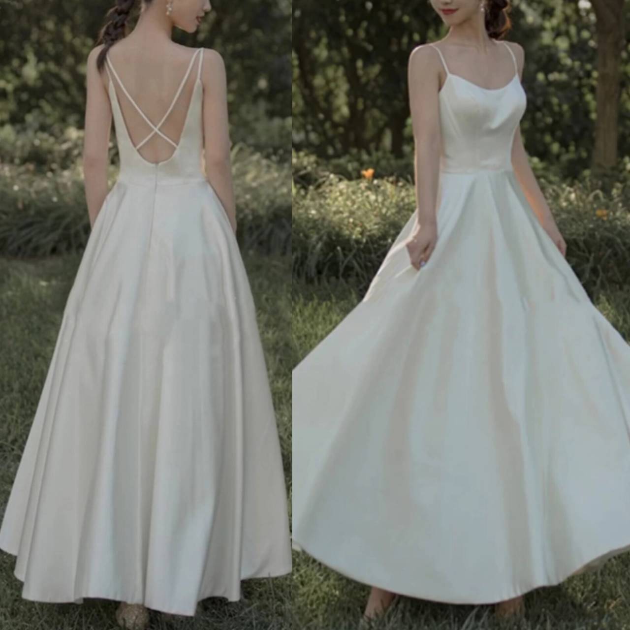 光沢が強すぎないため、屋外撮影やナチュラルな会場でも上品な印象に。華奢なキャミソールストラップ×緩やかなスクエアネックが、デコルテをすっきりと見せ、上半身をコンパクトに演出。
