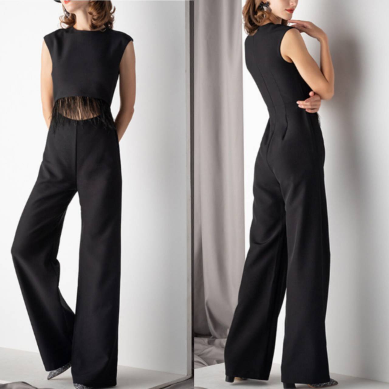 ノースリーブ パンツドレス オールインワン ジャンプスーツ クルーネック フレンチスリーブ フリンジ フェザー フロントオープン ハイウエスト ロング フレアパンツ ワイドパンツ ワイドレッグ ブラック エレガント XS/L 韓国【K9717】