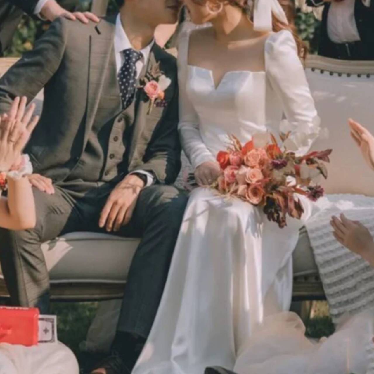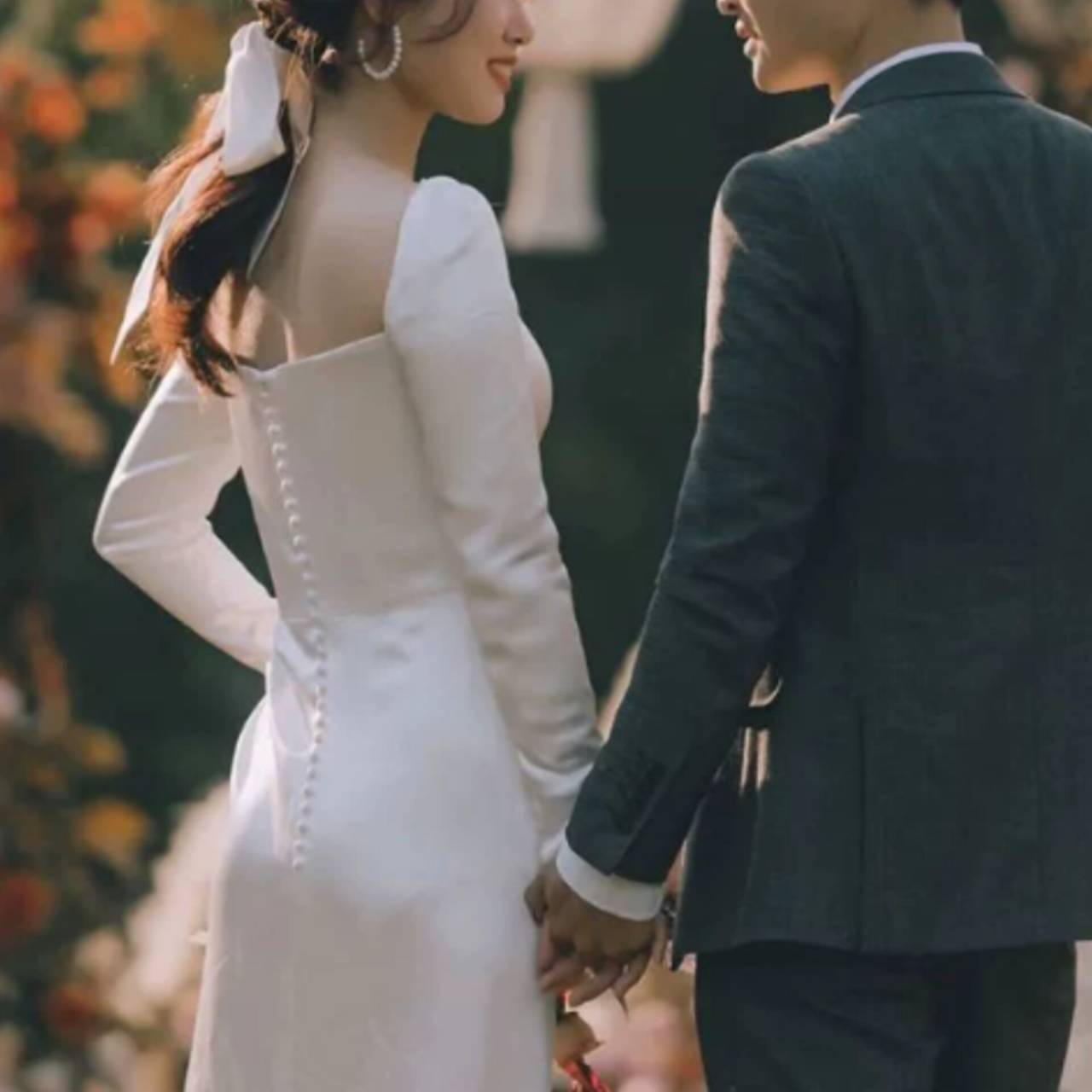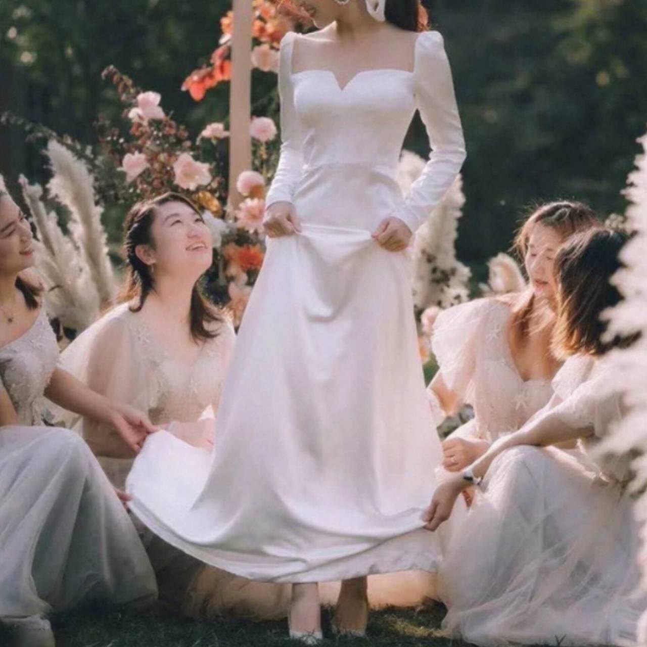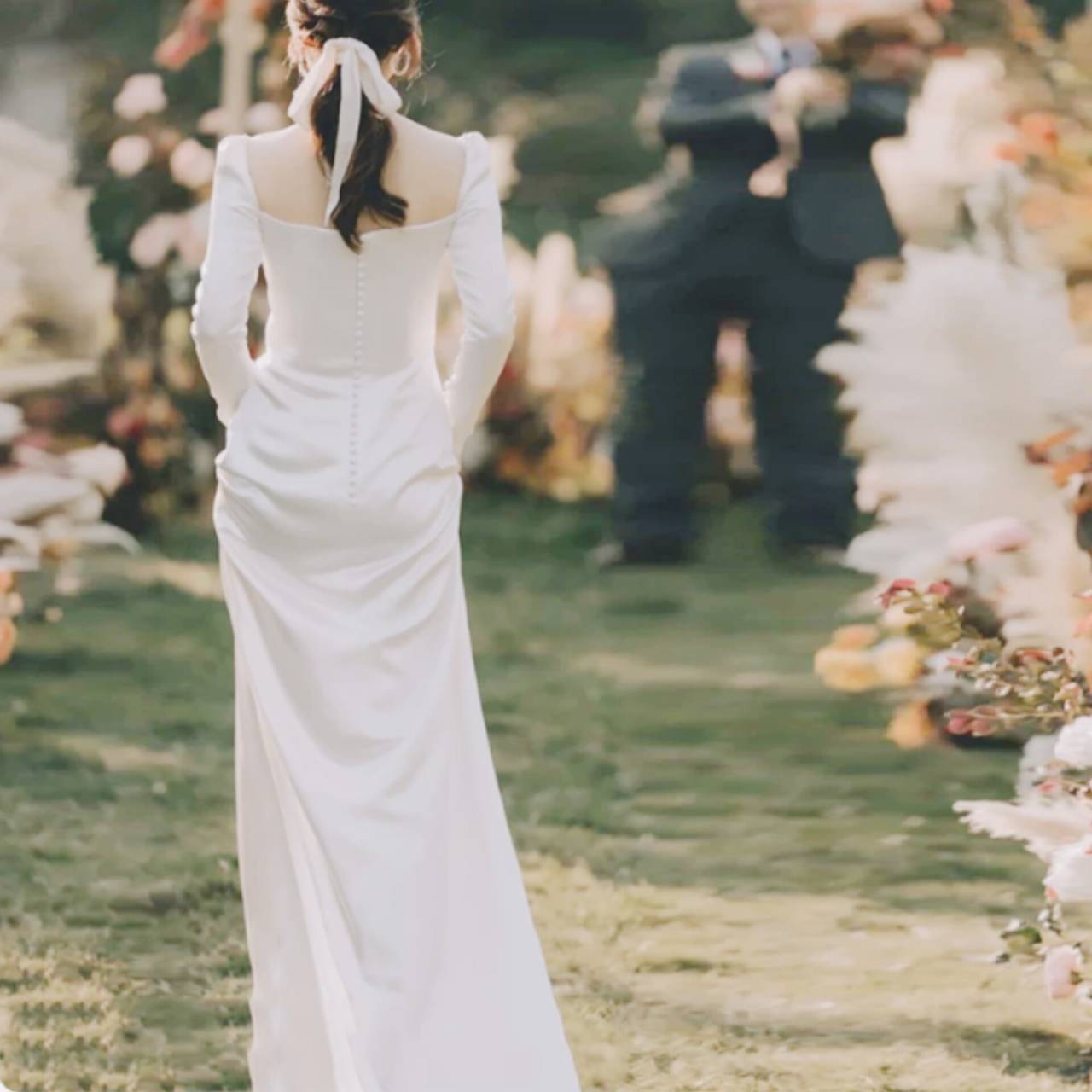 長袖 ウェディングドレス 韓国ドレス スクエアネック スリットネック サテン パワショル風 パワーショルダー くるみボタン ハイウエスト Aライン フレア ロング エレガント 体型カバー XS/3XL 韓国【K3191】