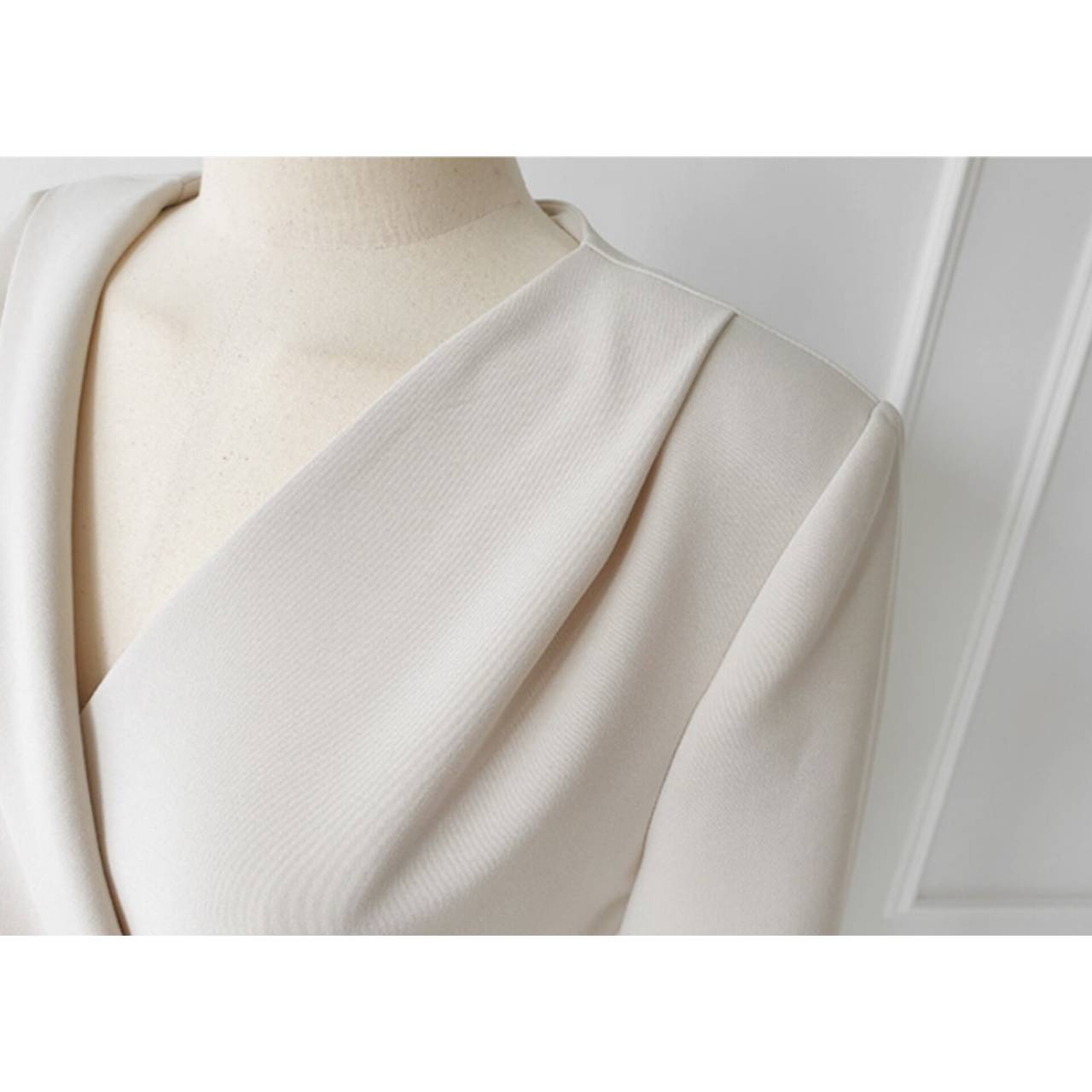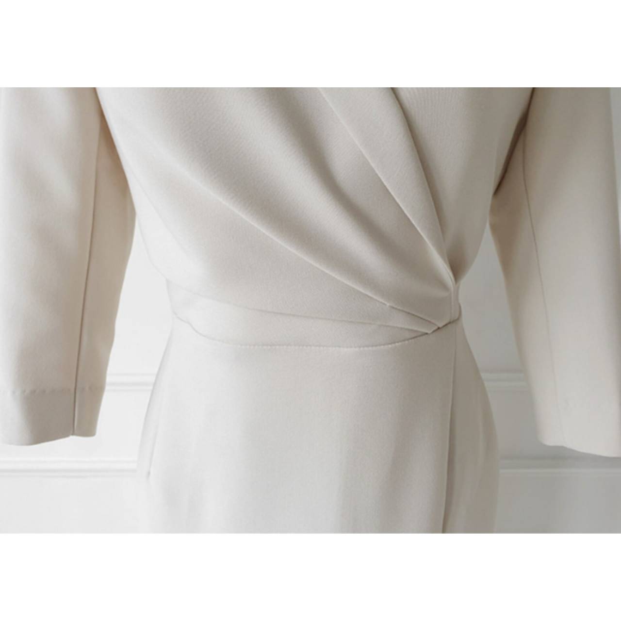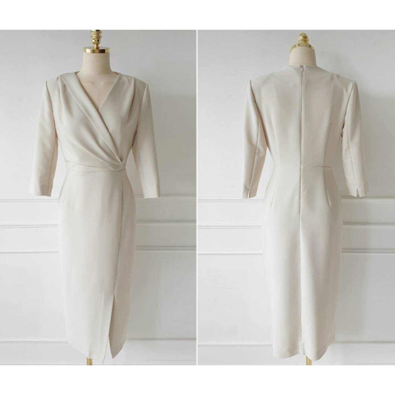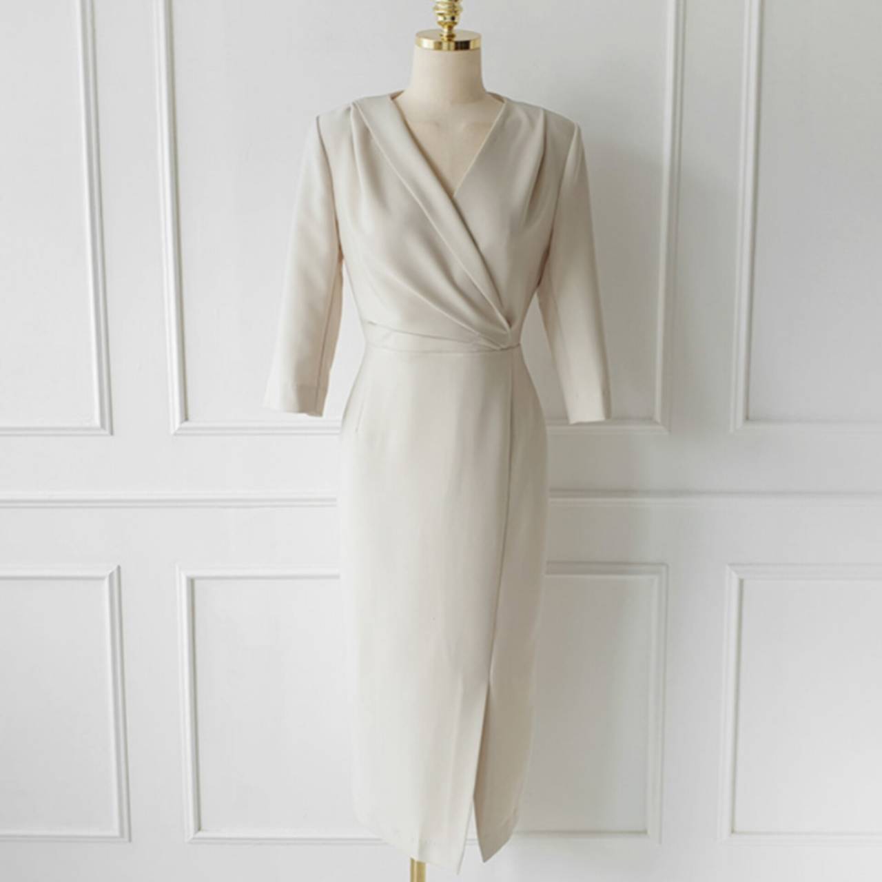 7分袖 ワンピース ドレス 韓国ワンピース ワンピ 襟付き ジャケットライク カシュクール ドレープ ハイウエスト ウエストマーク ミディアム丈 ミディ丈 膝丈 フロントスリット スリット スレンダー スリム 美シルエット S/XL 韓国【K8767】