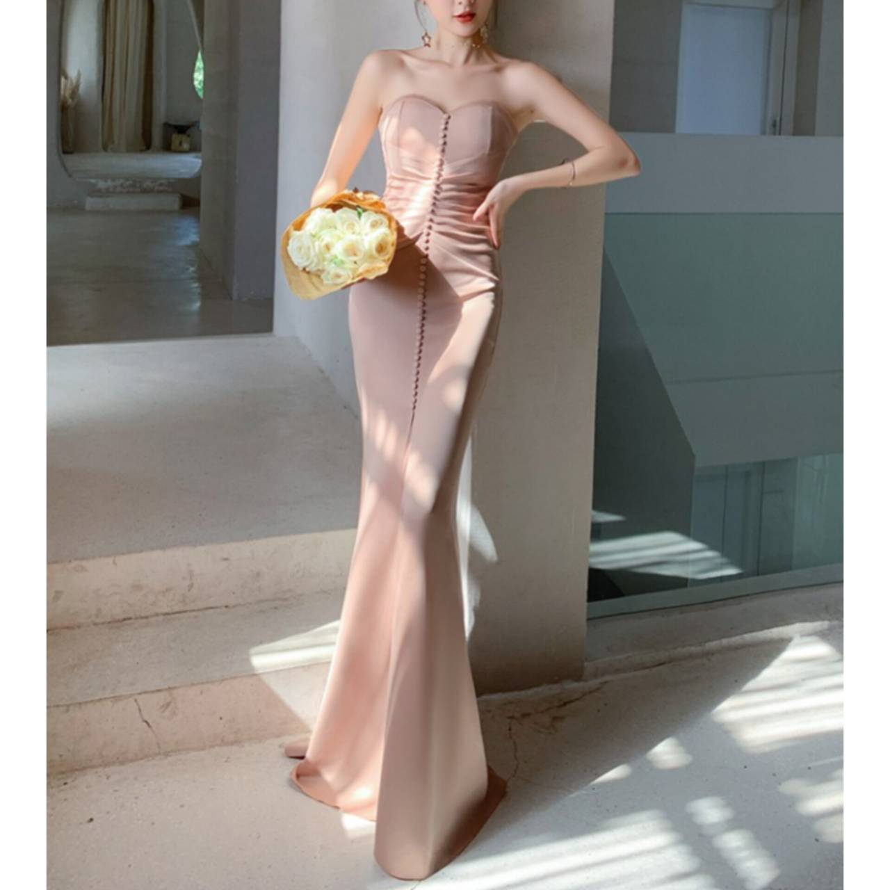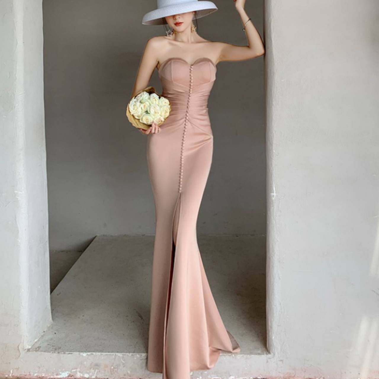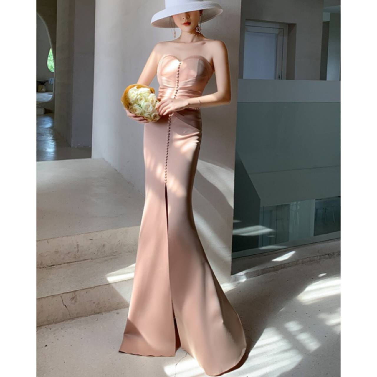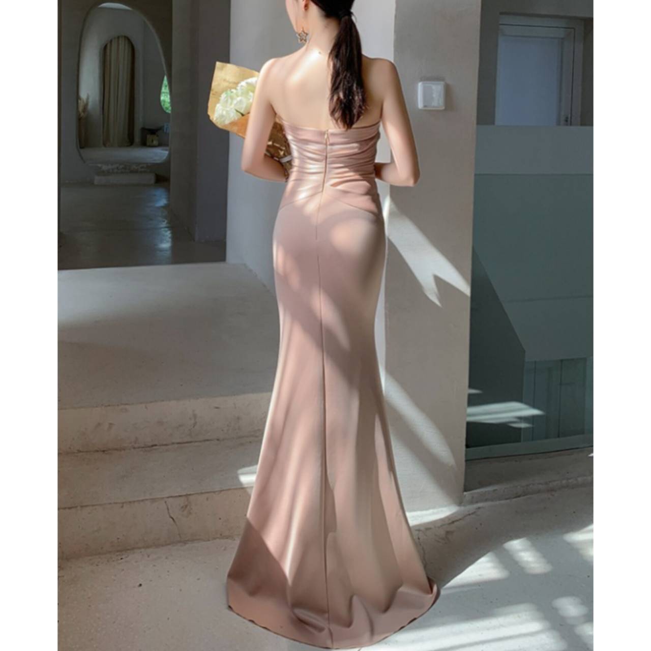 あなたの美しさを極限まで引き出す、究極のストラップレスドレス。上質な高密度ストレッチサテンを贅沢に使用し、身体のラインをしなやかに包み込みながら、美しいメリハリを演出する大人エレガントなロングドレスです。