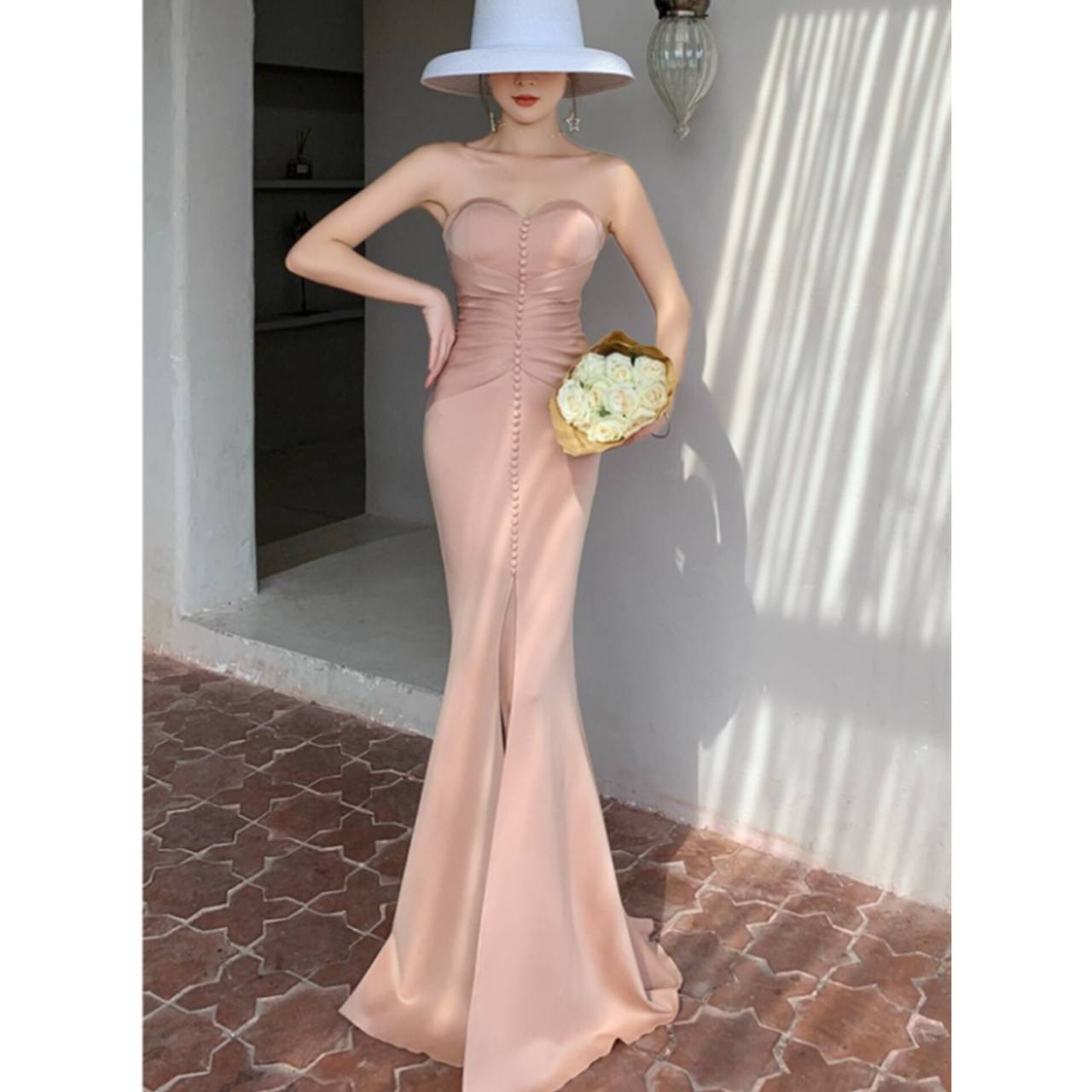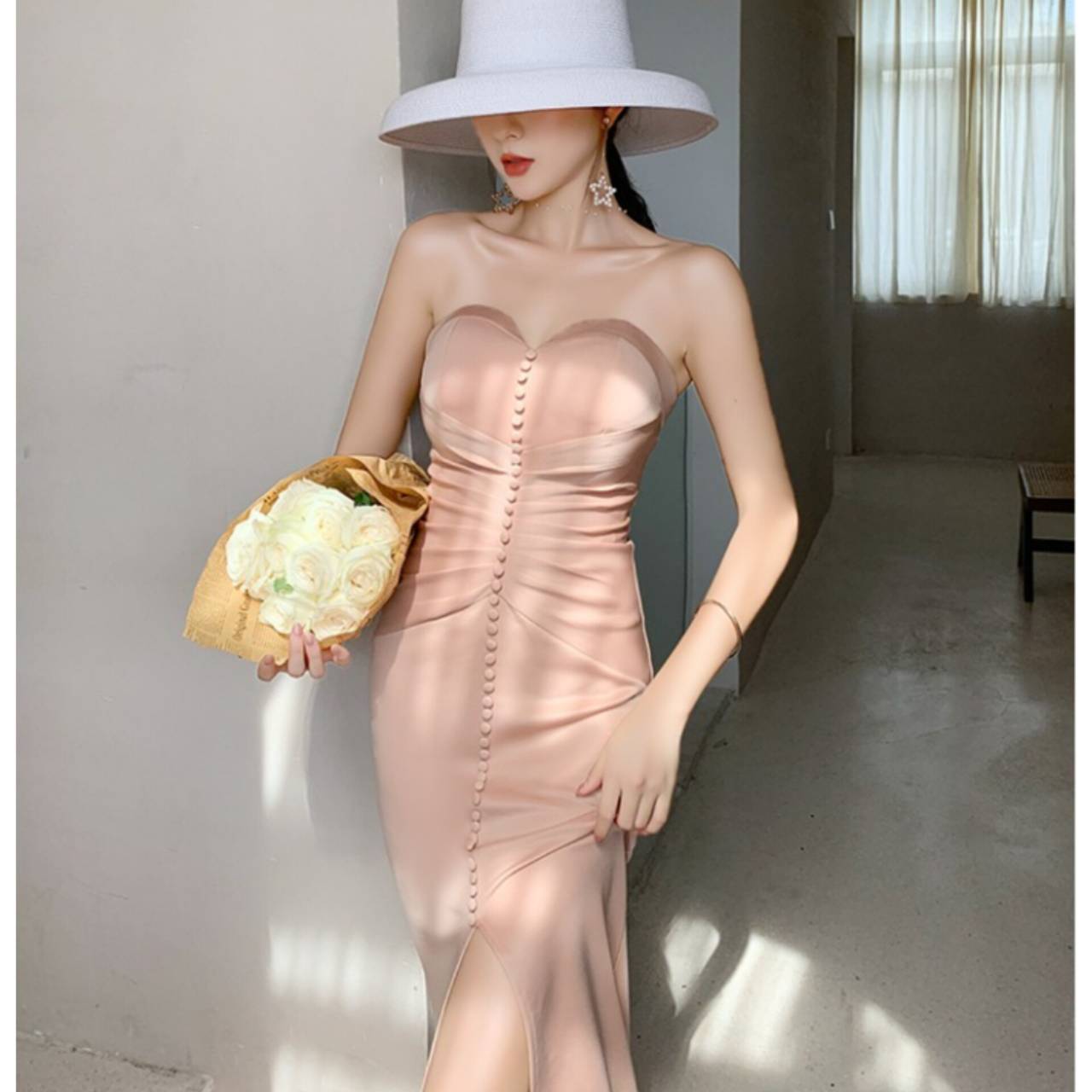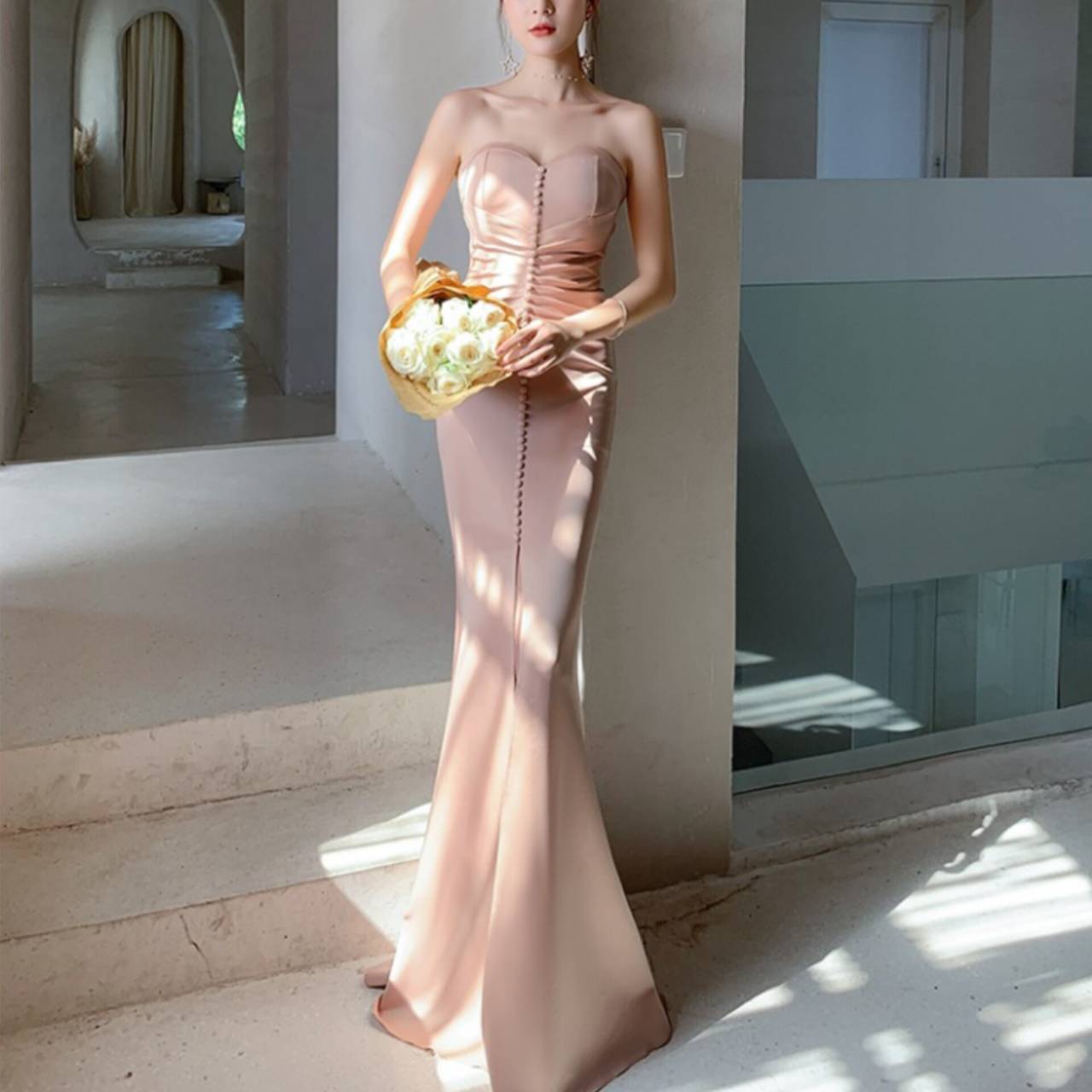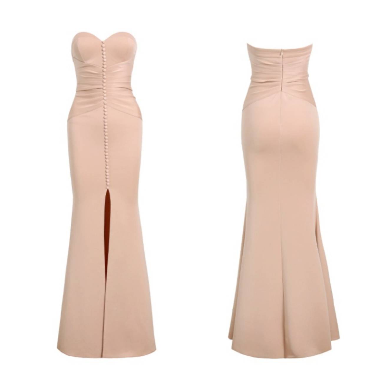 あなたの美しさを極限まで引き出す、究極のストラップレスドレス。上質な高密度ストレッチサテンを贅沢に使用し、身体のラインをしなやかに包み込みながら、美しいメリハリを演出する大人エレガントなロングドレスです。
