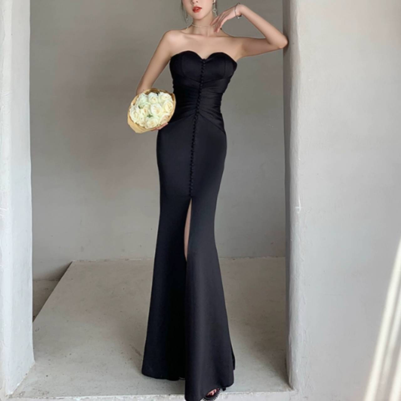 全3色 ドレス イブニングドレス 韓国ドレス ビスチェ ハートカット くるみボタン ハイウエスト フロントスリット ハイスリット マーメイド ロング 美シルエット スタイルアップ エレガント XS/2XL 韓国【K9757】
