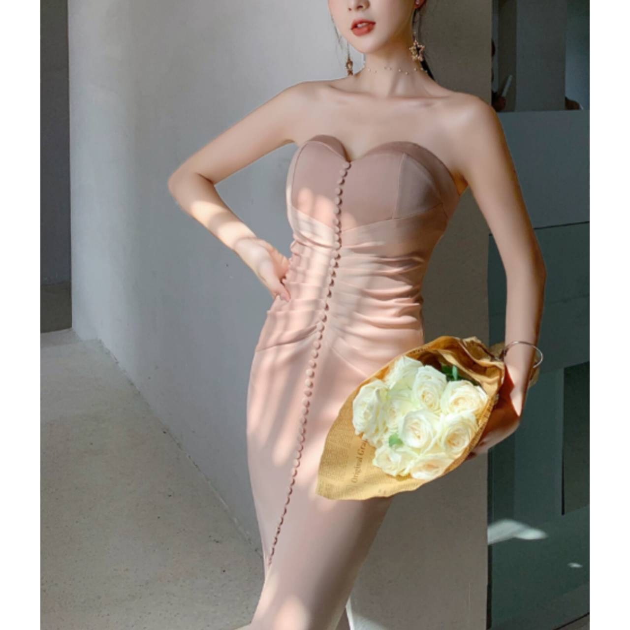 胸元は滑らかにカーブしたハートネックデザインでデコルテを華奢に見せ、中央に連なったクチュール風のくるみボタンが縦ラインを強調。