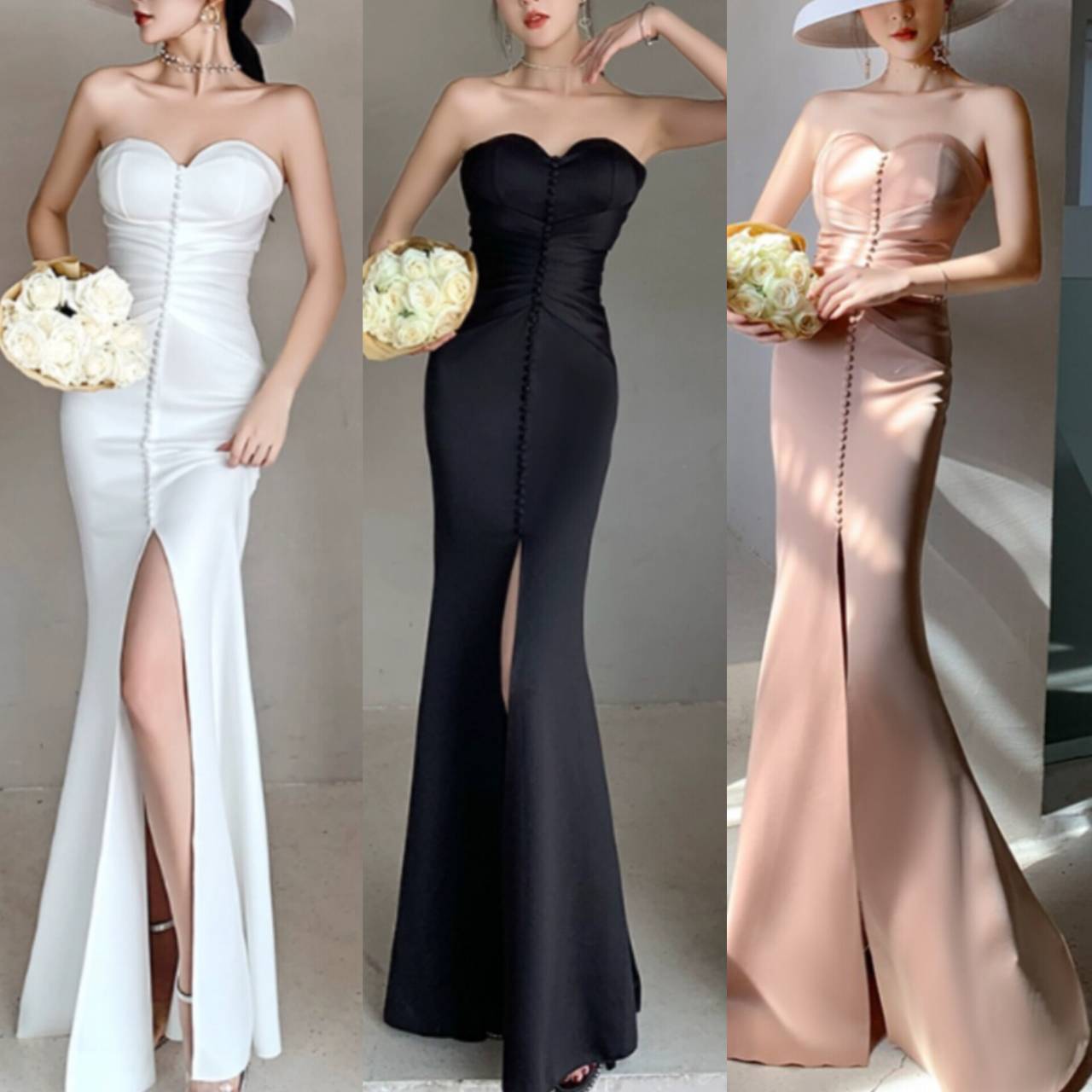 正面スリットが上品な抜け感をプラスし、特別な日の装いをよりドラマティックに彩ります。カラー展開は3色: