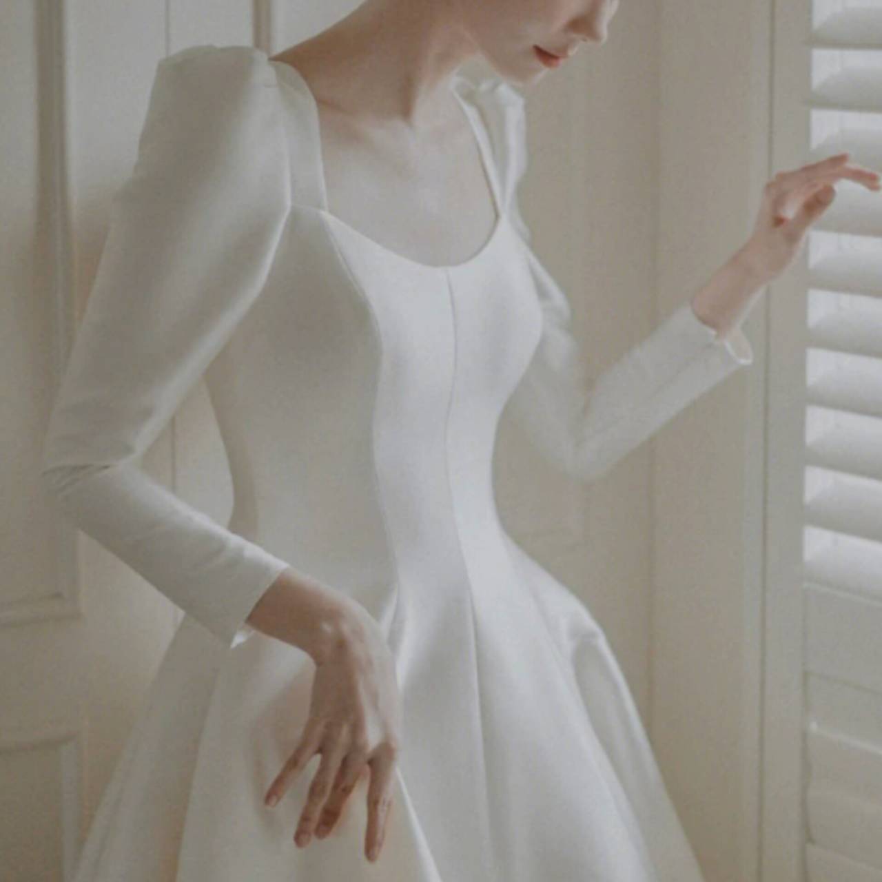 凛と、静かに、誰よりも印象に残る一着。上質な高密度マットサテン素材を贅沢に使用した、ミニマルで洗練されたウェディングドレス。