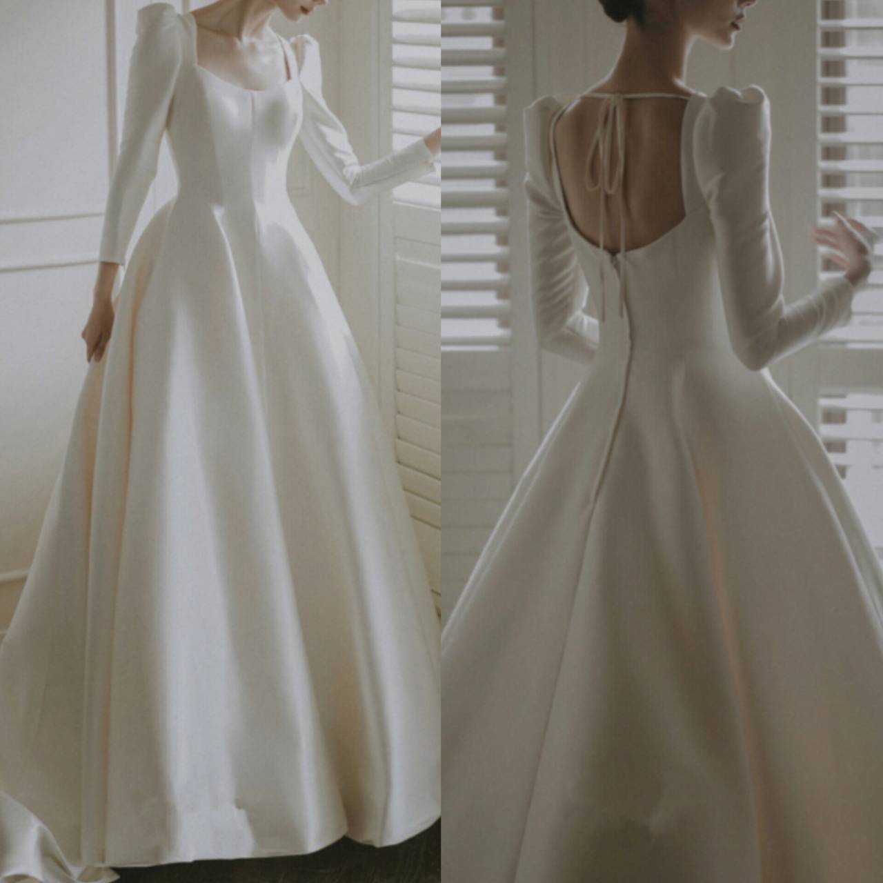 バックシャン ウェディングドレス 韓国ドレス サテン 長袖 ロングスリーブ パワーショルダー バックリボン バックオープン バックレス リボン バックコンシャス ハイウエスト Aライン ロングトレーン ロング トレーン フレア クラシック エレガント XS/L 韓国【K9541】