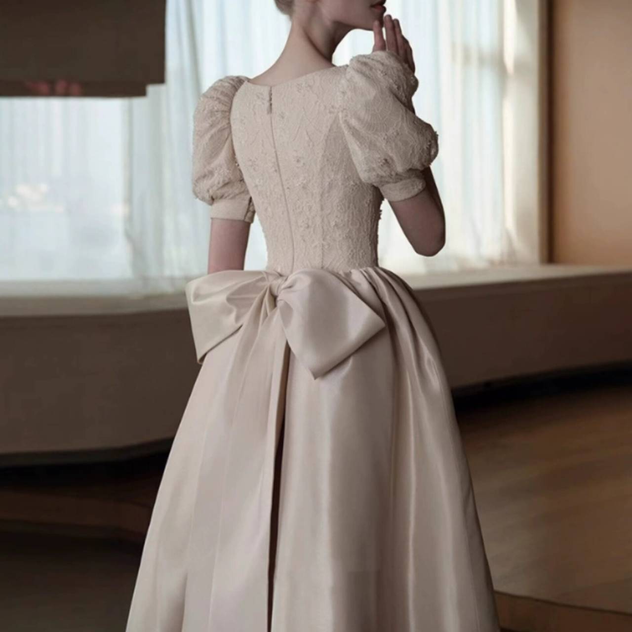 可憐さと大人の落ち着きを両立したデザインだから、写真に残ったときも、何年経っても「選んでよかった」と思える一着です。フォトウェディングや少人数婚、レストランウェディング、二次会まで幅広く対応。
