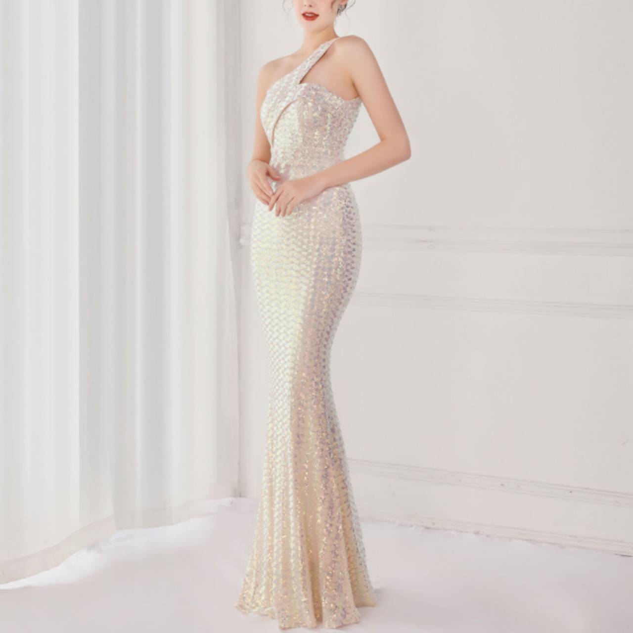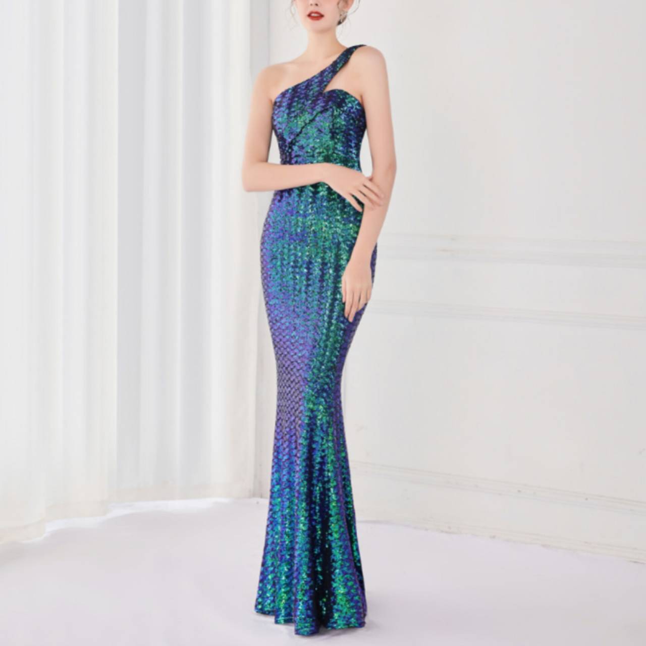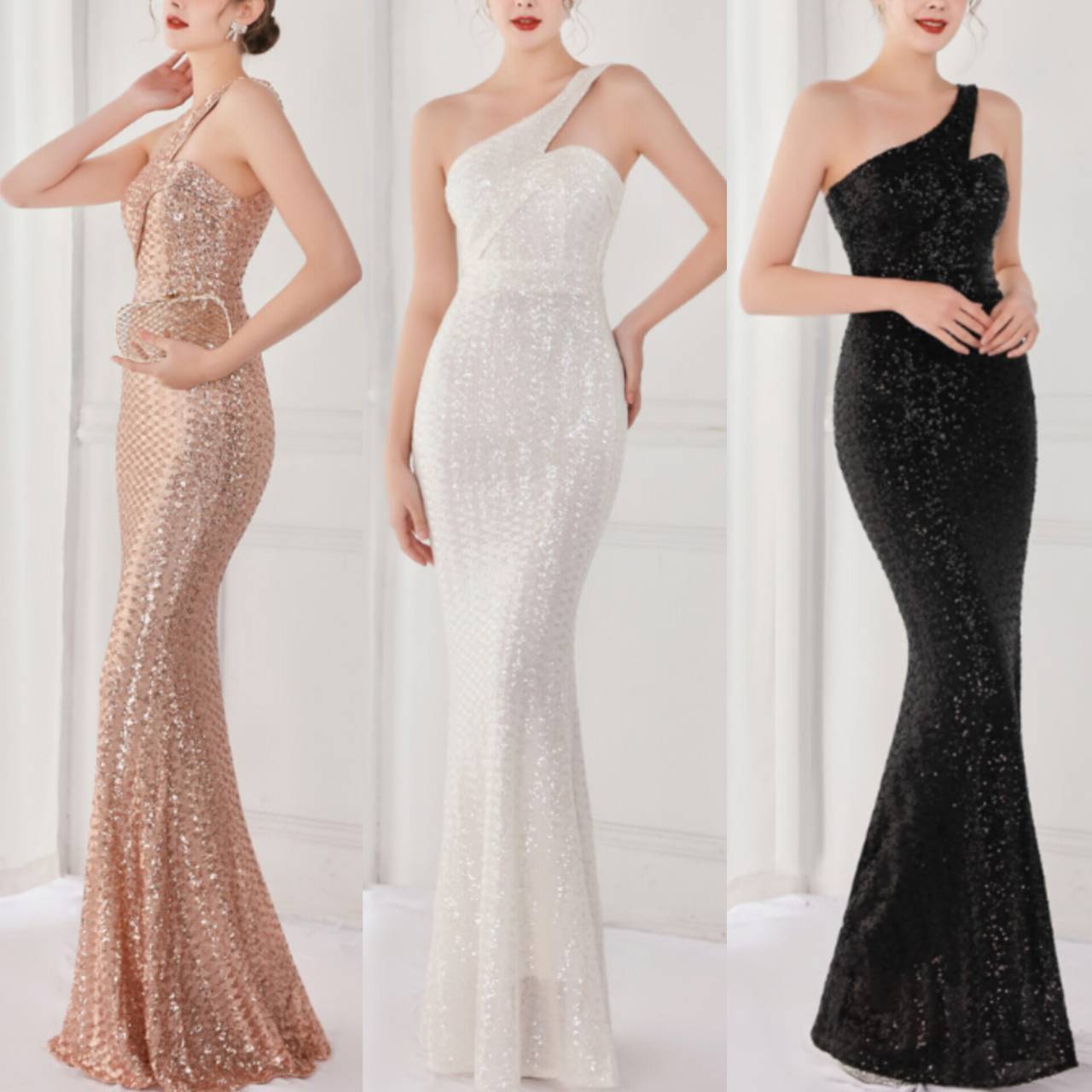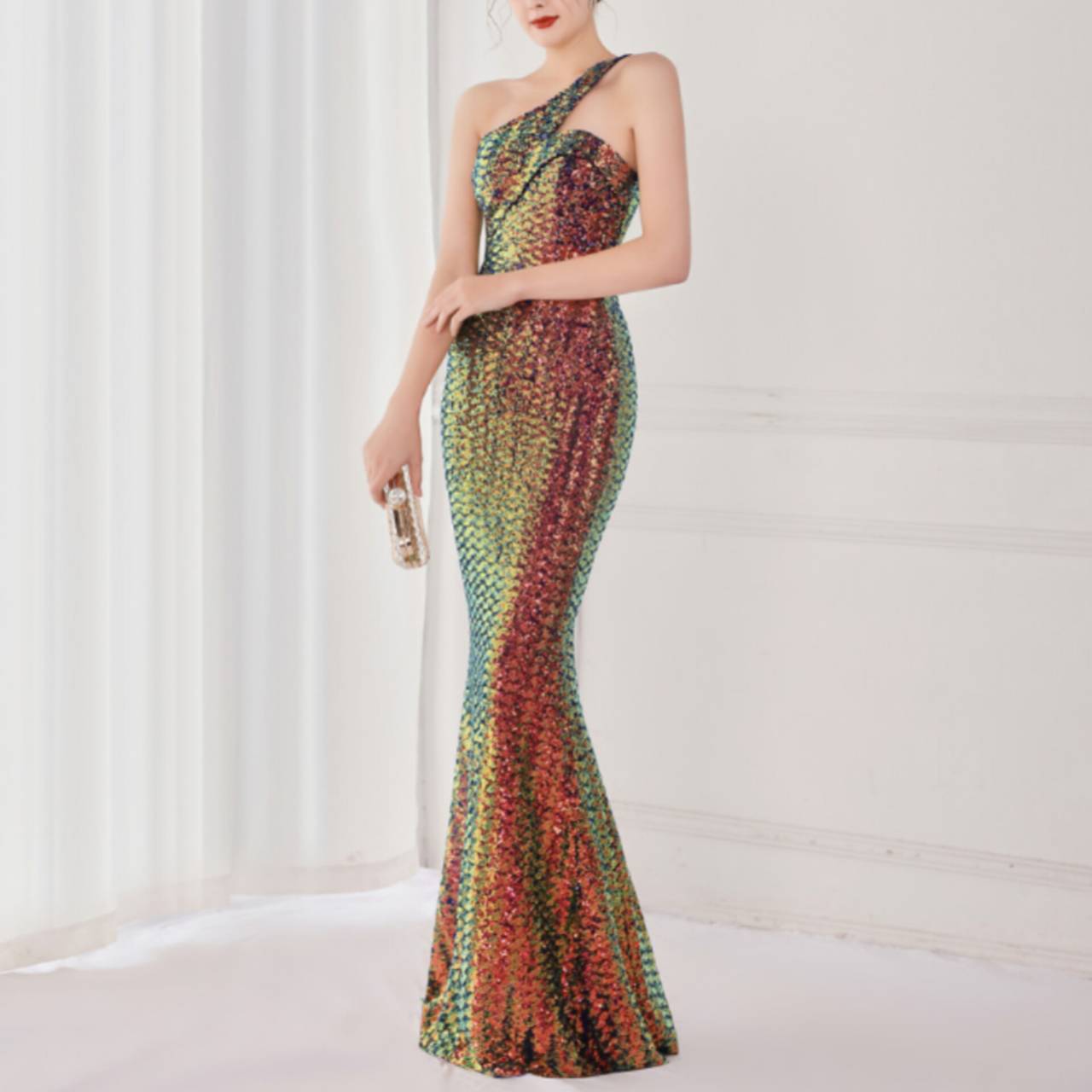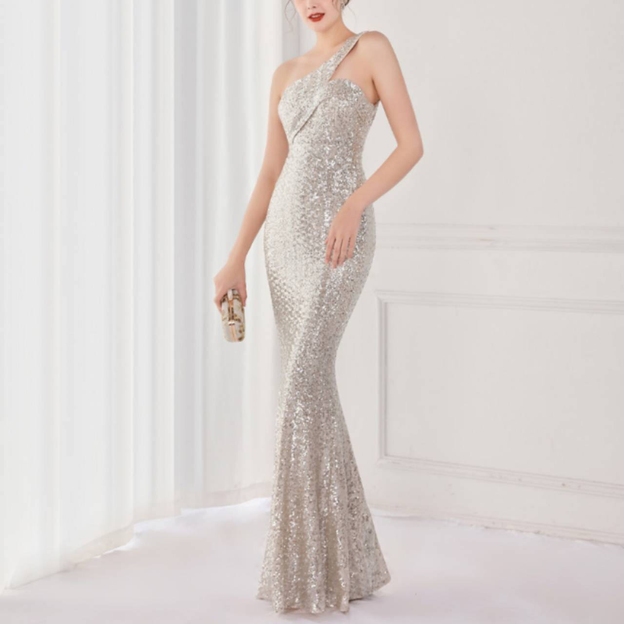 全8色 ドレス イブニングドレス 韓国ドレス キラキラ スパンコール ワンショルダー ハイウエスト マーメイド ロング アシンメトリー グリッター 美シルエット スタイルアップ S/2XL 韓国【K5358】