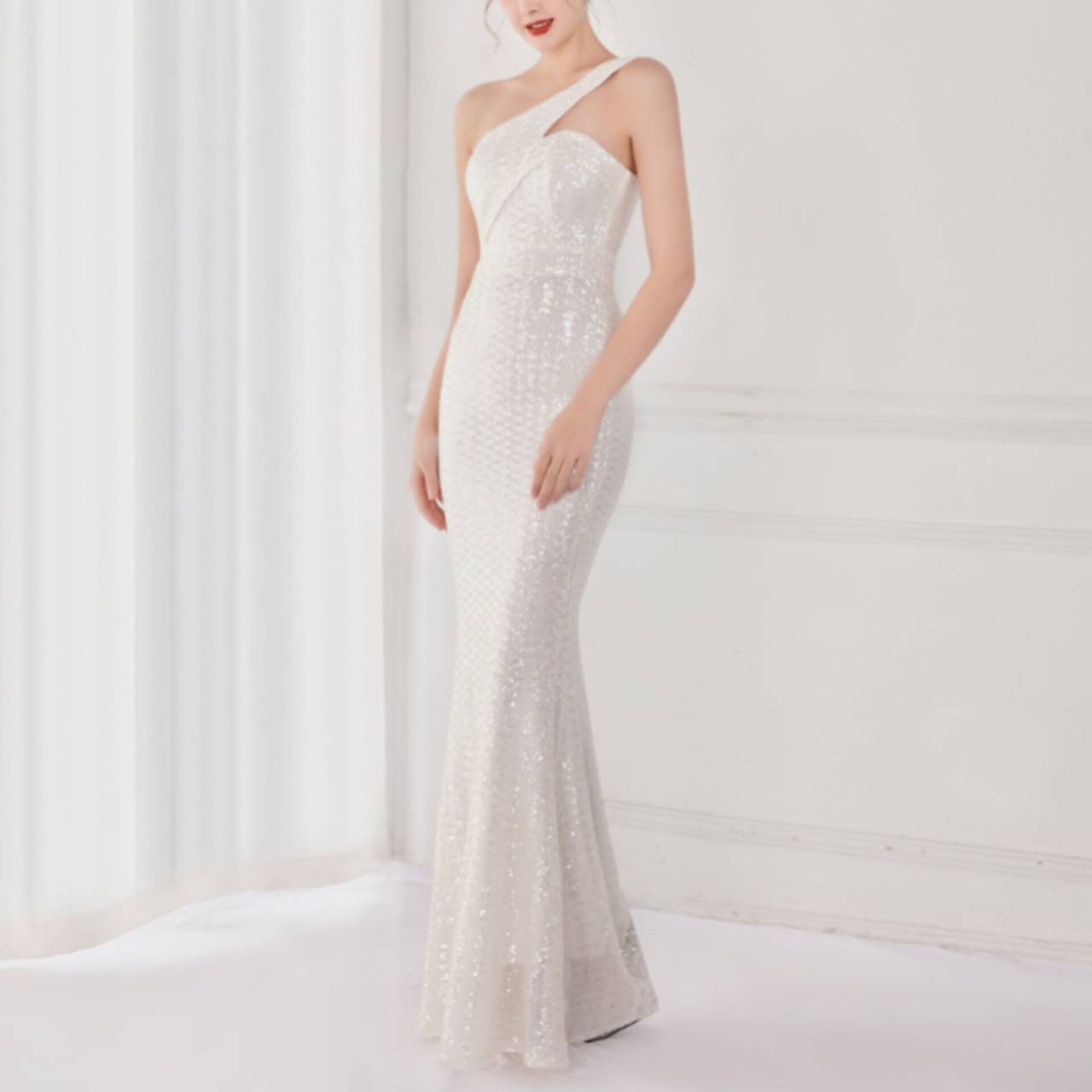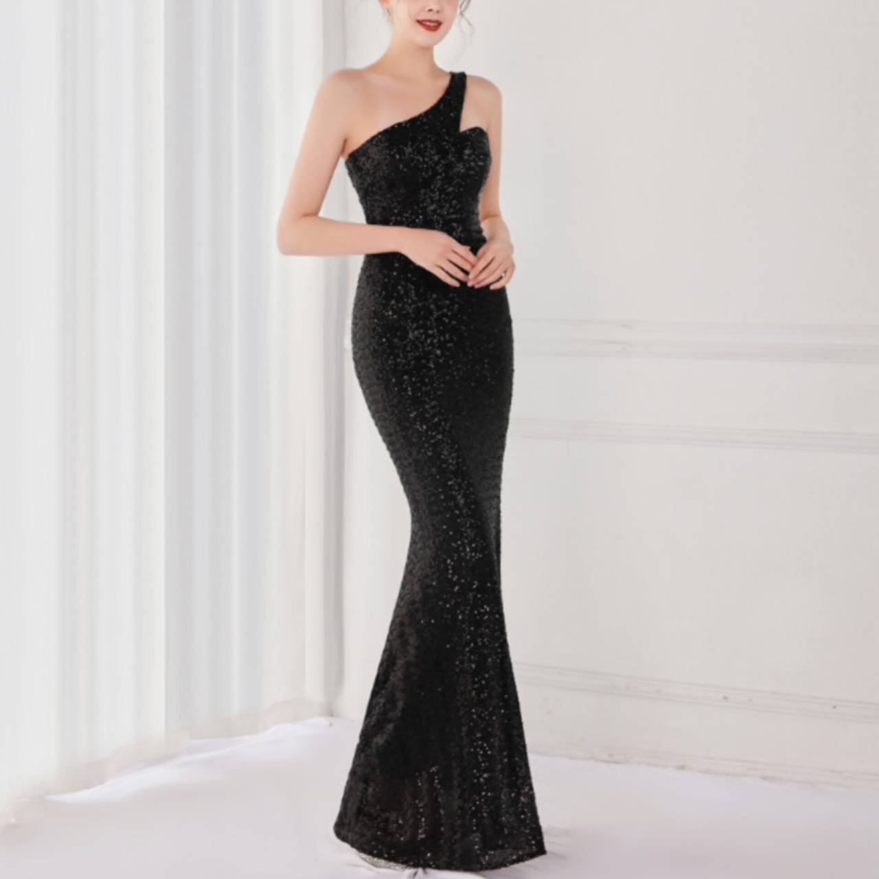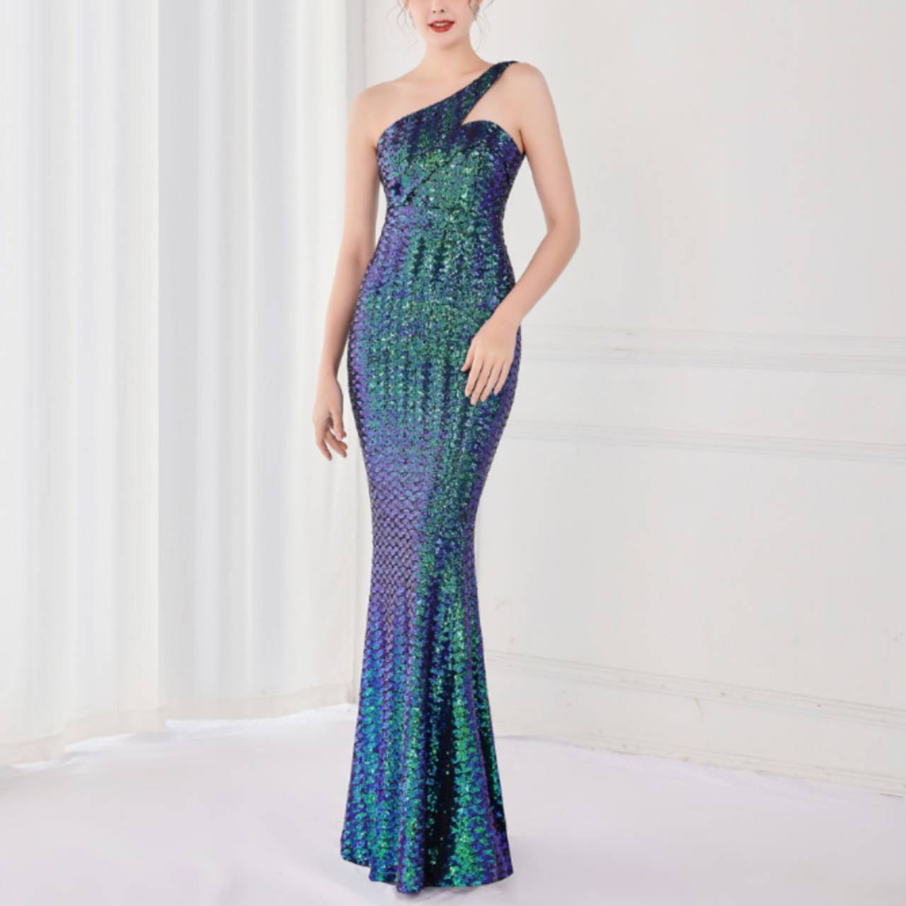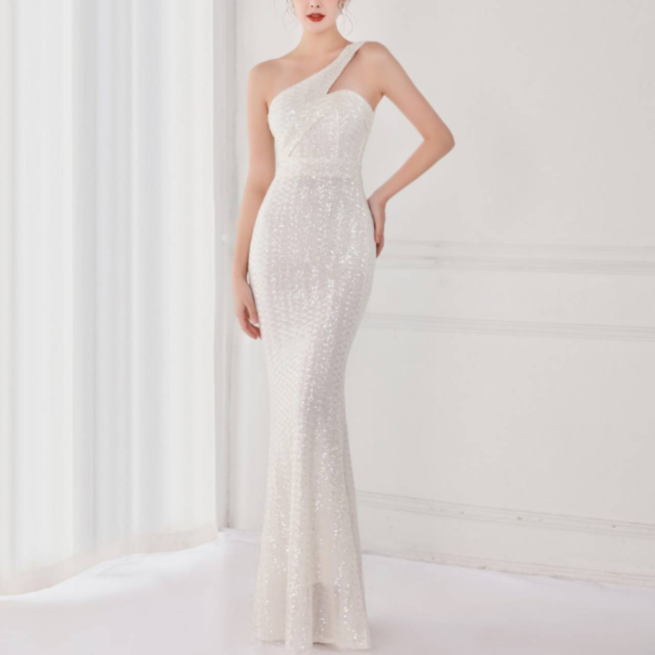 全8色 ドレス イブニングドレス 韓国ドレス キラキラ スパンコール ワンショルダー ハイウエスト マーメイド ロング アシンメトリー グリッター 美シルエット スタイルアップ S/2XL 韓国【K5358】