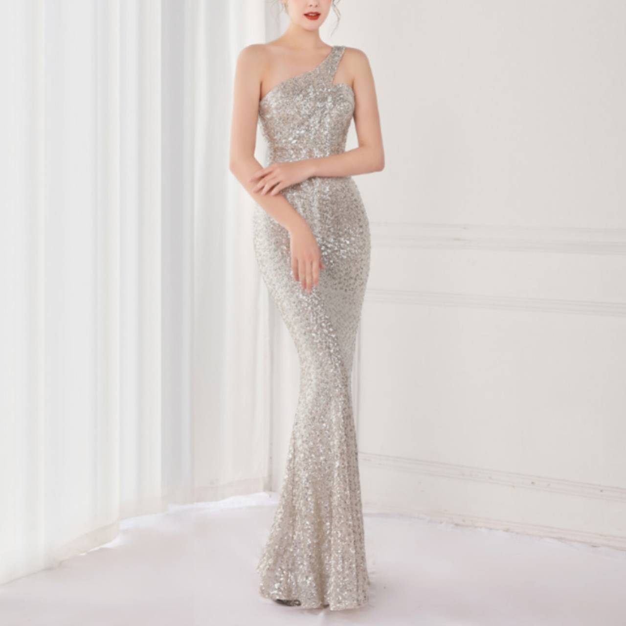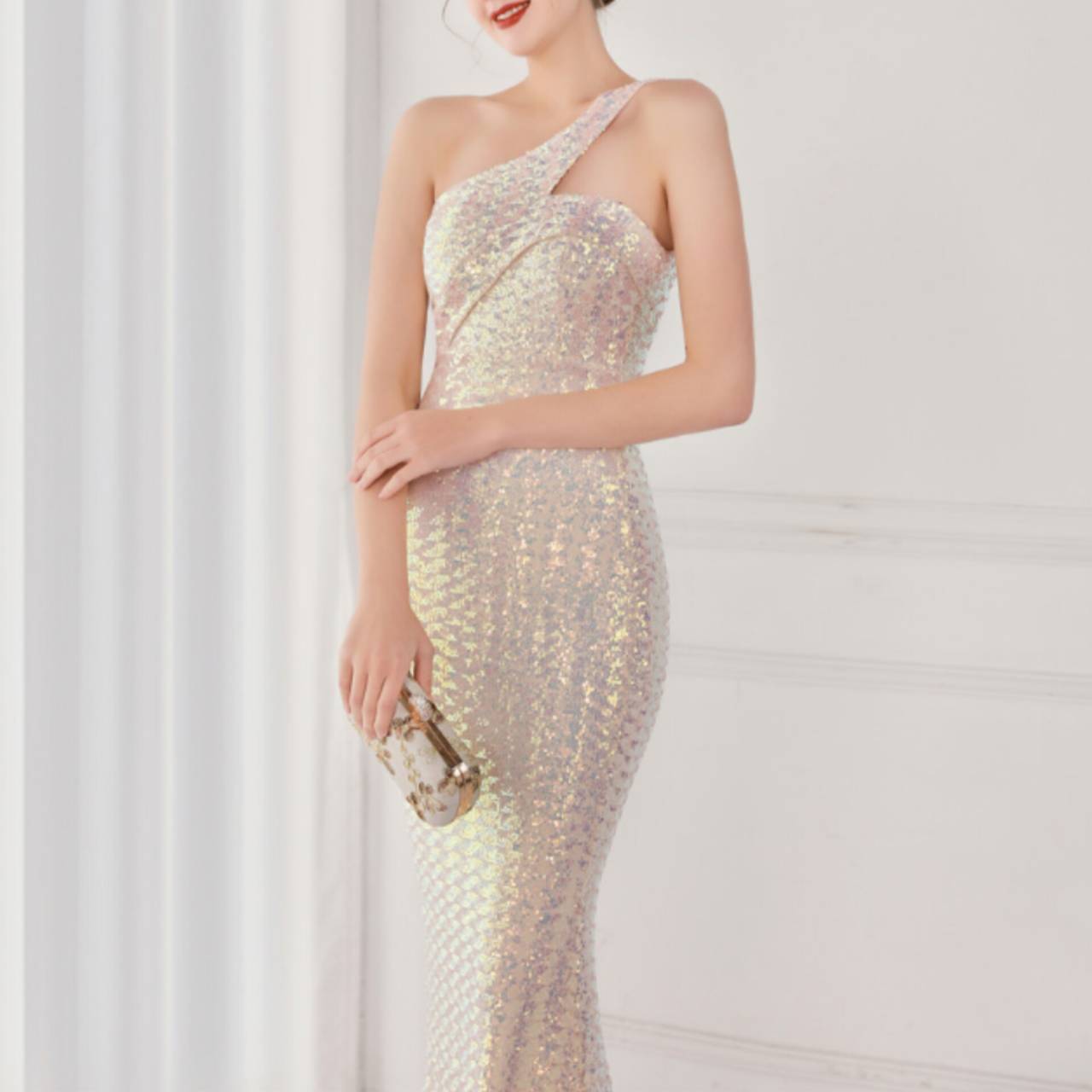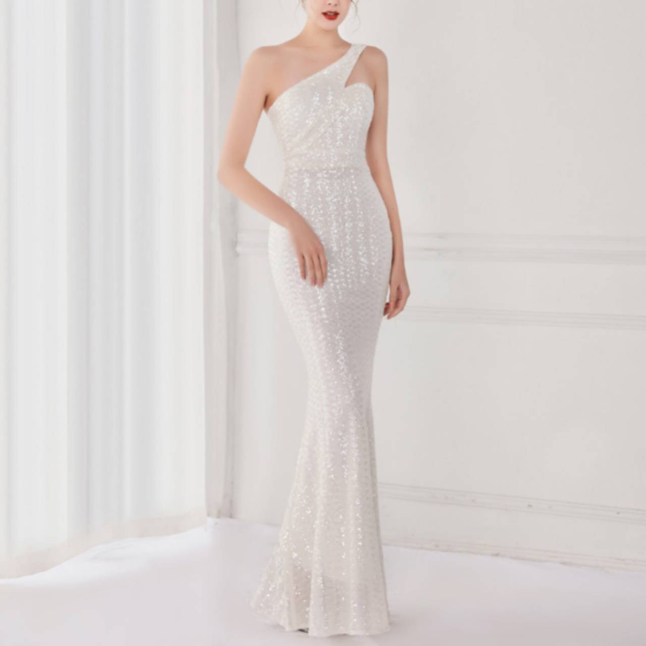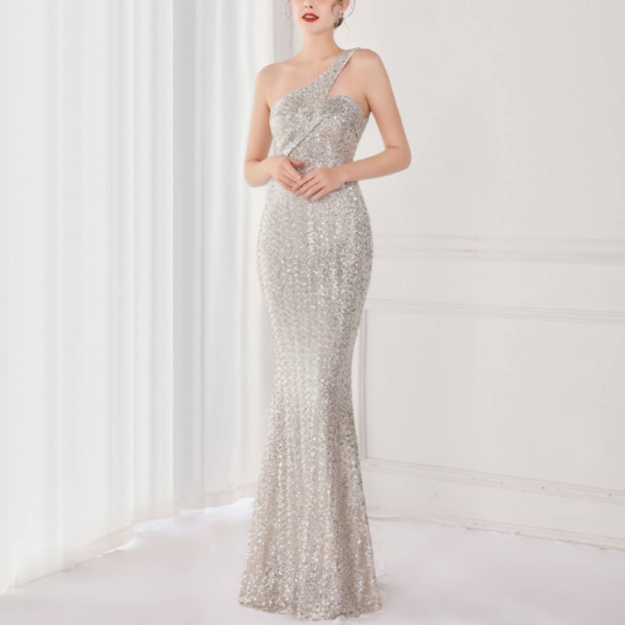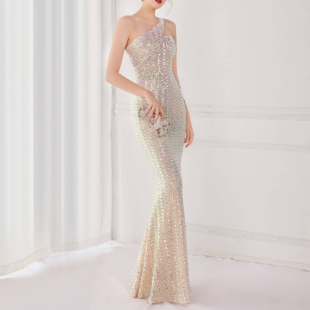 全8色 ドレス イブニングドレス 韓国ドレス キラキラ スパンコール ワンショルダー ハイウエスト マーメイド ロング アシンメトリー グリッター 美シルエット スタイルアップ S/2XL 韓国【K5358】