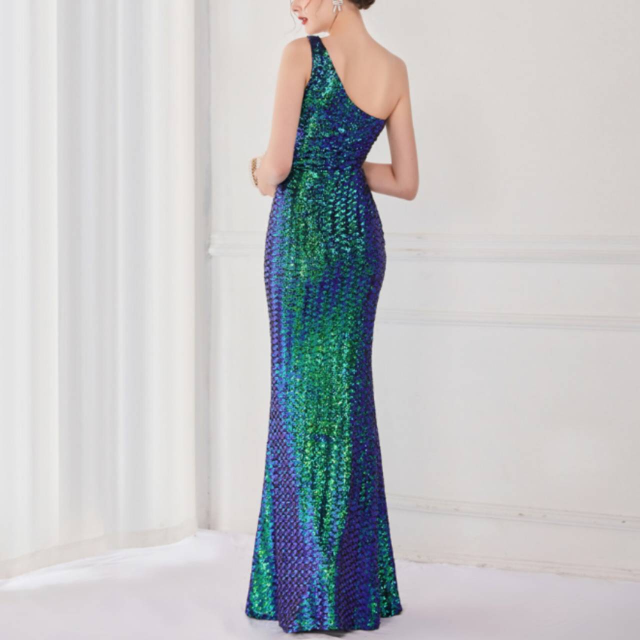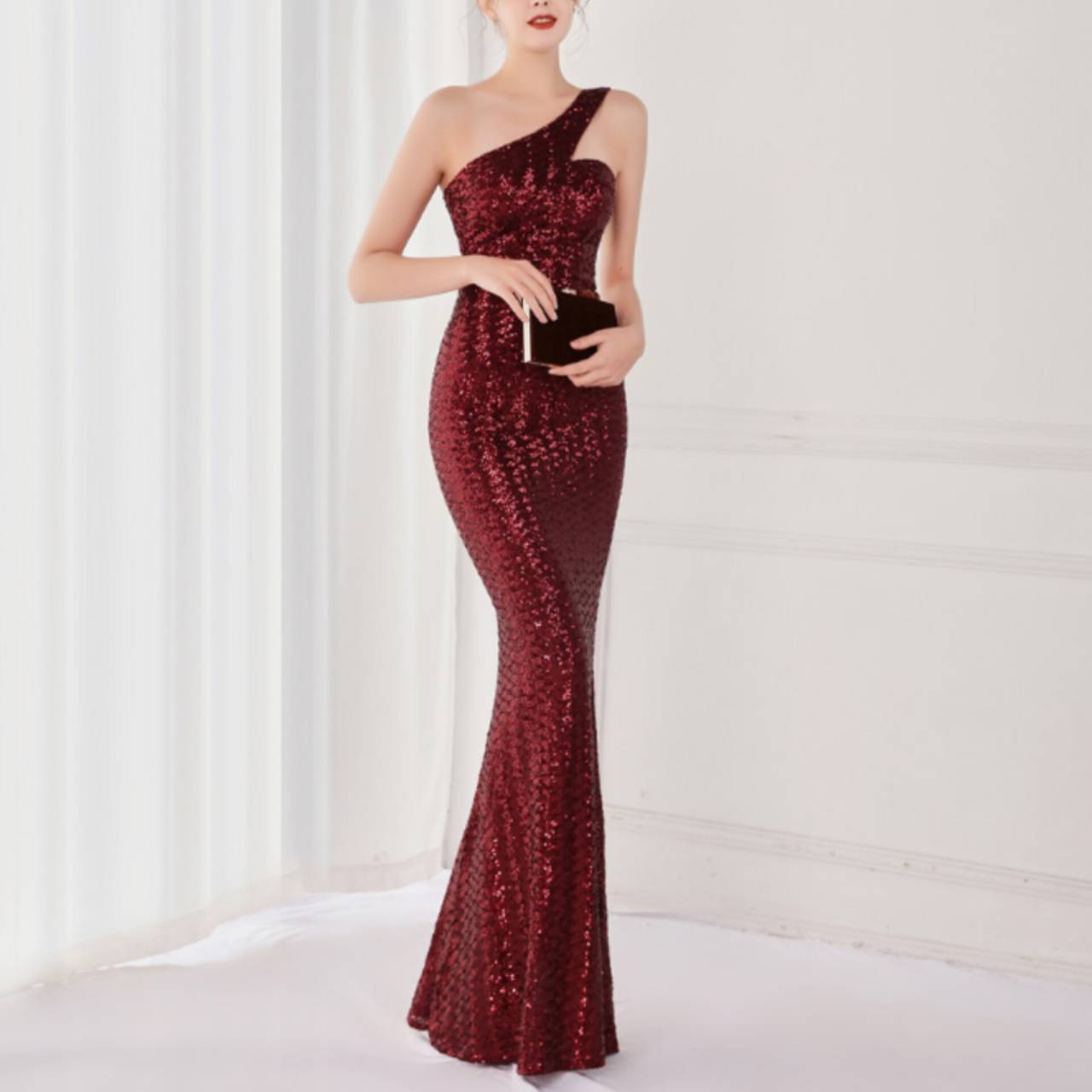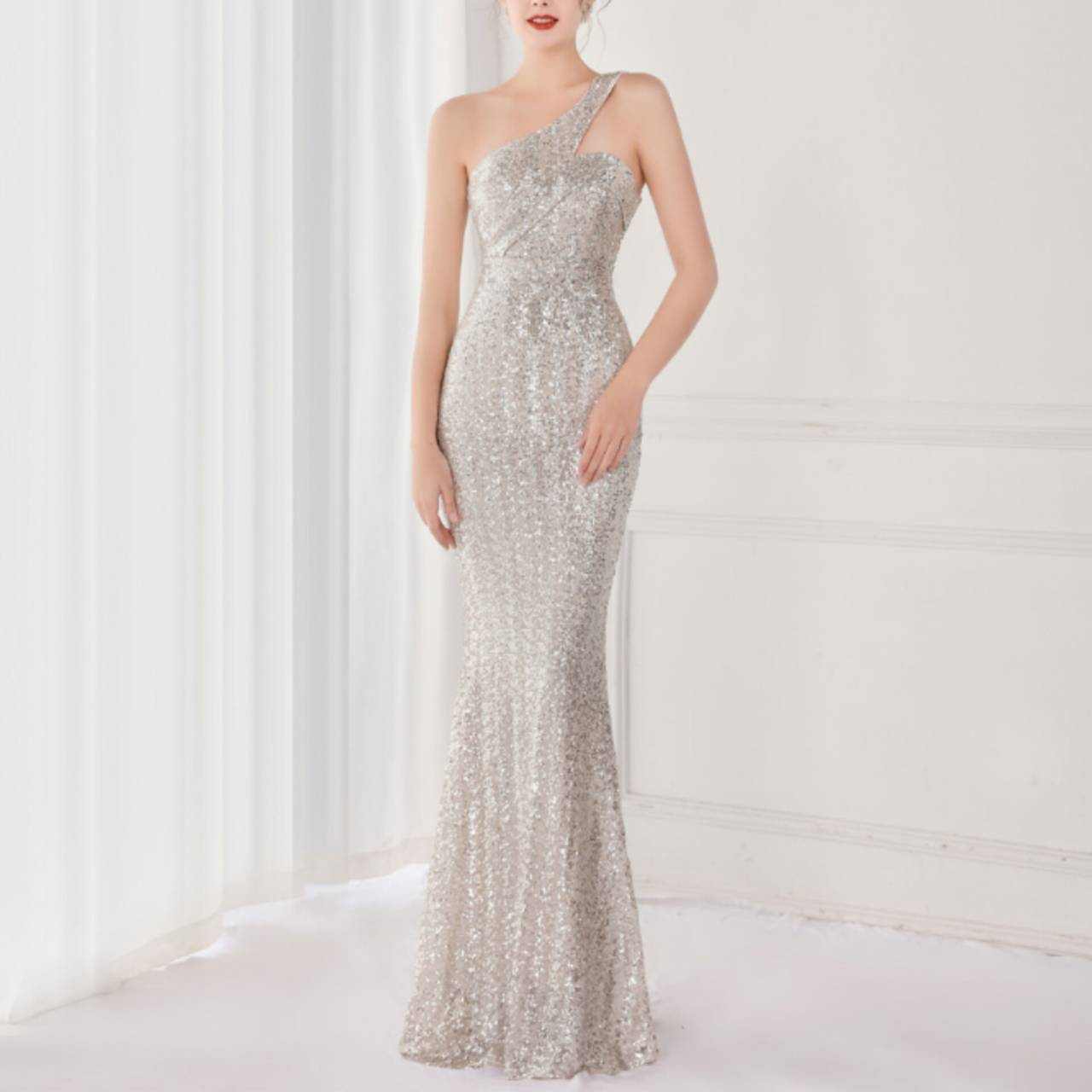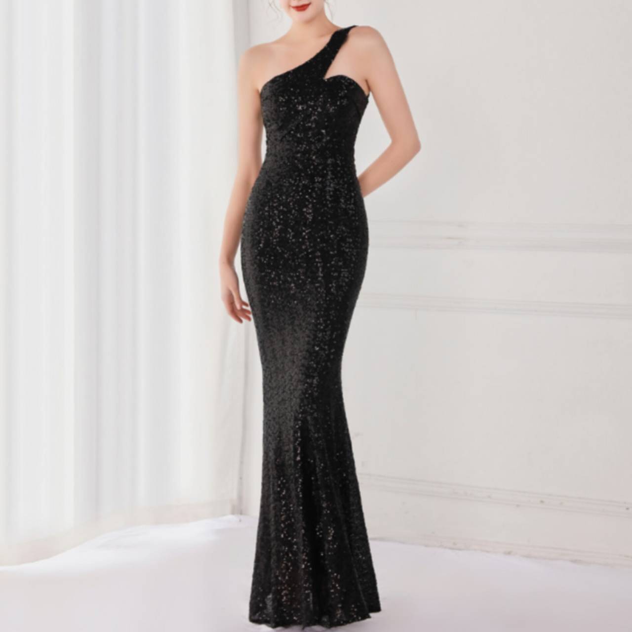 全8色 ドレス イブニングドレス 韓国ドレス キラキラ スパンコール ワンショルダー ハイウエスト マーメイド ロング アシンメトリー グリッター 美シルエット スタイルアップ S/2XL 韓国【K5358】