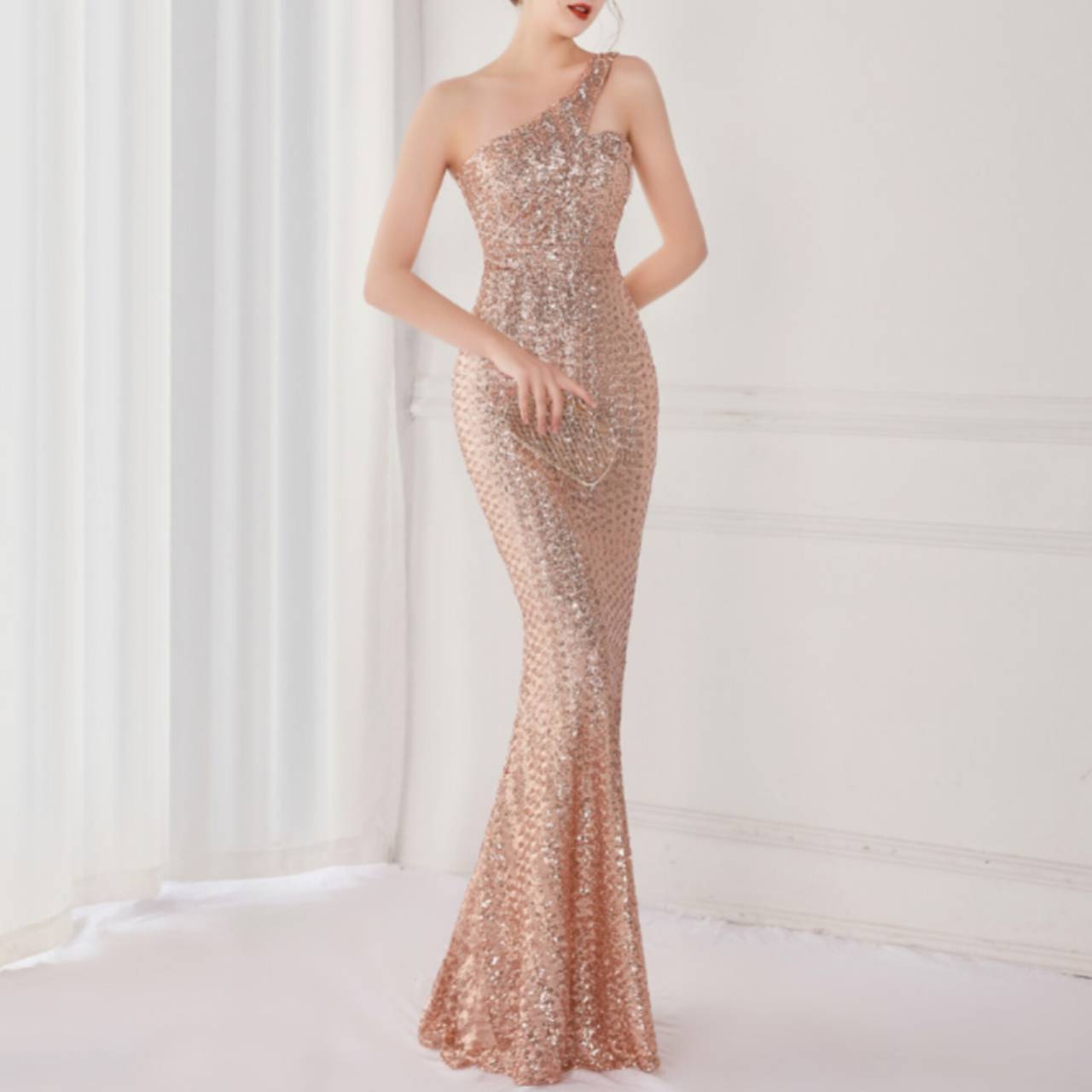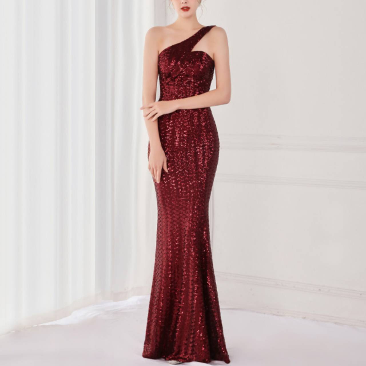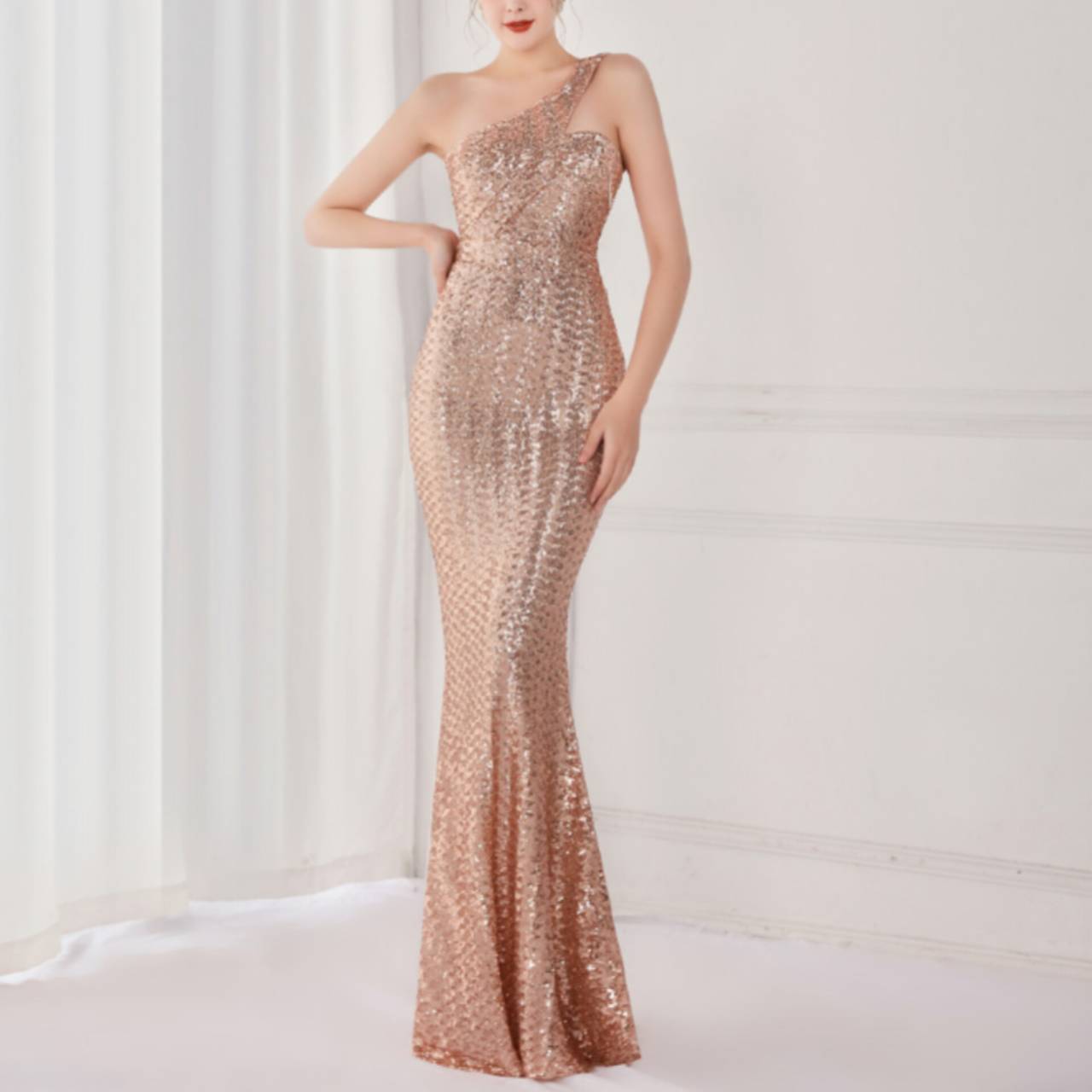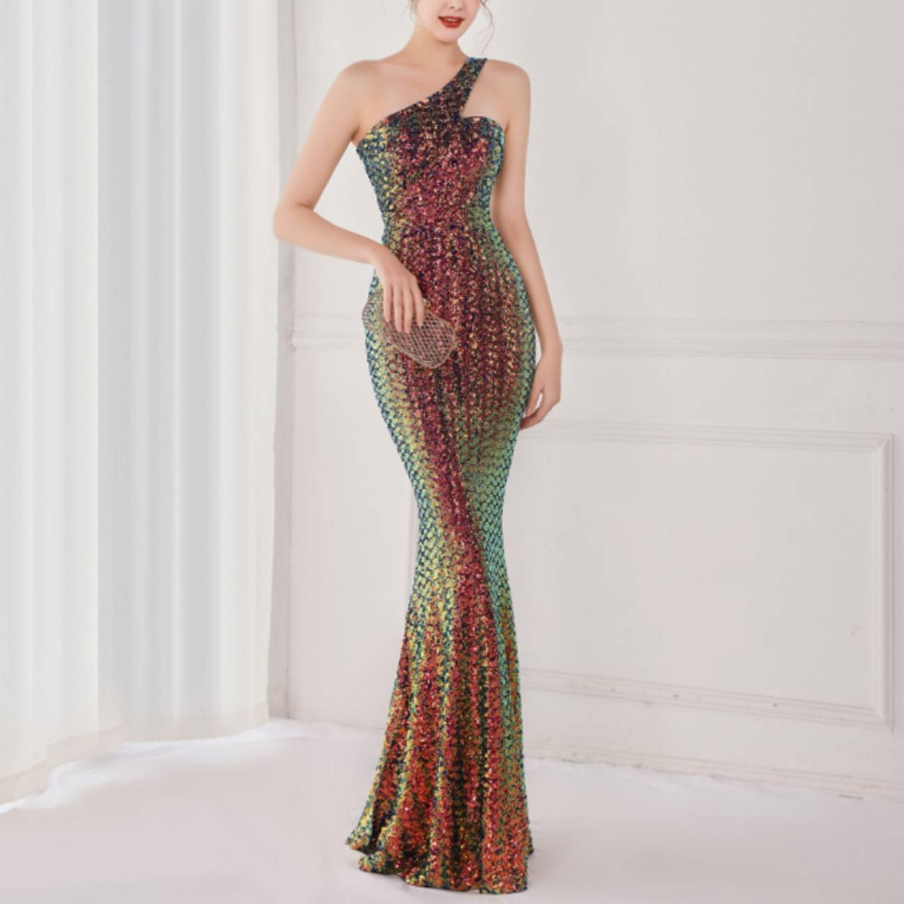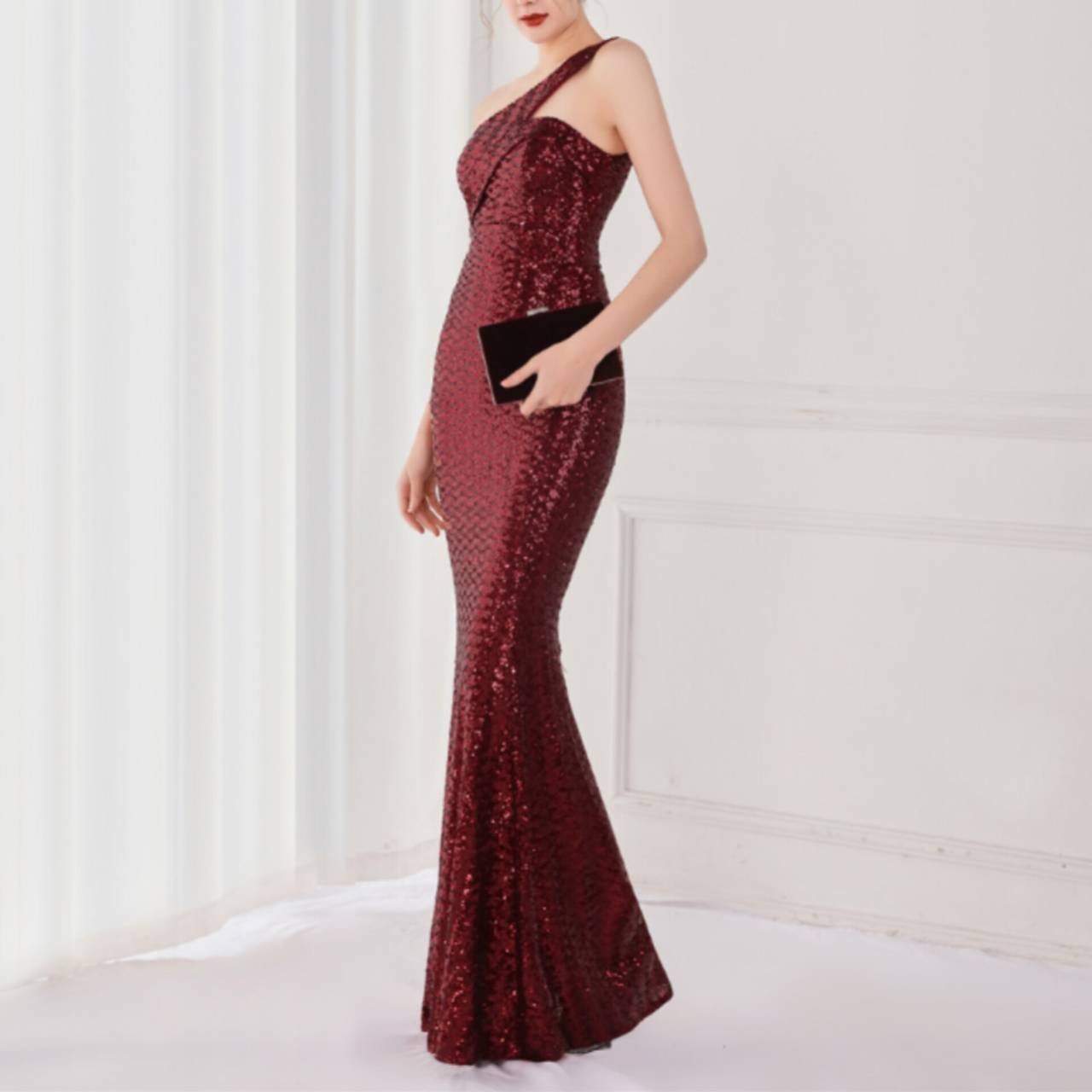 全8色 ドレス イブニングドレス 韓国ドレス キラキラ スパンコール ワンショルダー ハイウエスト マーメイド ロング アシンメトリー グリッター 美シルエット スタイルアップ S/2XL 韓国【K5358】