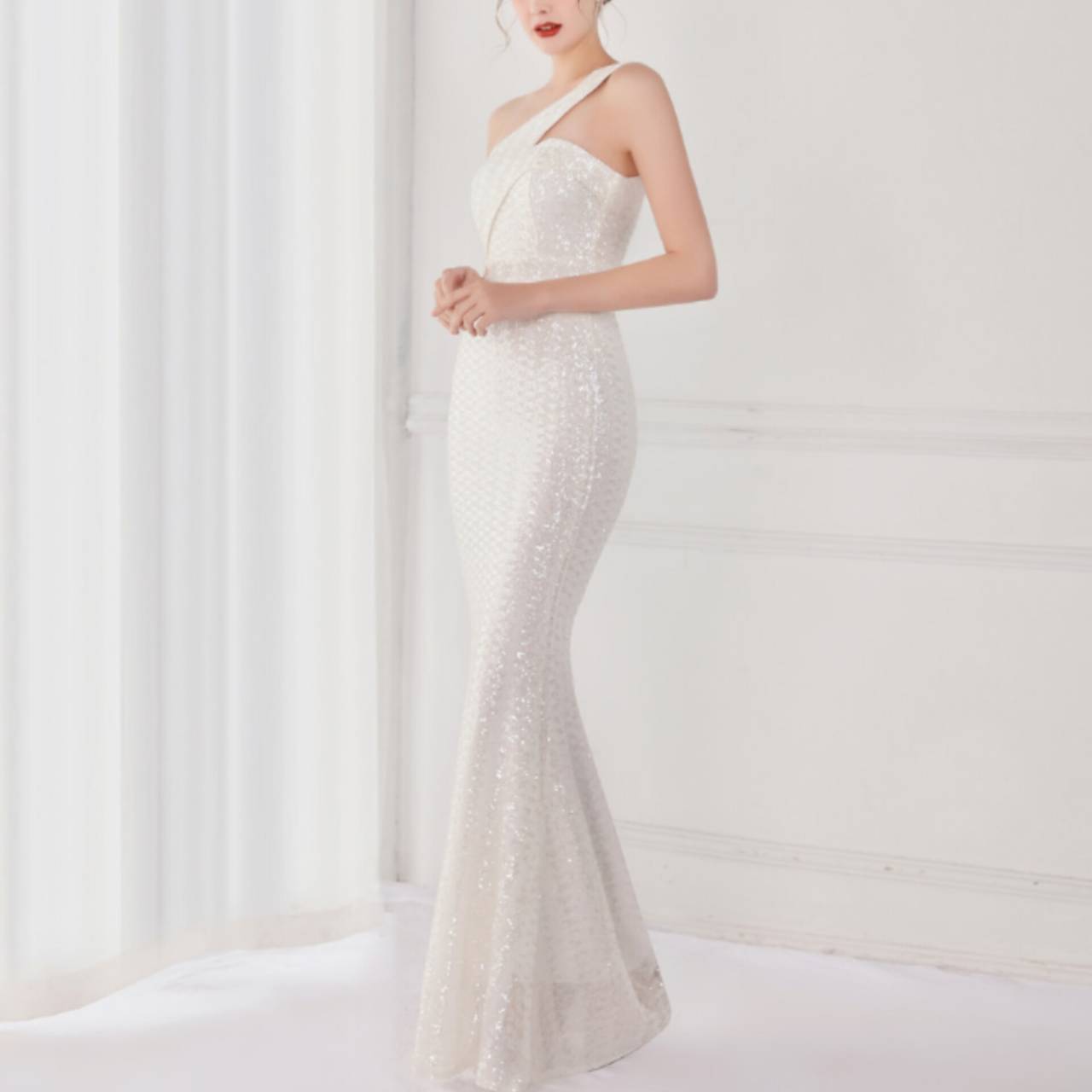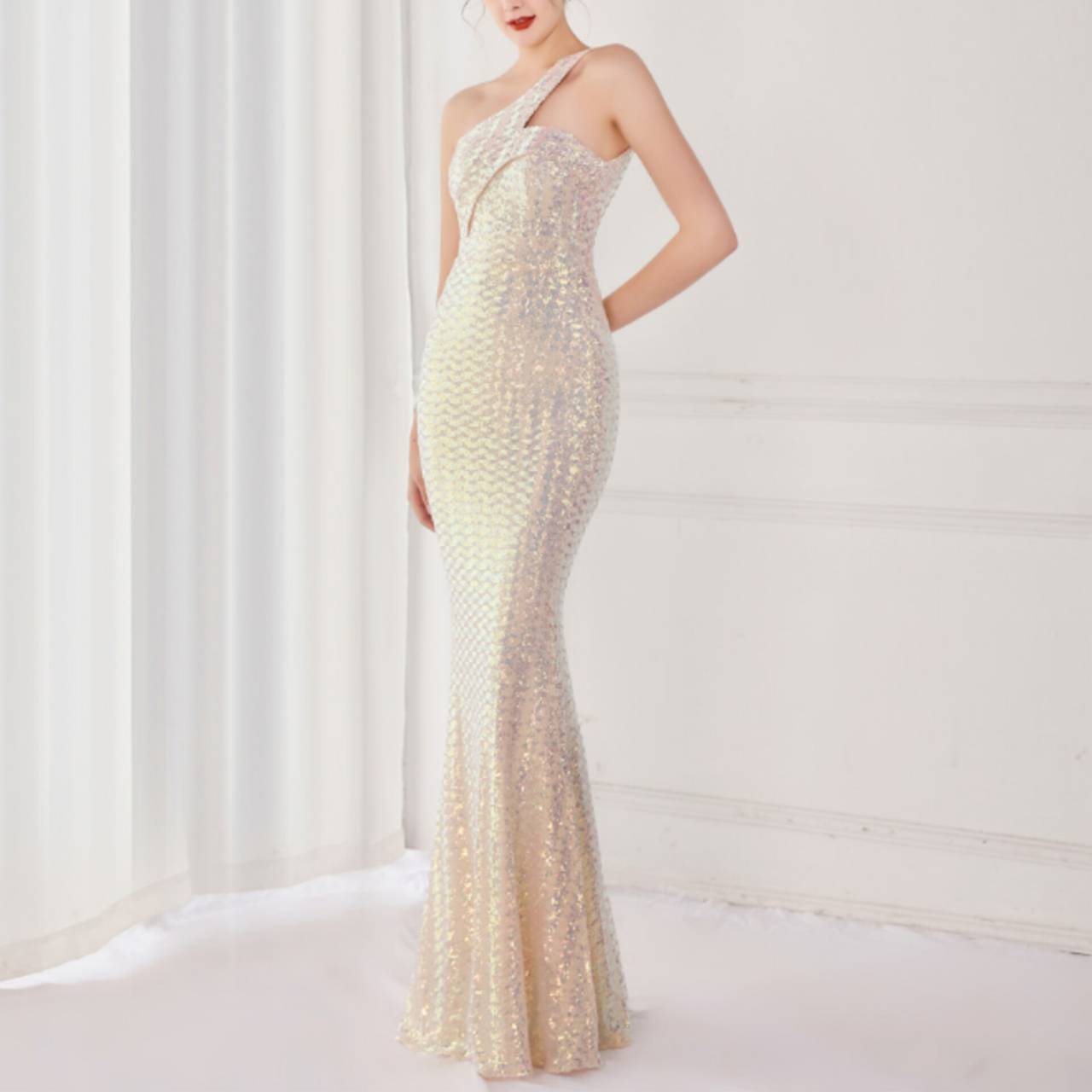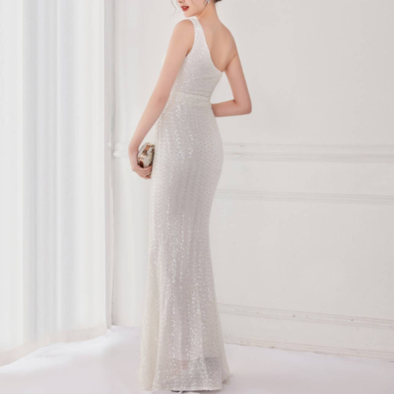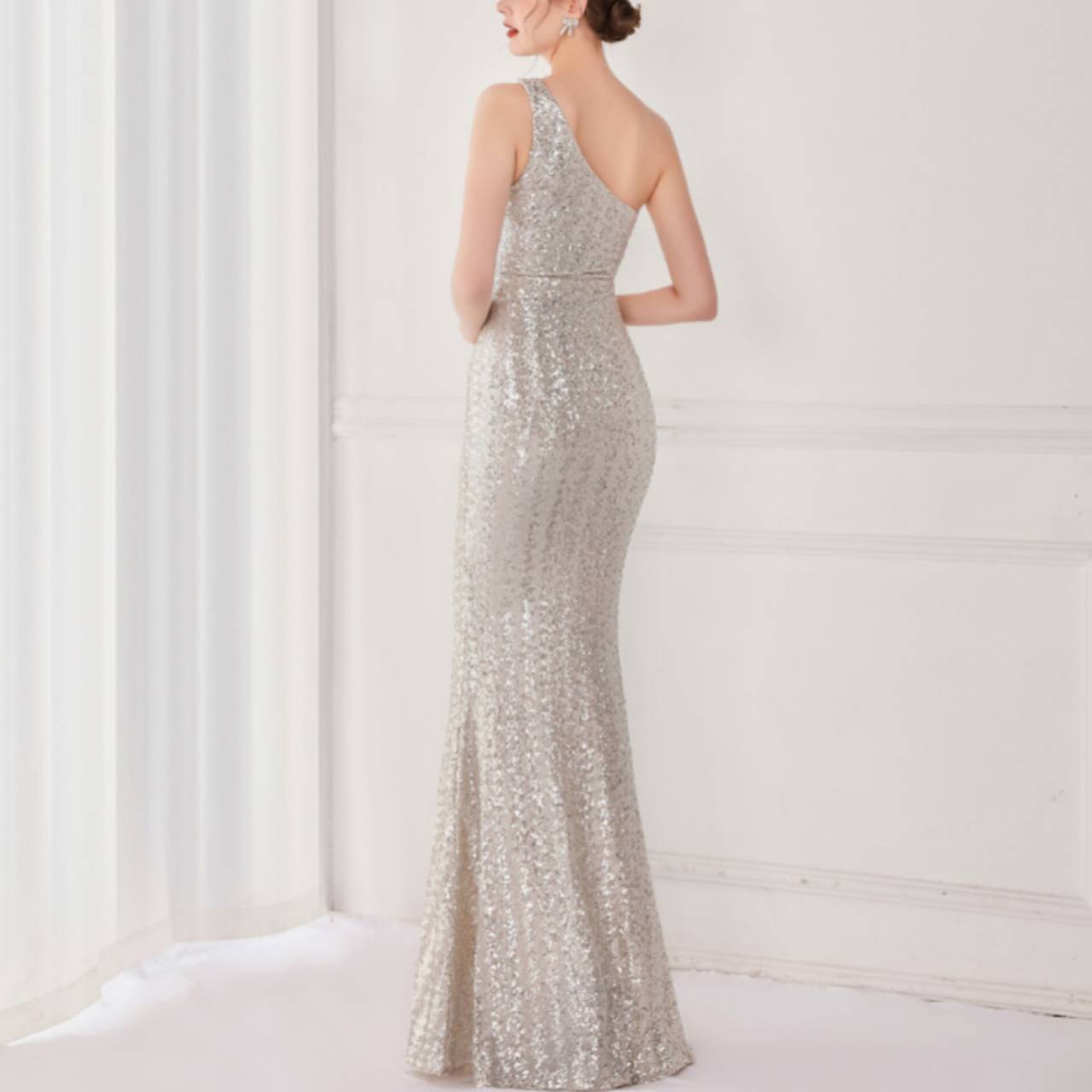 一瞬で主役を奪う、ラグジュアリー・ワンショルダードレス。特別な夜にふさわしい存在感を演出するため、このドレスは高密度グリッター素材を贅沢に使用。