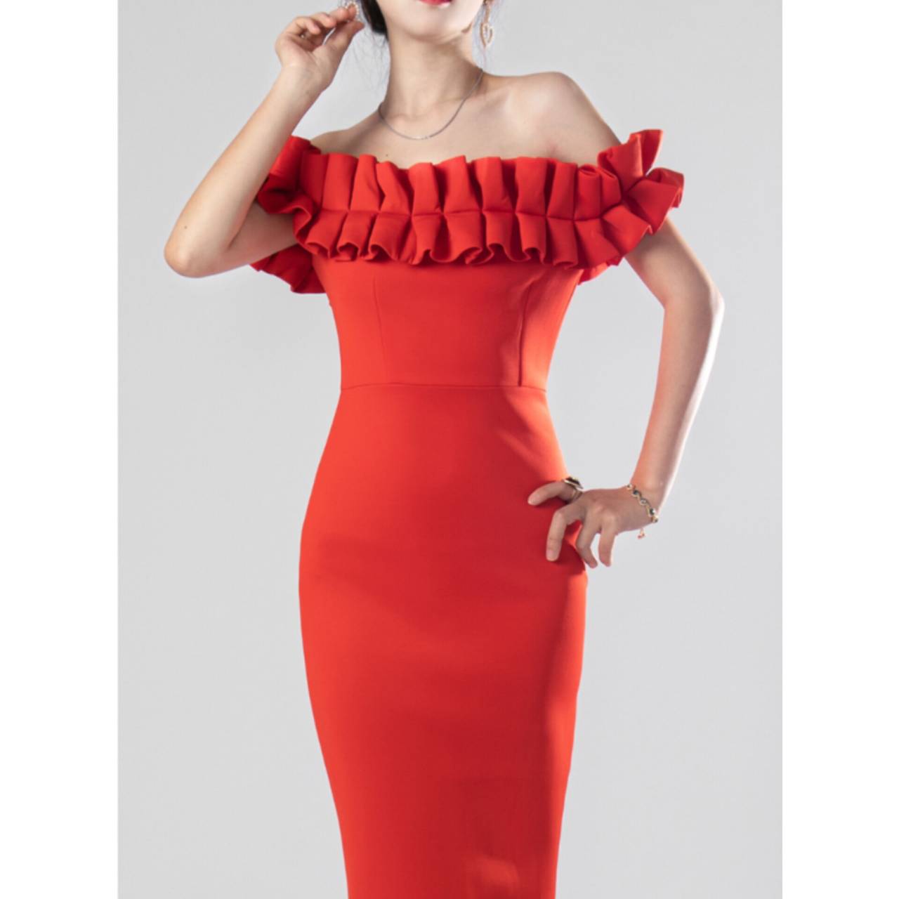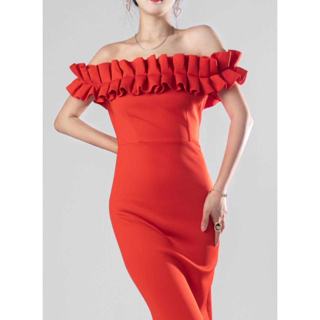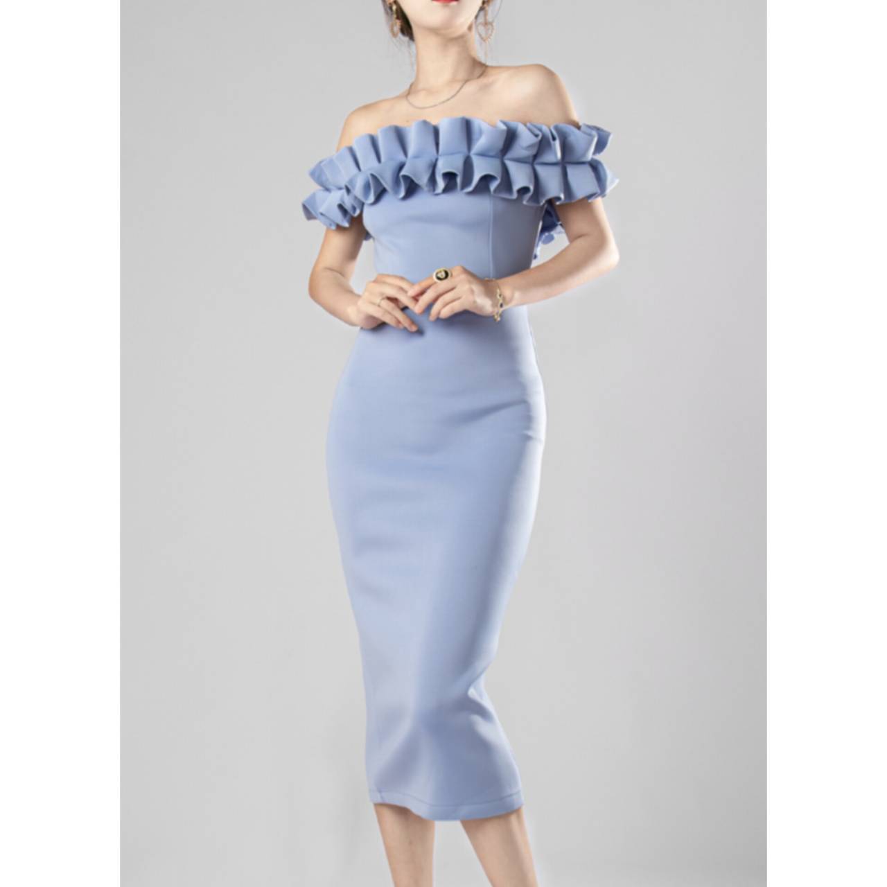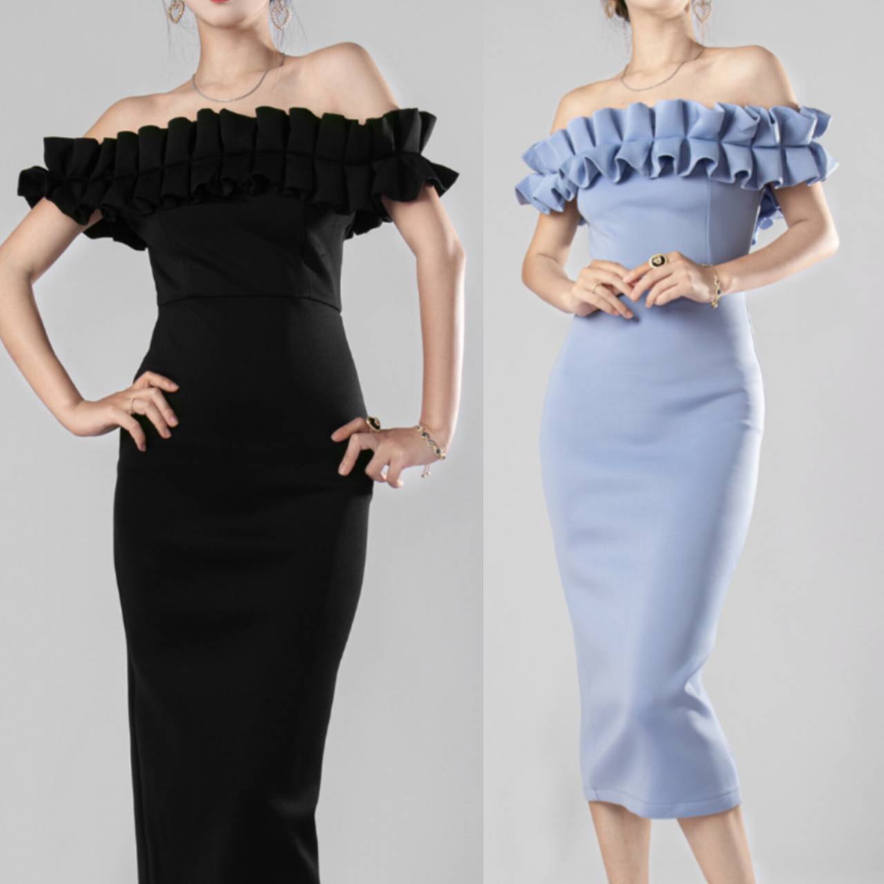 全5色 オフショルダー ドレス 韓国ドレス フリルスリーブ 3Dフリル 立体フリル ハイウエスト ミモレ丈 タイト Iライン 美シルエット 大人 XS/L 韓国【K10029】