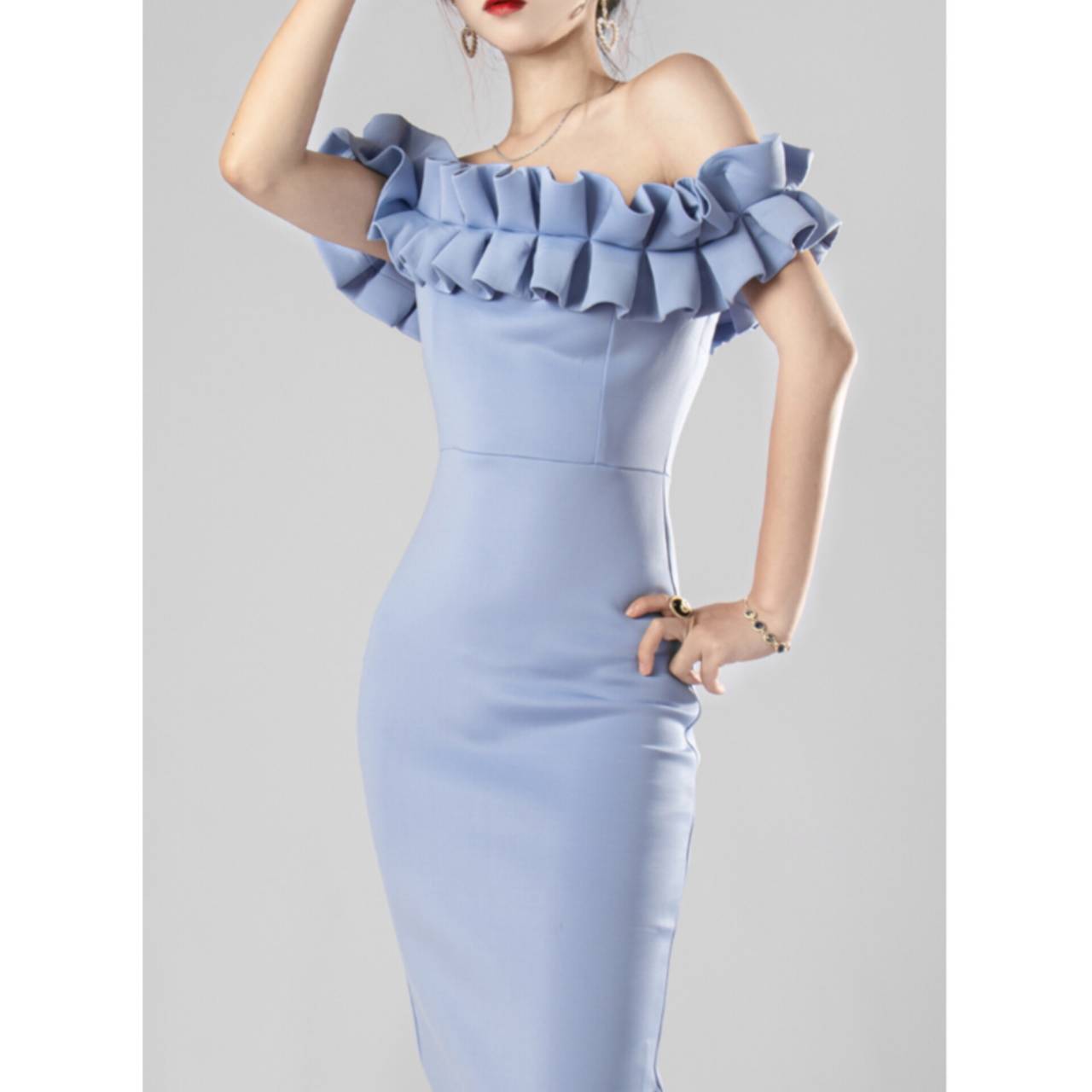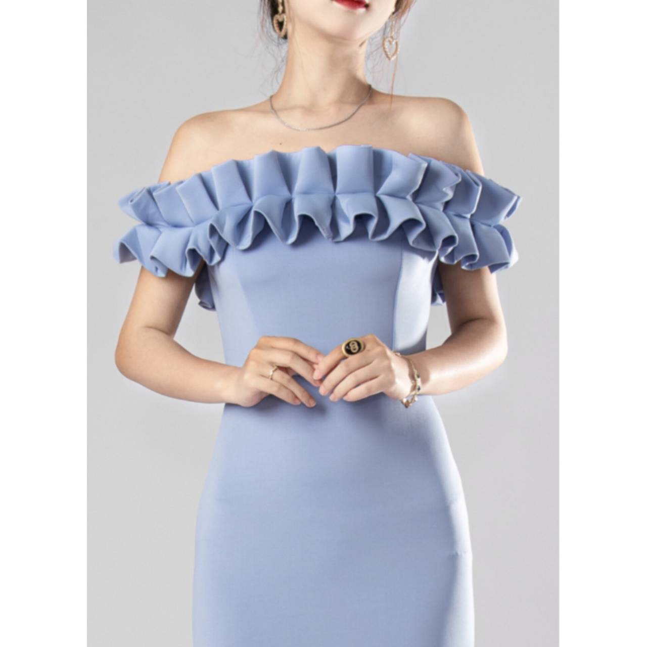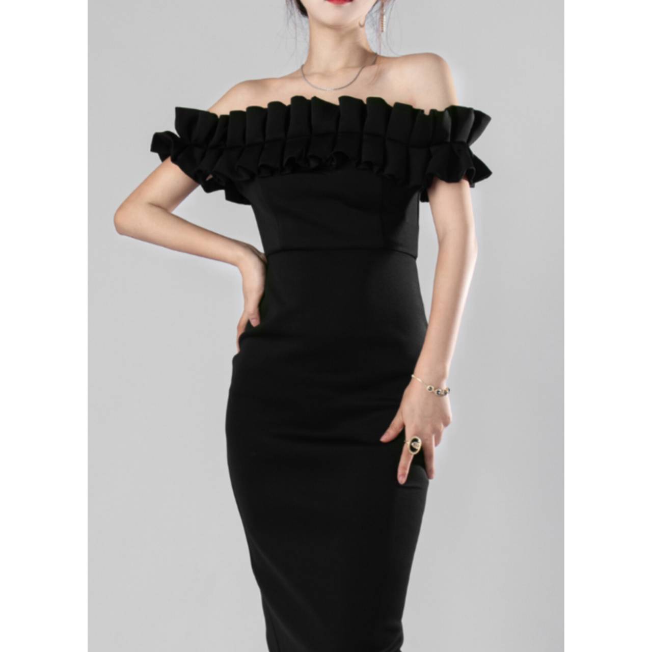 全5色 オフショルダー ドレス 韓国ドレス フリルスリーブ 3Dフリル 立体フリル ハイウエスト ミモレ丈 タイト Iライン 美シルエット 大人 XS/L 韓国【K10029】