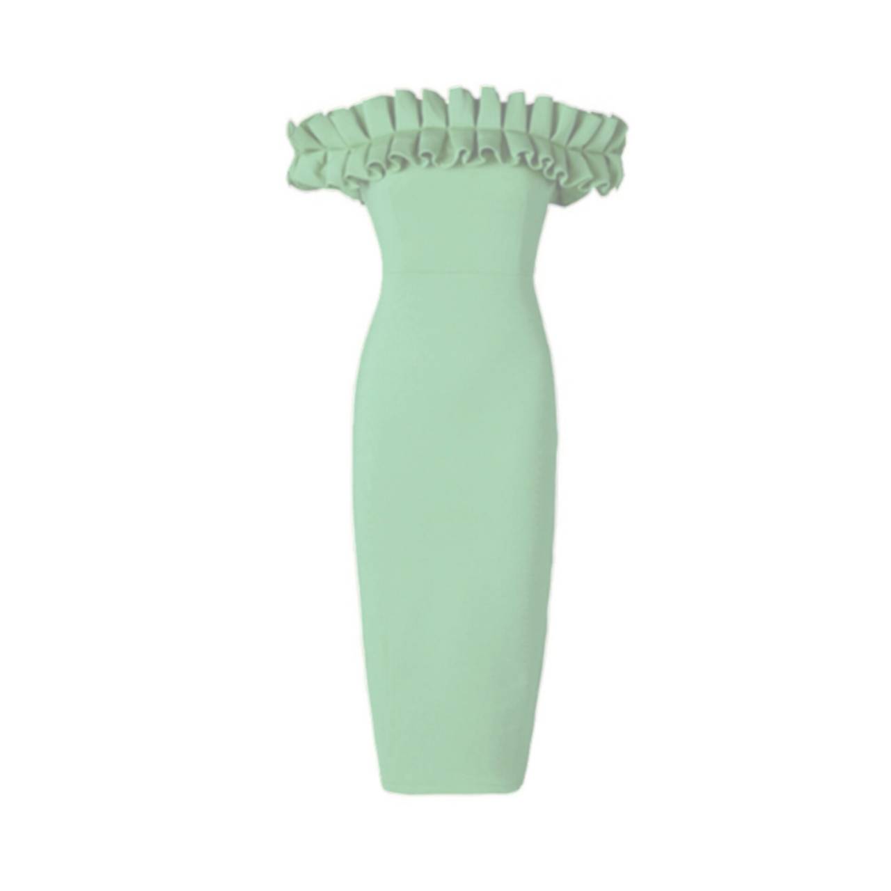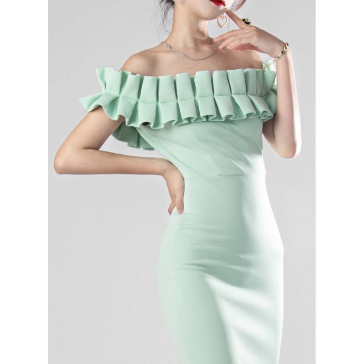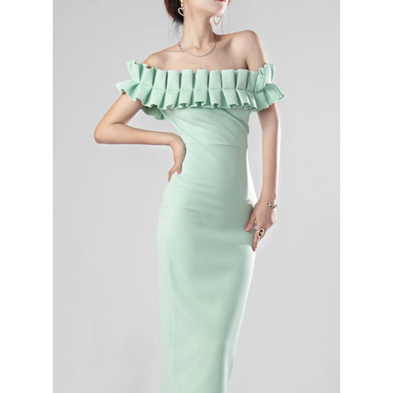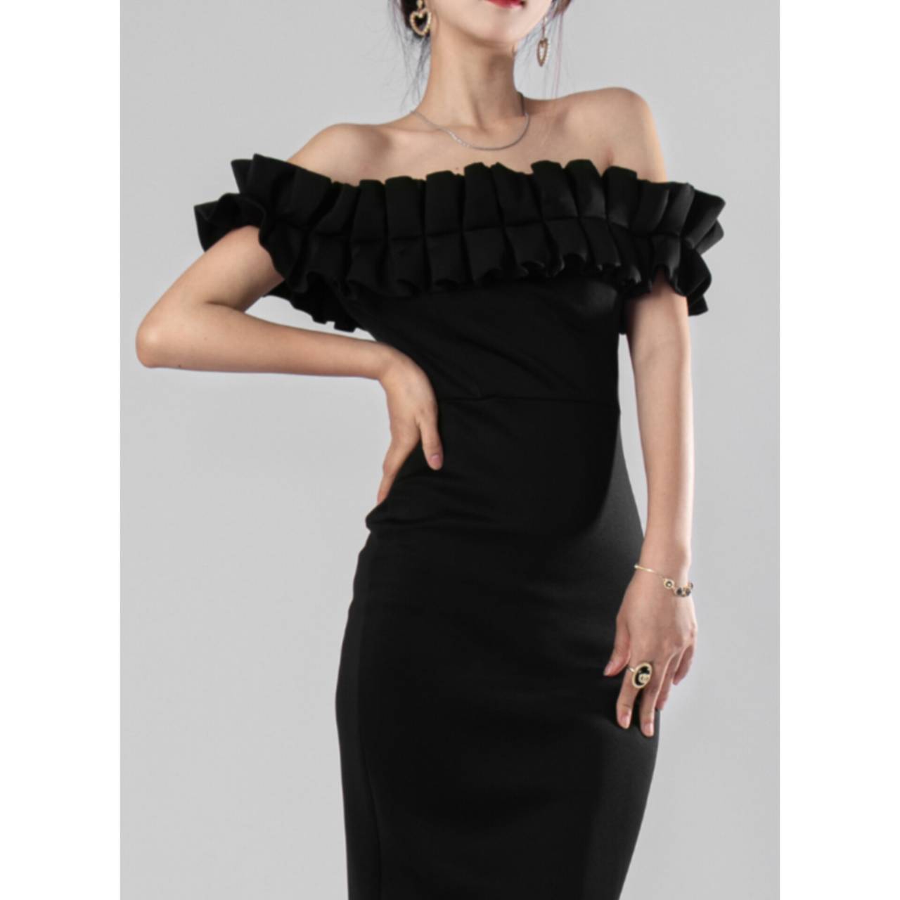 全5色 オフショルダー ドレス 韓国ドレス フリルスリーブ 3Dフリル 立体フリル ハイウエスト ミモレ丈 タイト Iライン 美シルエット 大人 XS/L 韓国【K10029】