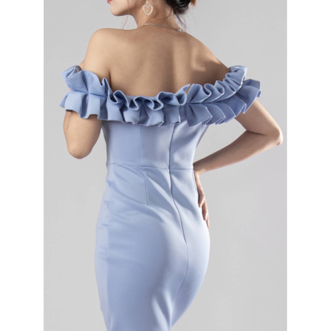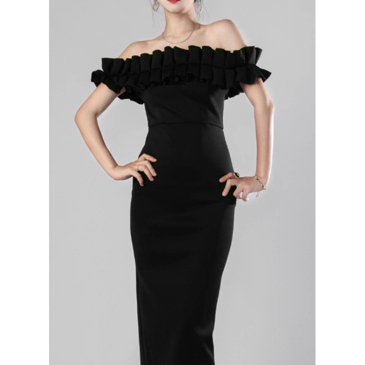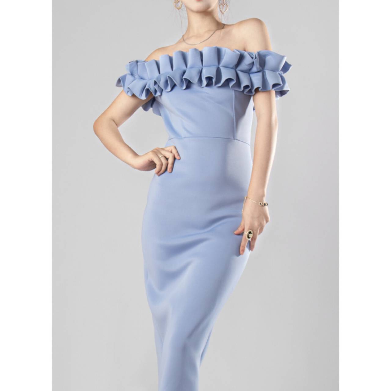 上半身に視線を集め、誰よりも華やかに、誰よりも細く。華やかな存在感を放つオフショルダーの大判フリルが特徴の、上質ストレッチ素材ドレス。