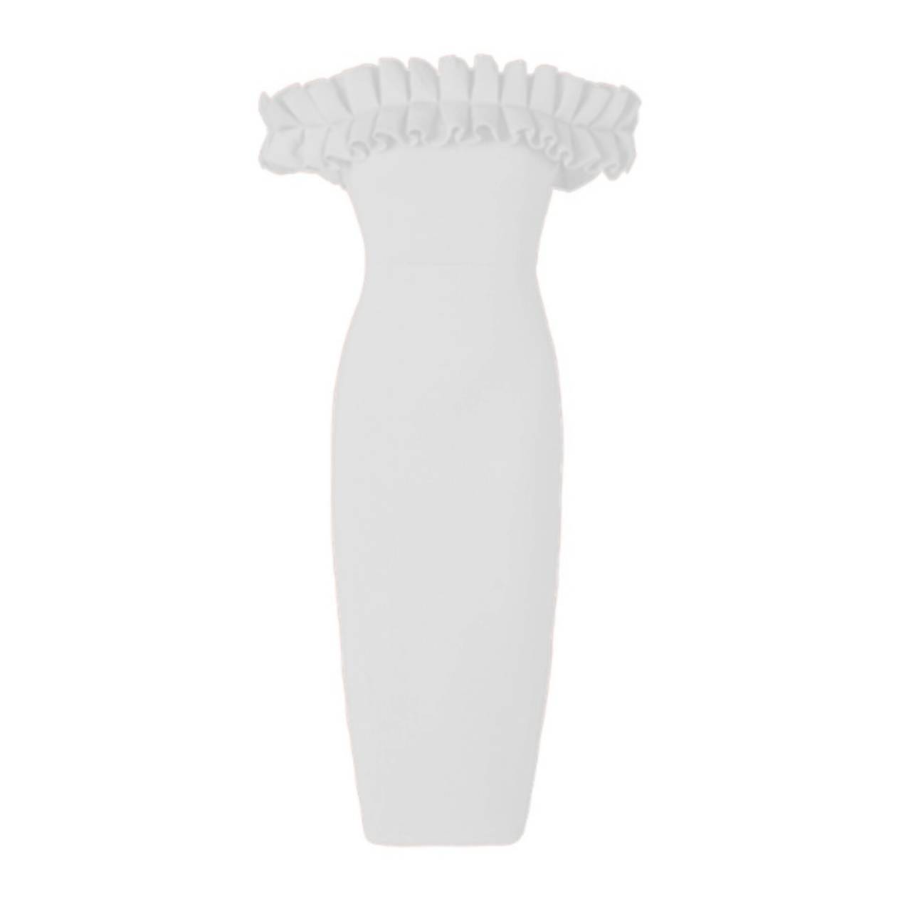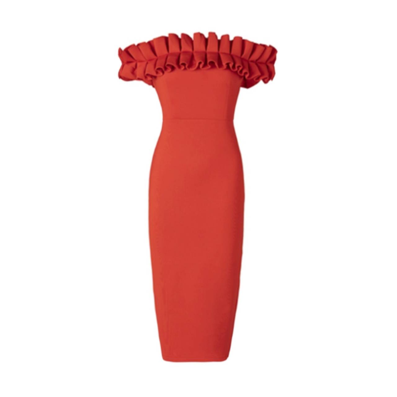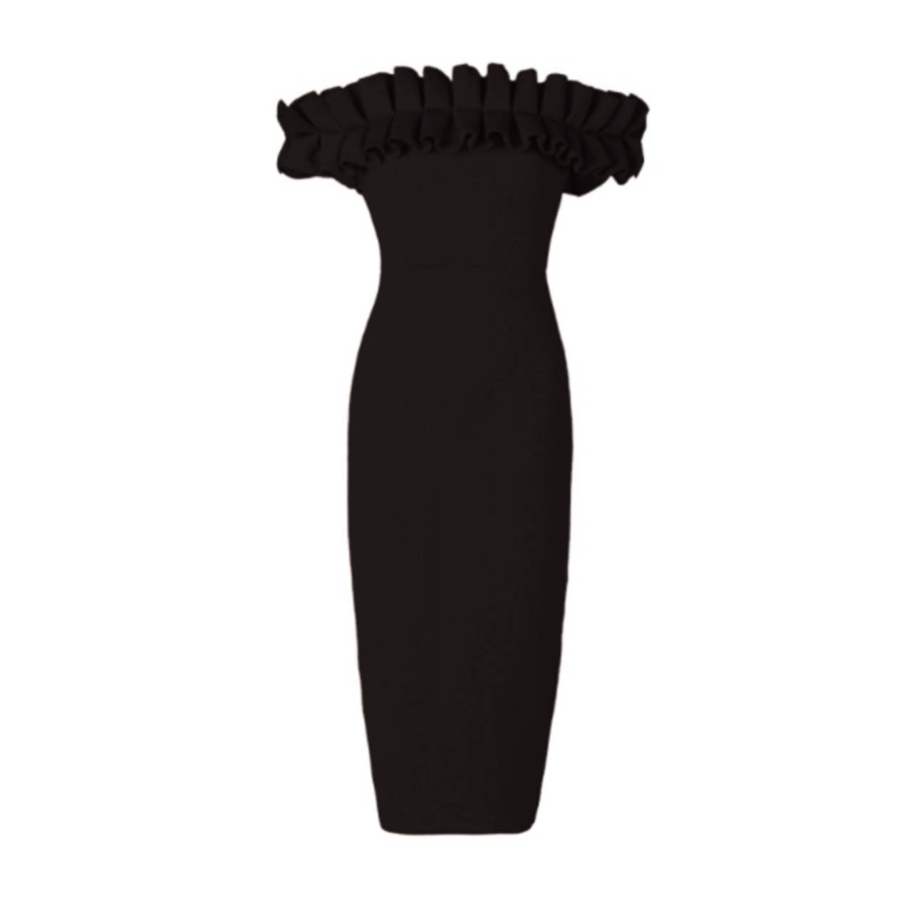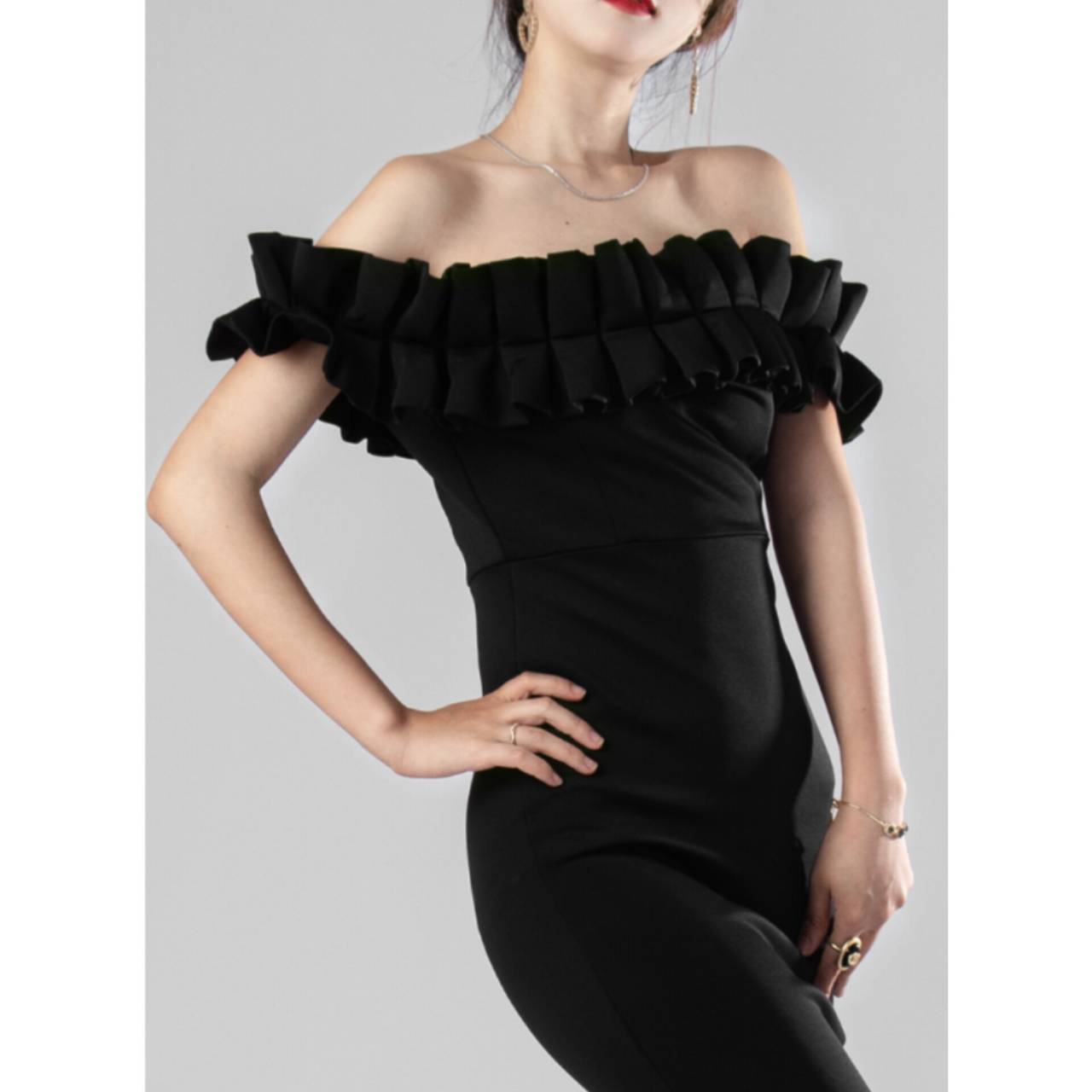 上半身に視線を集め、誰よりも華やかに、誰よりも細く。華やかな存在感を放つオフショルダーの大判フリルが特徴の、上質ストレッチ素材ドレス。
