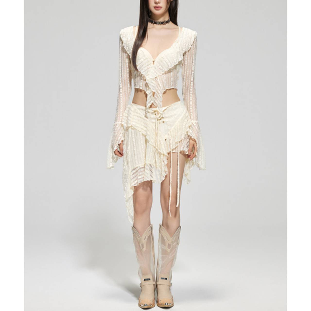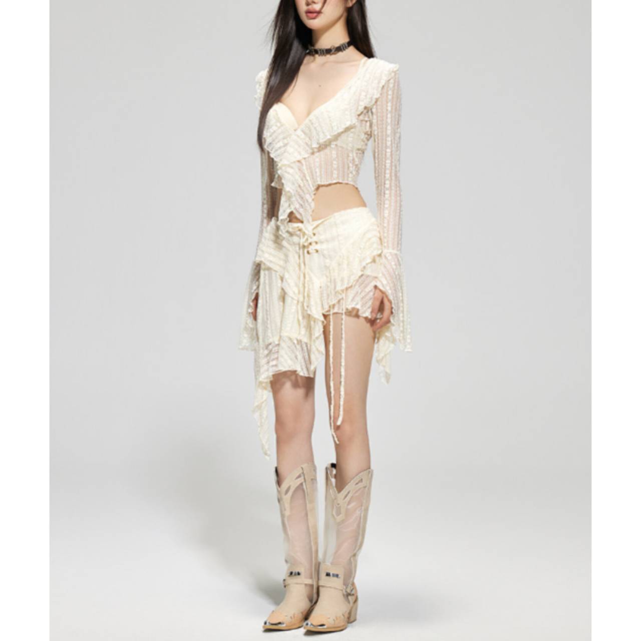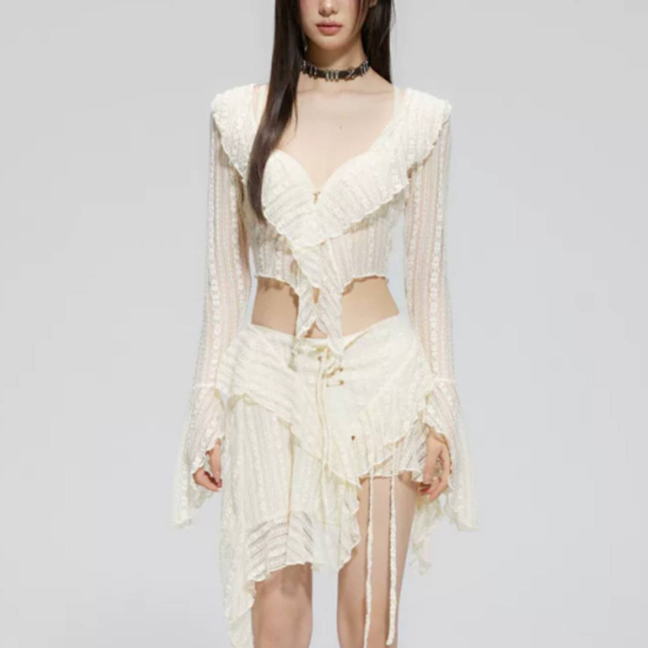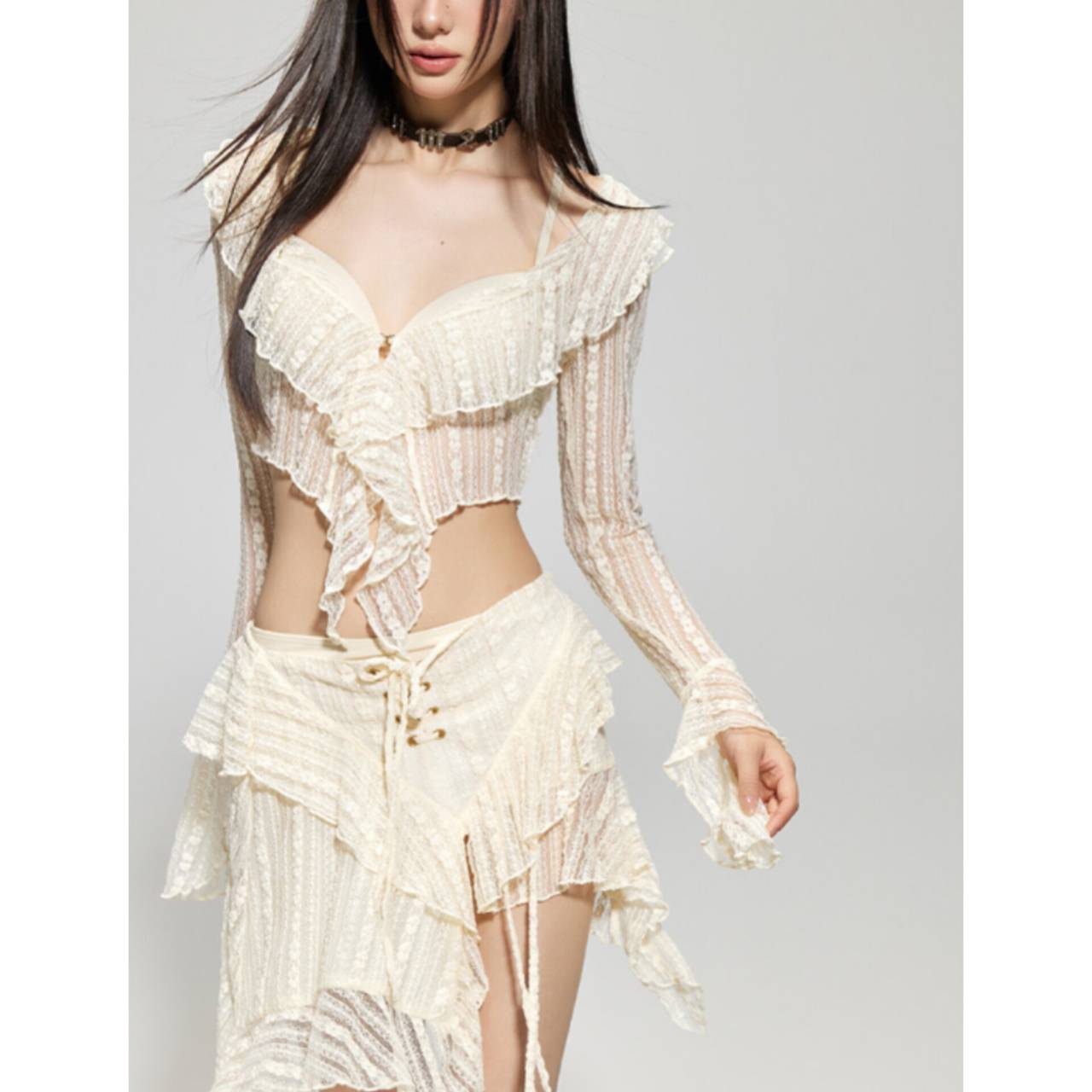 セットアップ 水着 ビキニ セパレート水着 韓国水着 セットアップ水着 長袖 ロングスリーブ カバーアップ 深Vネック シアー フリル クロスデザイン パレオ レースアップ ミニスカート シースルー アシンメトリー スタイルアップ 体型カバー 日焼け防止 M/XL 韓国【K10897】