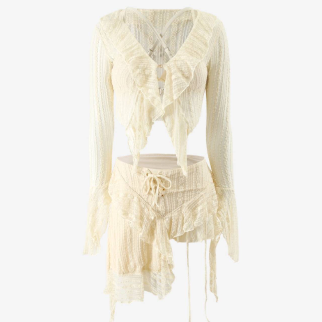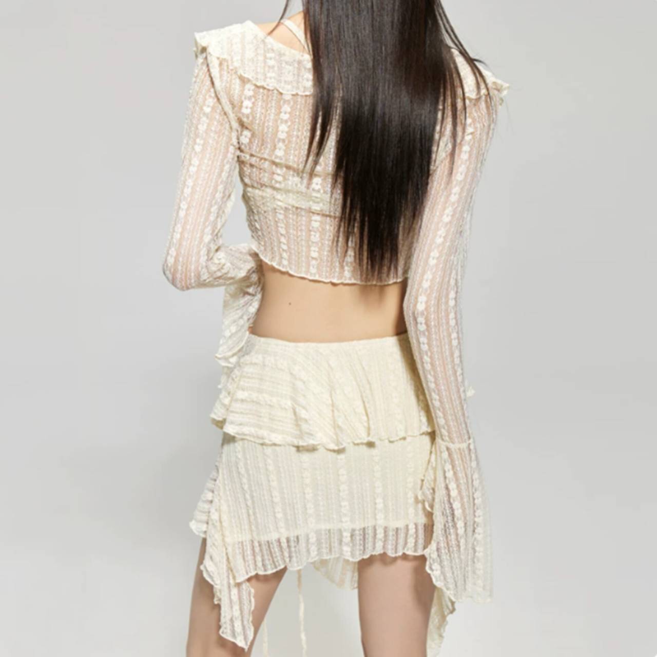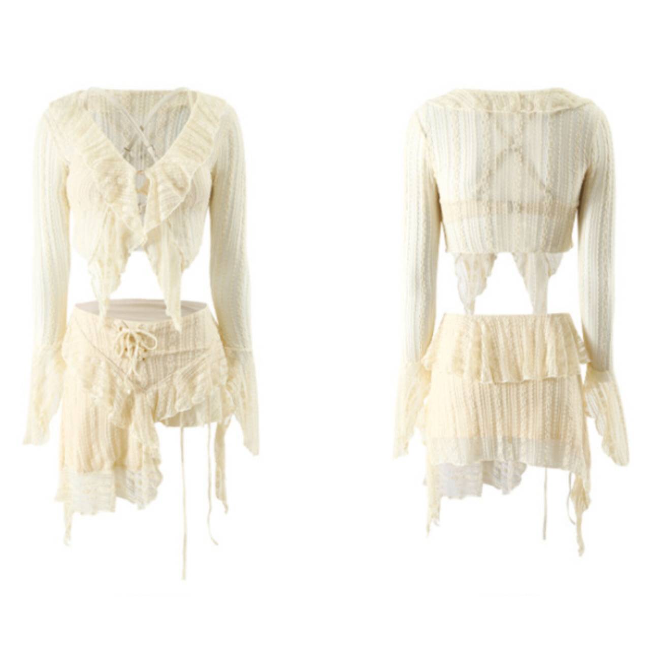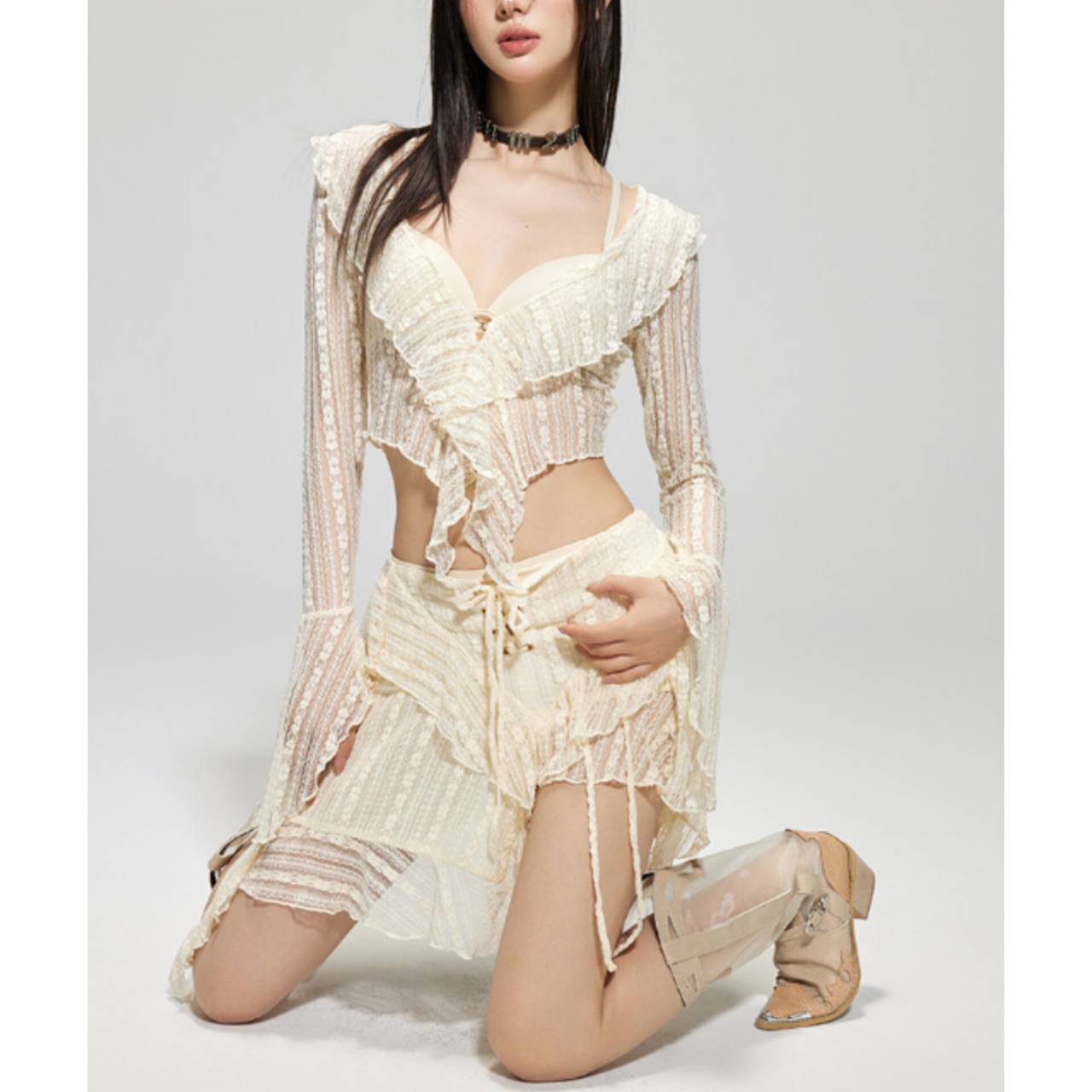 セットアップ 水着 ビキニ セパレート水着 韓国水着 セットアップ水着 長袖 ロングスリーブ カバーアップ 深Vネック シアー フリル クロスデザイン パレオ レースアップ ミニスカート シースルー アシンメトリー スタイルアップ 体型カバー 日焼け防止 M/XL 韓国【K10897】