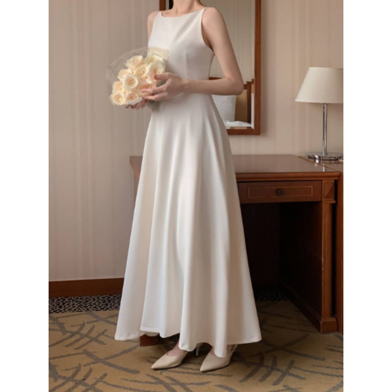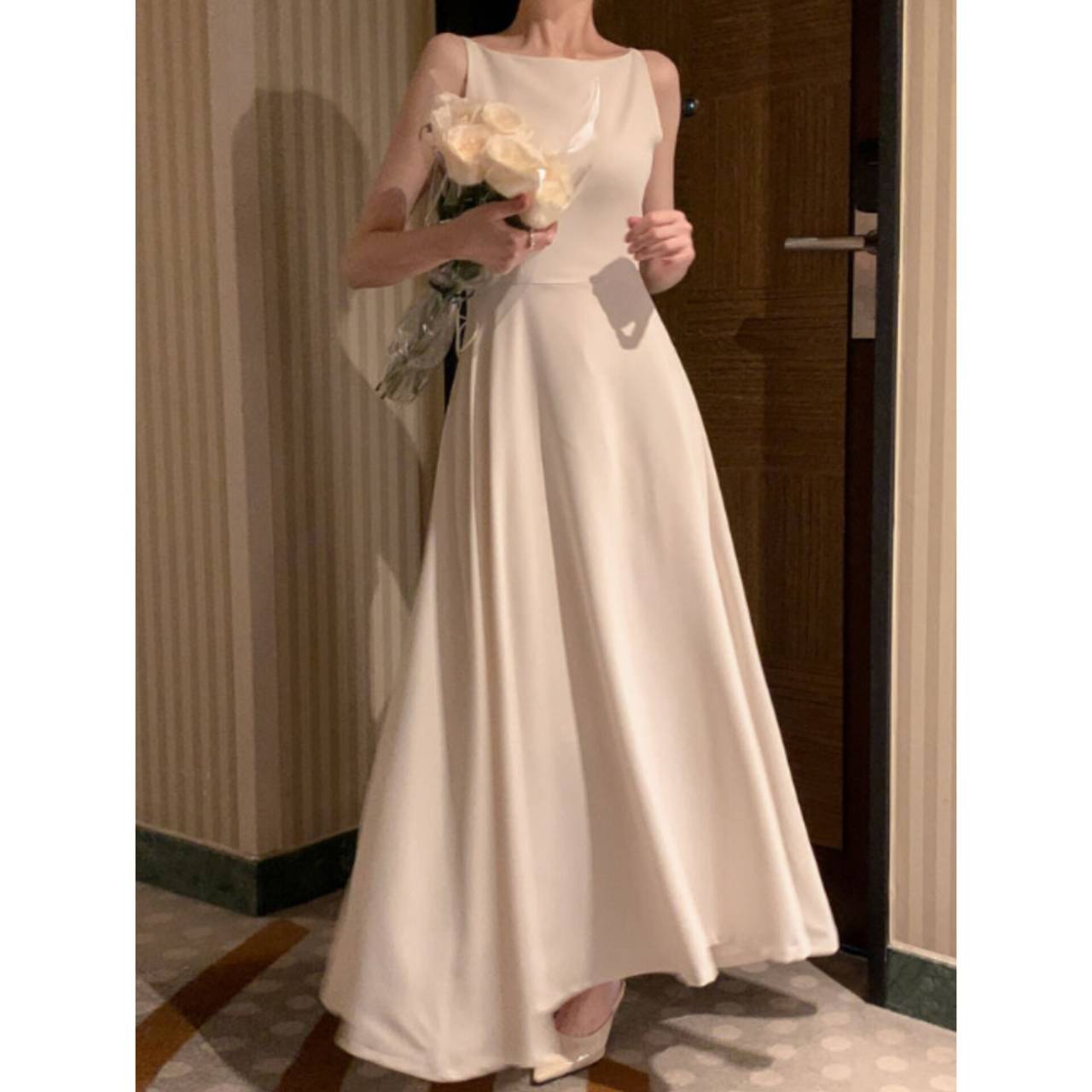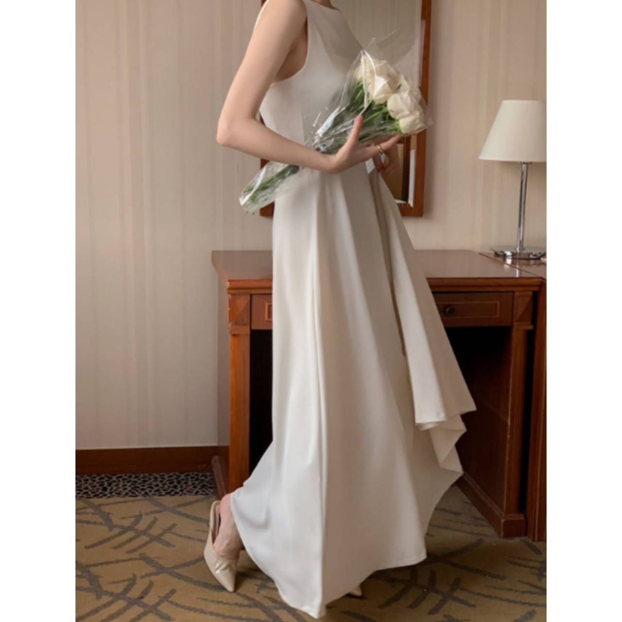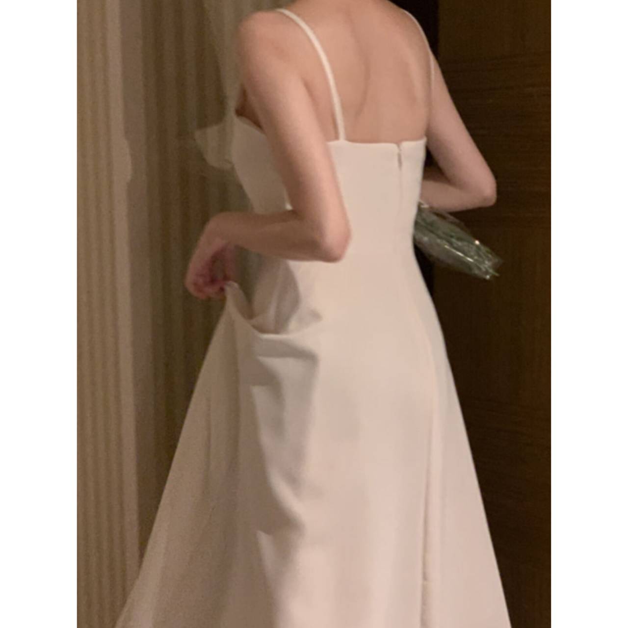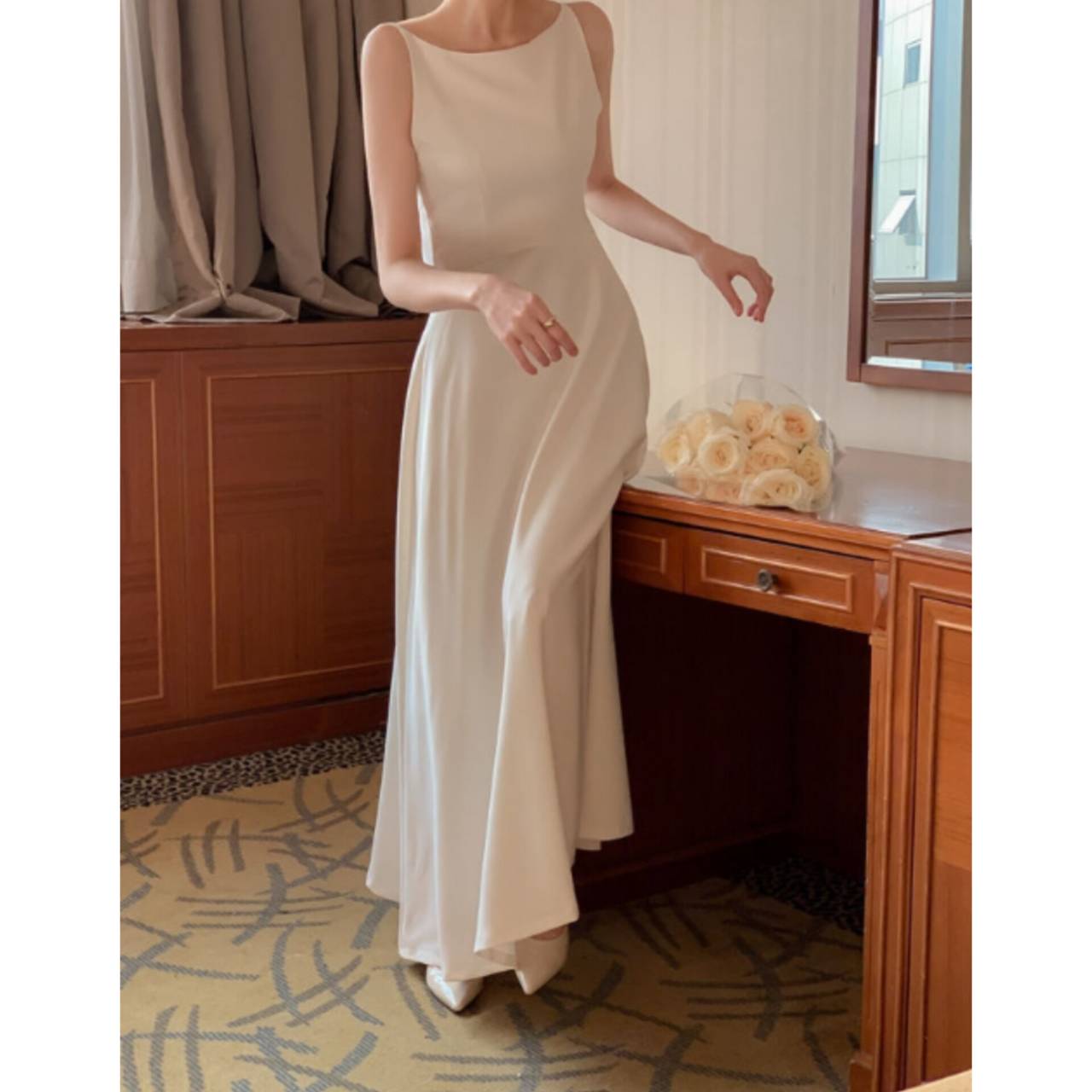 歩くたびに揺れるスカートラインは、写真でも動画でも美しく映え、特別な一日をより印象的に。背中はすっきりとしたバックスタイルで、後ろ姿まで抜かりなく。