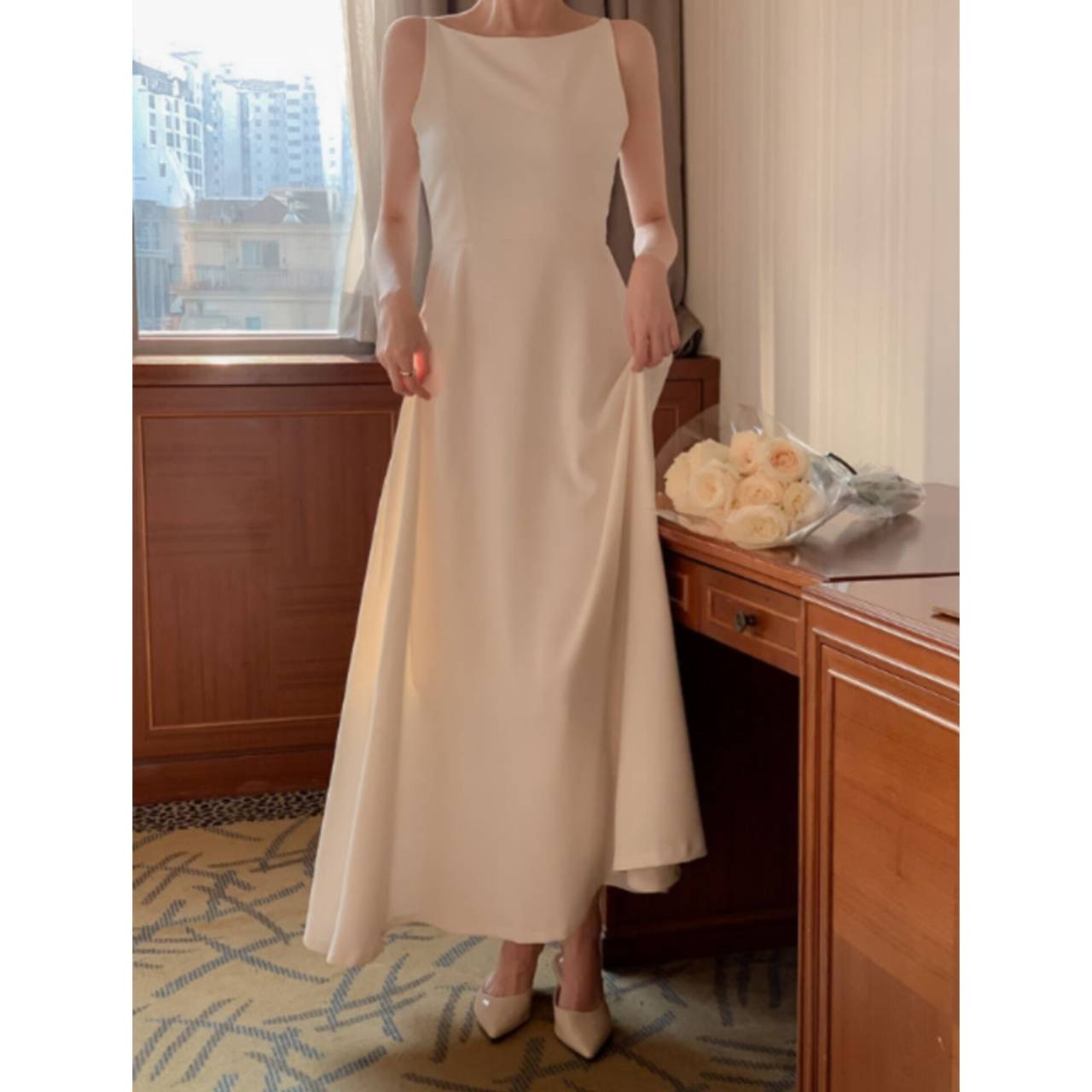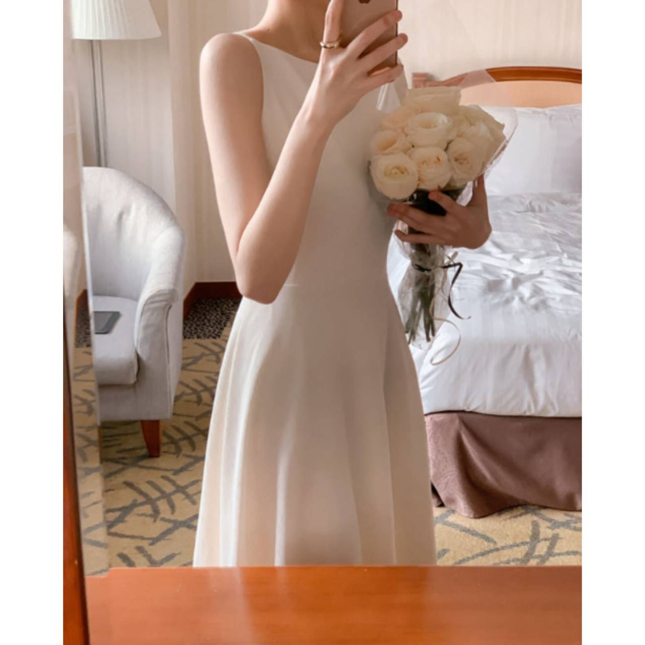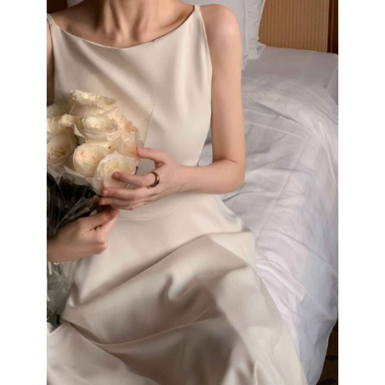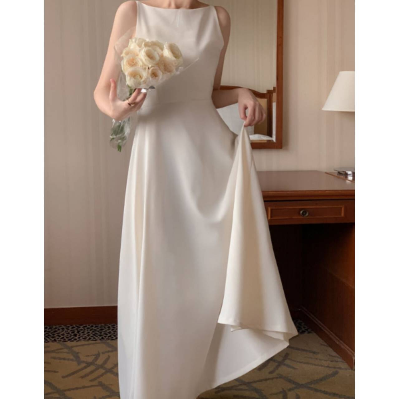 歩くたびに揺れるスカートラインは、写真でも動画でも美しく映え、特別な一日をより印象的に。背中はすっきりとしたバックスタイルで、後ろ姿まで抜かりなく。