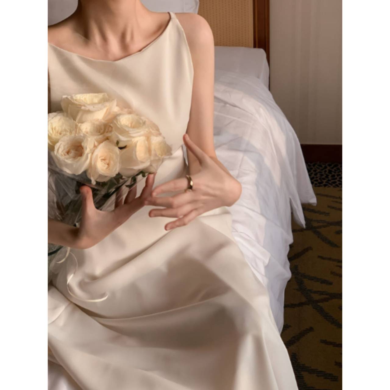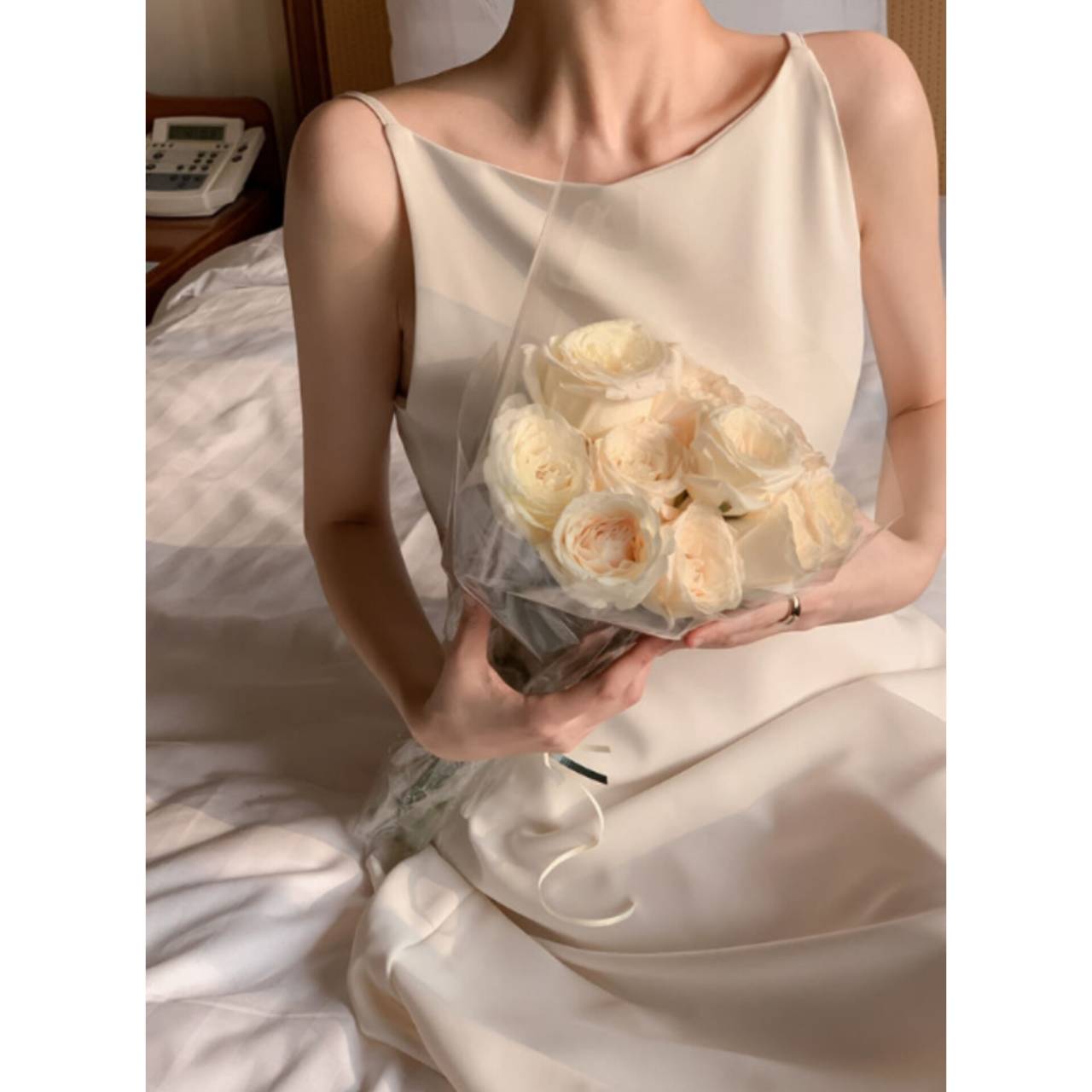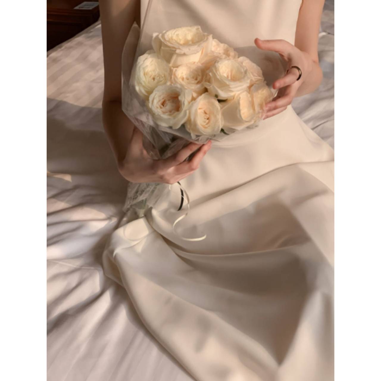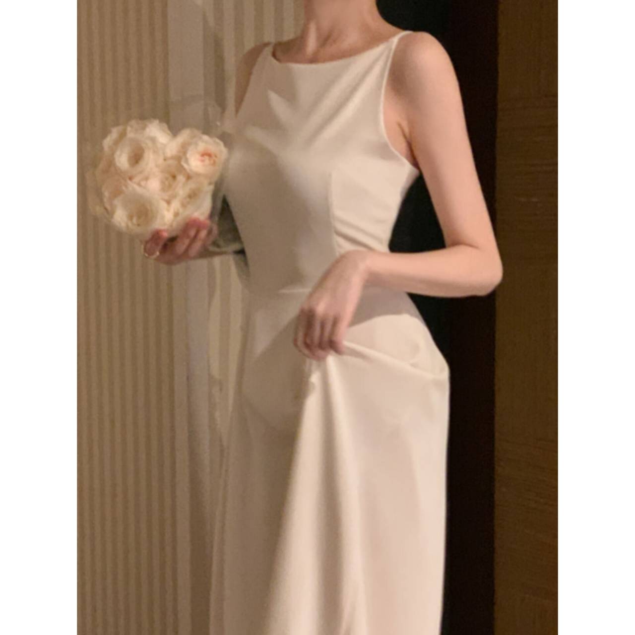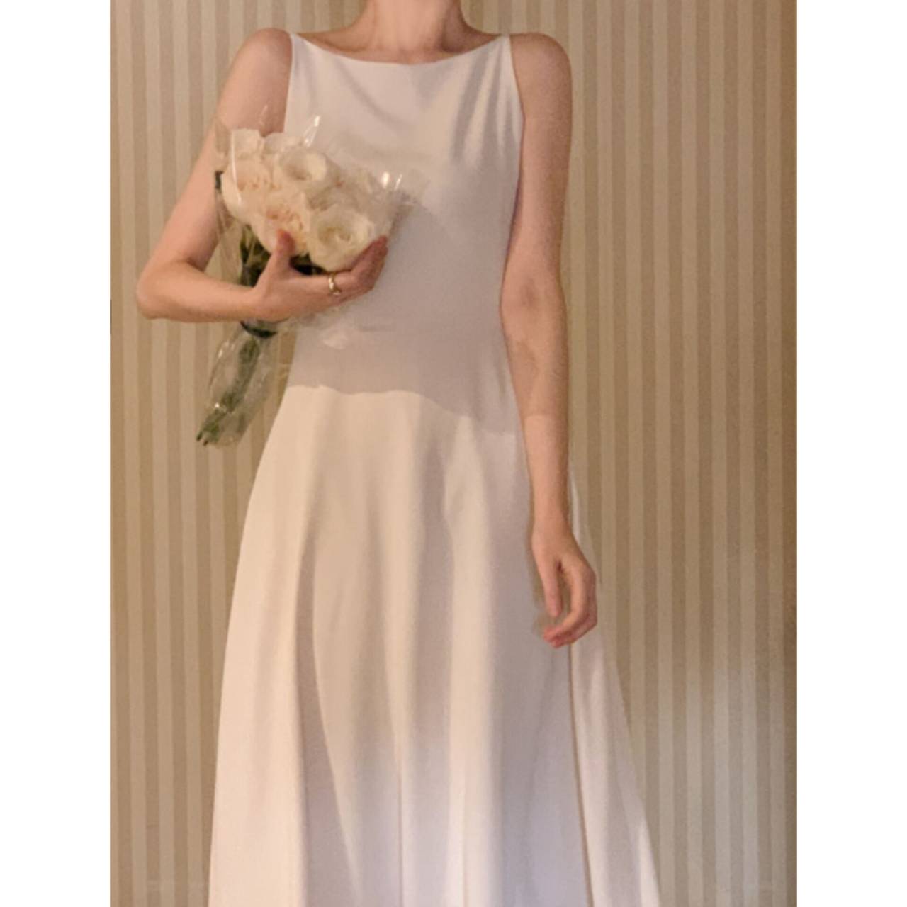 歩くたびに揺れるスカートラインは、写真でも動画でも美しく映え、特別な一日をより印象的に。背中はすっきりとしたバックスタイルで、後ろ姿まで抜かりなく。