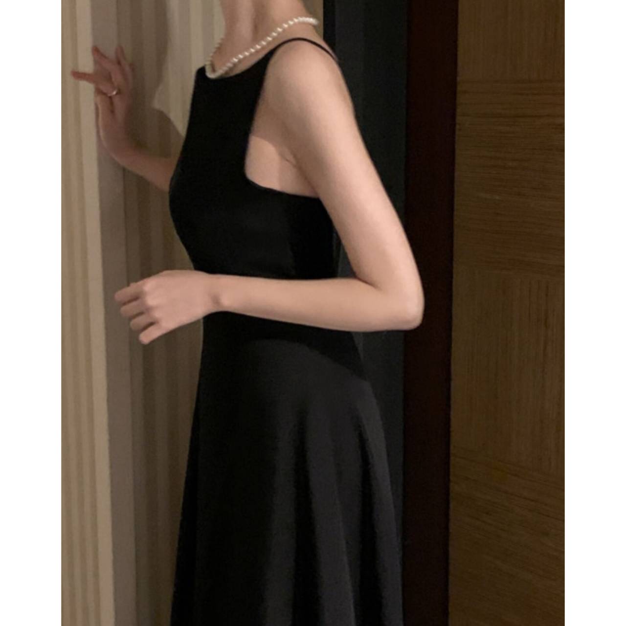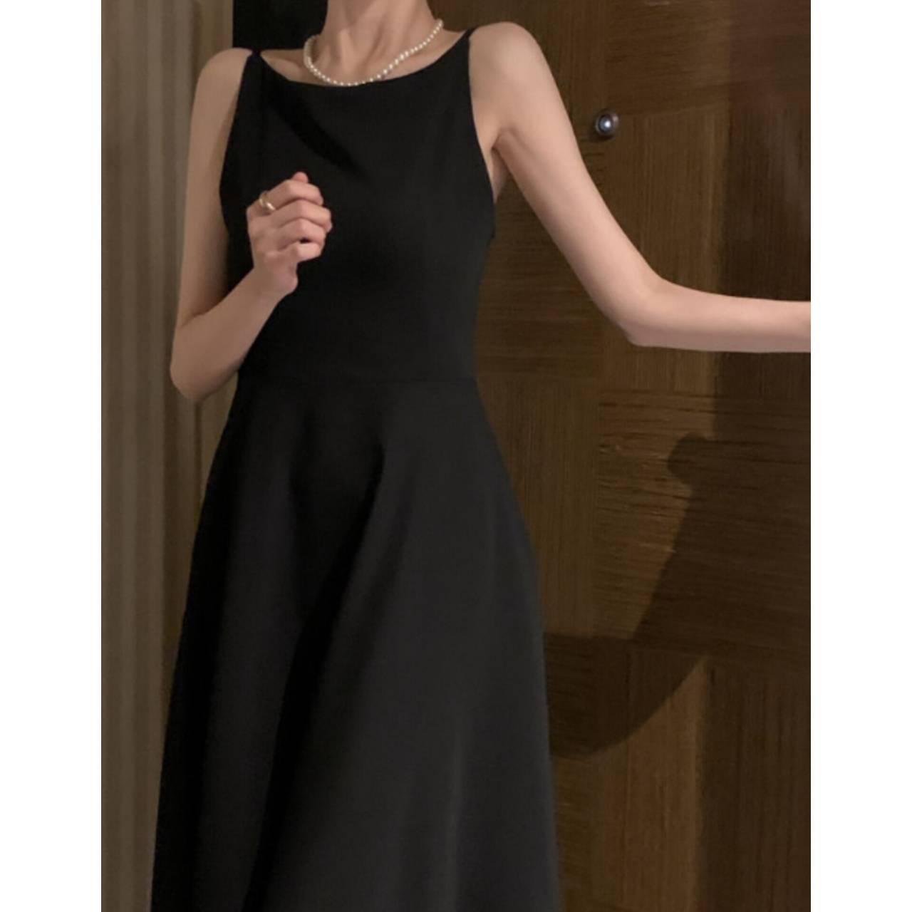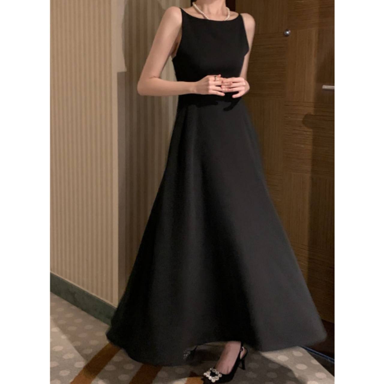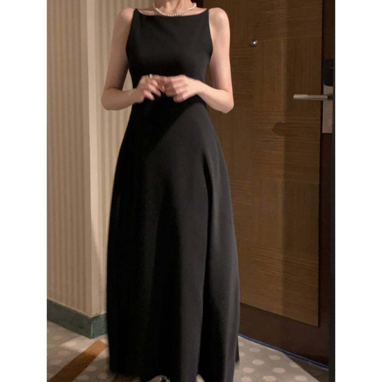 全3色 ワンピース ドレス 韓国ワンピース ワンピ キャミドレス ノースリーブ スパゲティストラップ ボートネック バックレス ハイウエスト フレア Aライン マキシ丈 ロング エレガント 体型カバー S/L 韓国【K7897】